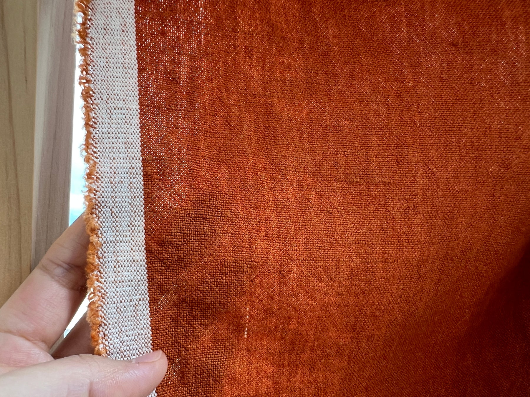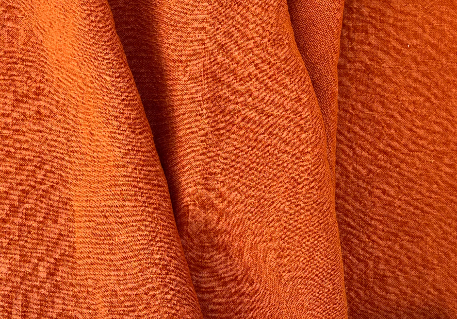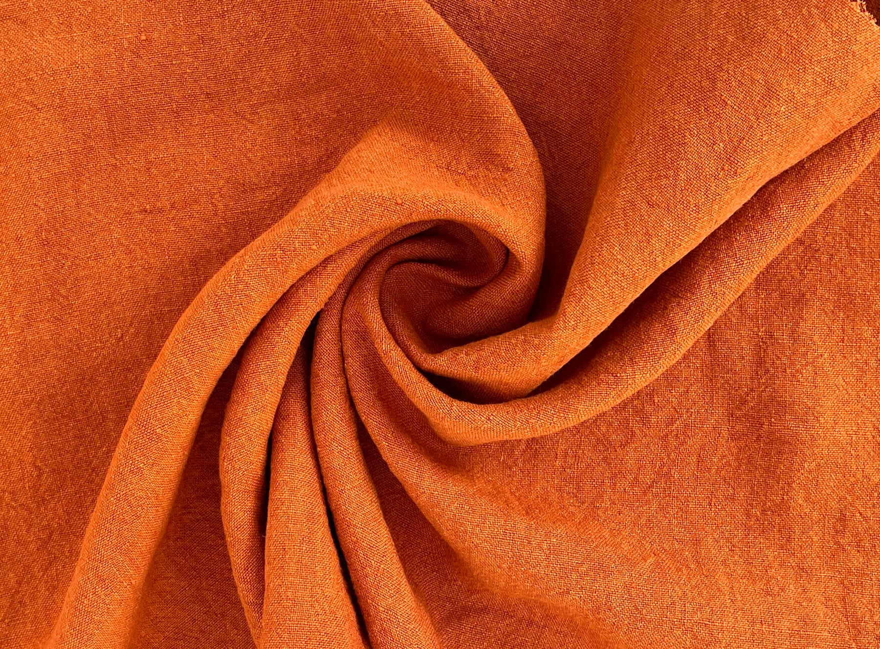 This 100% linen fabric showcases a vibrant yet refined two-tone orange effect, created by weaving deep orange warp yarns with lighter orange weft yarns. The result is a rich, dimensional color that feels lively but natural.