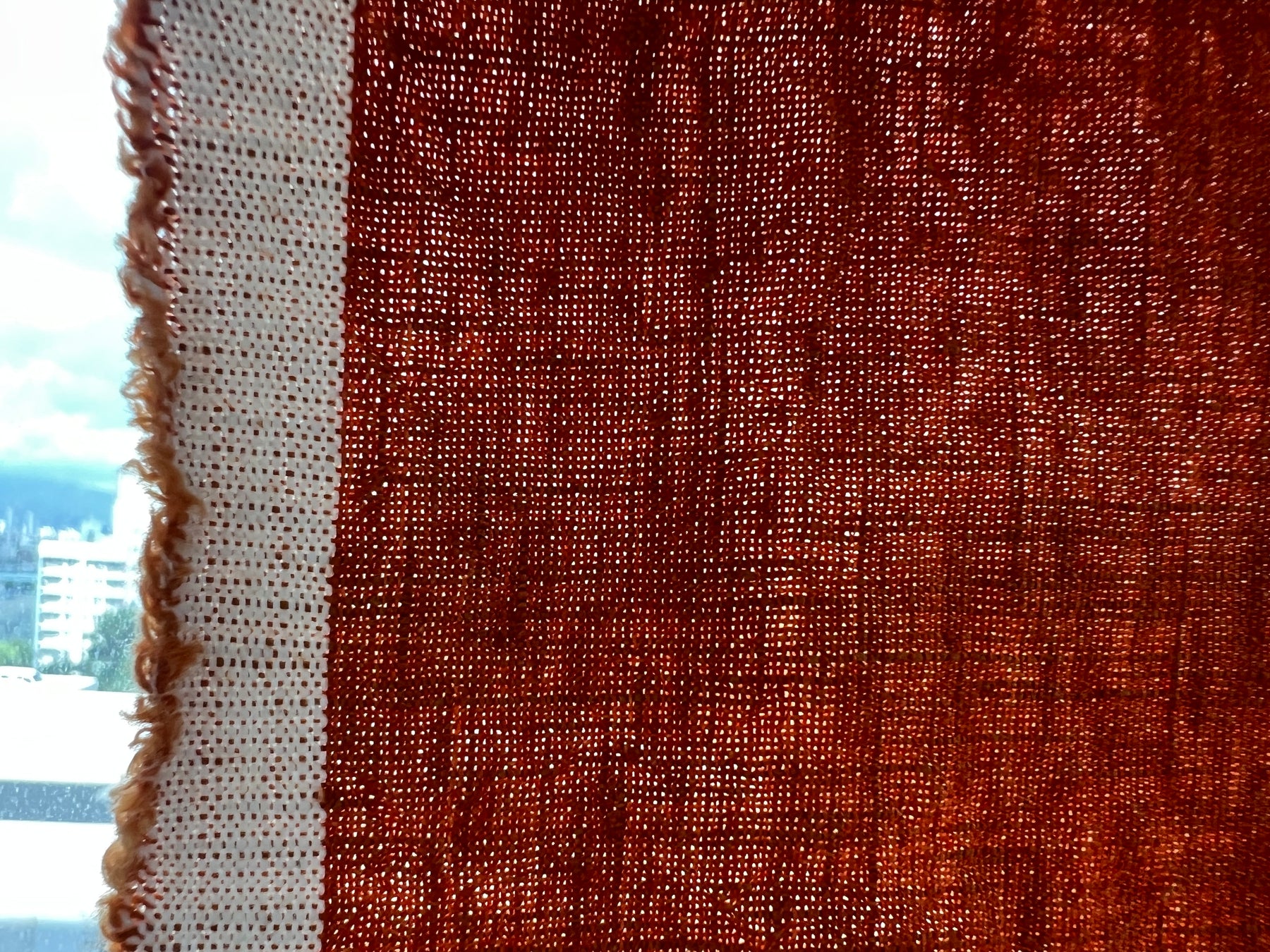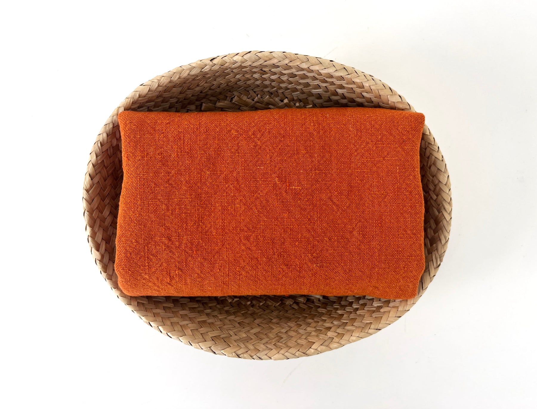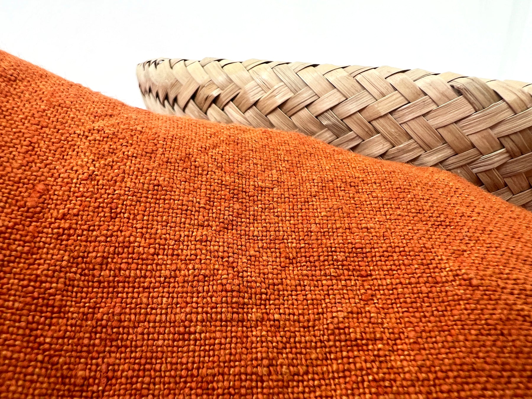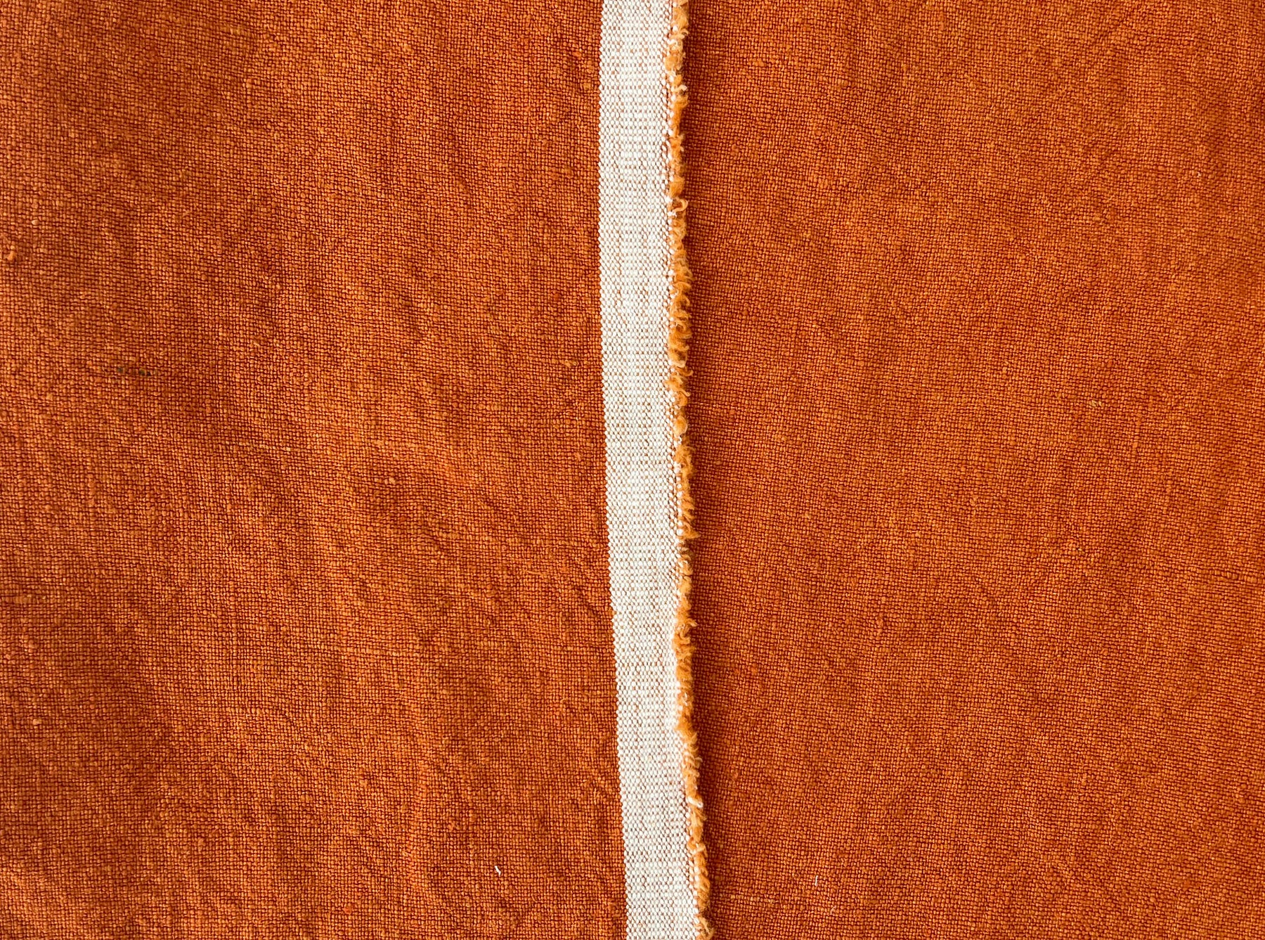 This 100% linen fabric showcases a vibrant yet refined two-tone orange effect, created by weaving deep orange warp yarns with lighter orange weft yarns. The result is a rich, dimensional color that feels lively but natural.