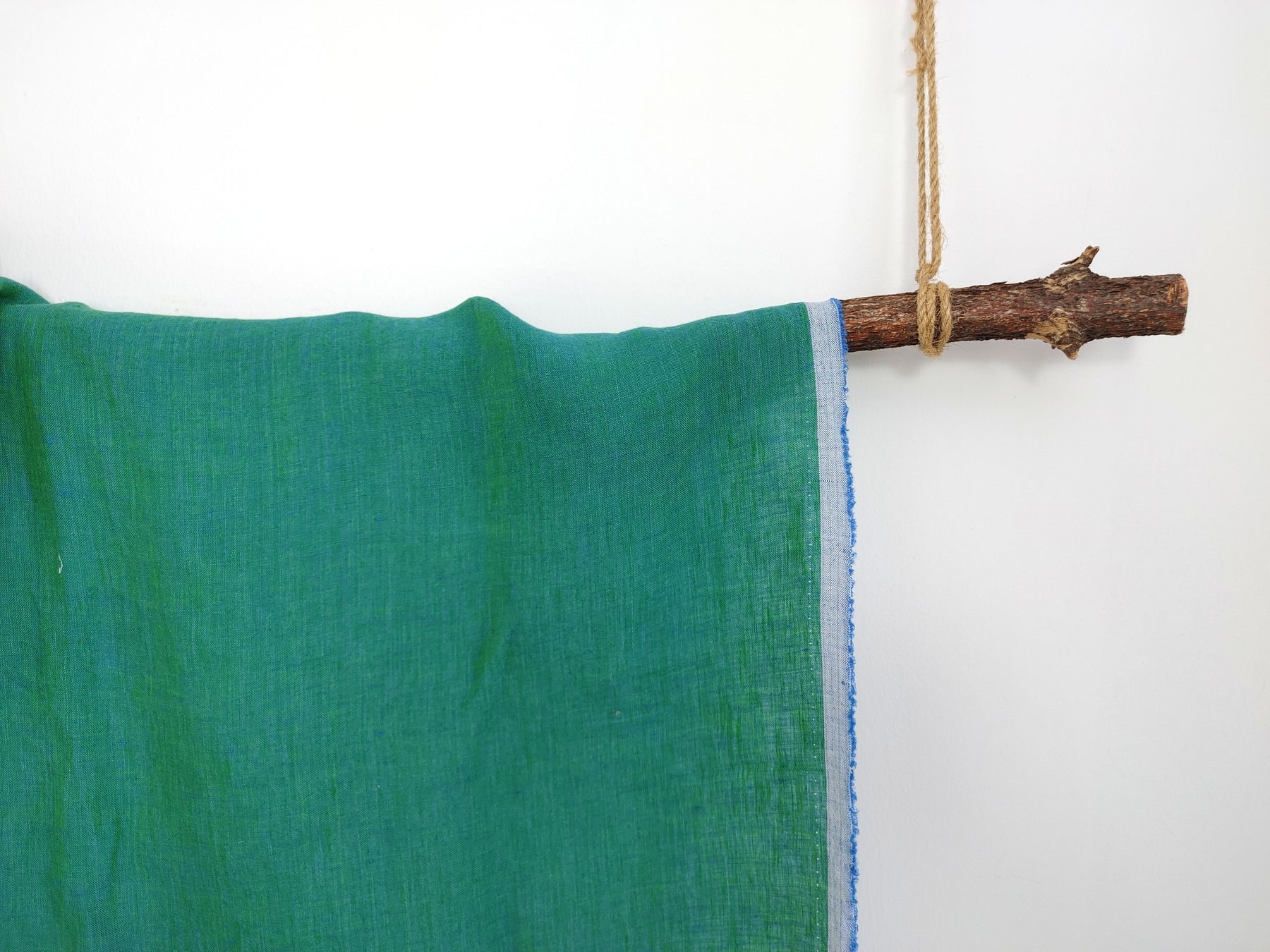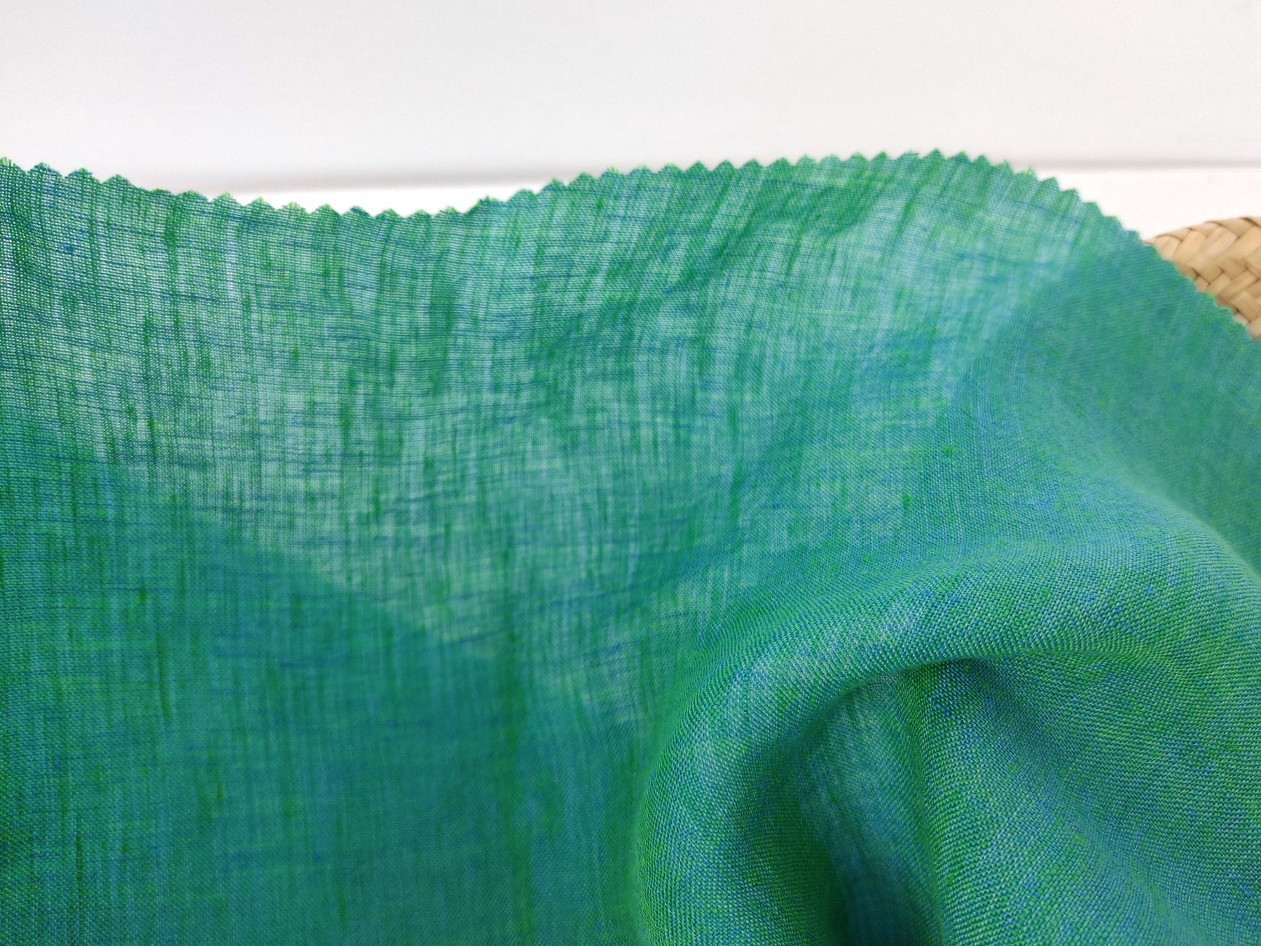This lightweight 100% linen fabric features a unique two-tone effect with a green warp and blue weft, creating a visually striking blend of colors. Made from 21s high-twist linen yarn, the fabric offers a soft yet crisp and cool feel, perfect for breathable, comfortable garments and light home décor. The combination of colors and texture makes it an excellent choice for projects that require a subtle yet elegant touch.