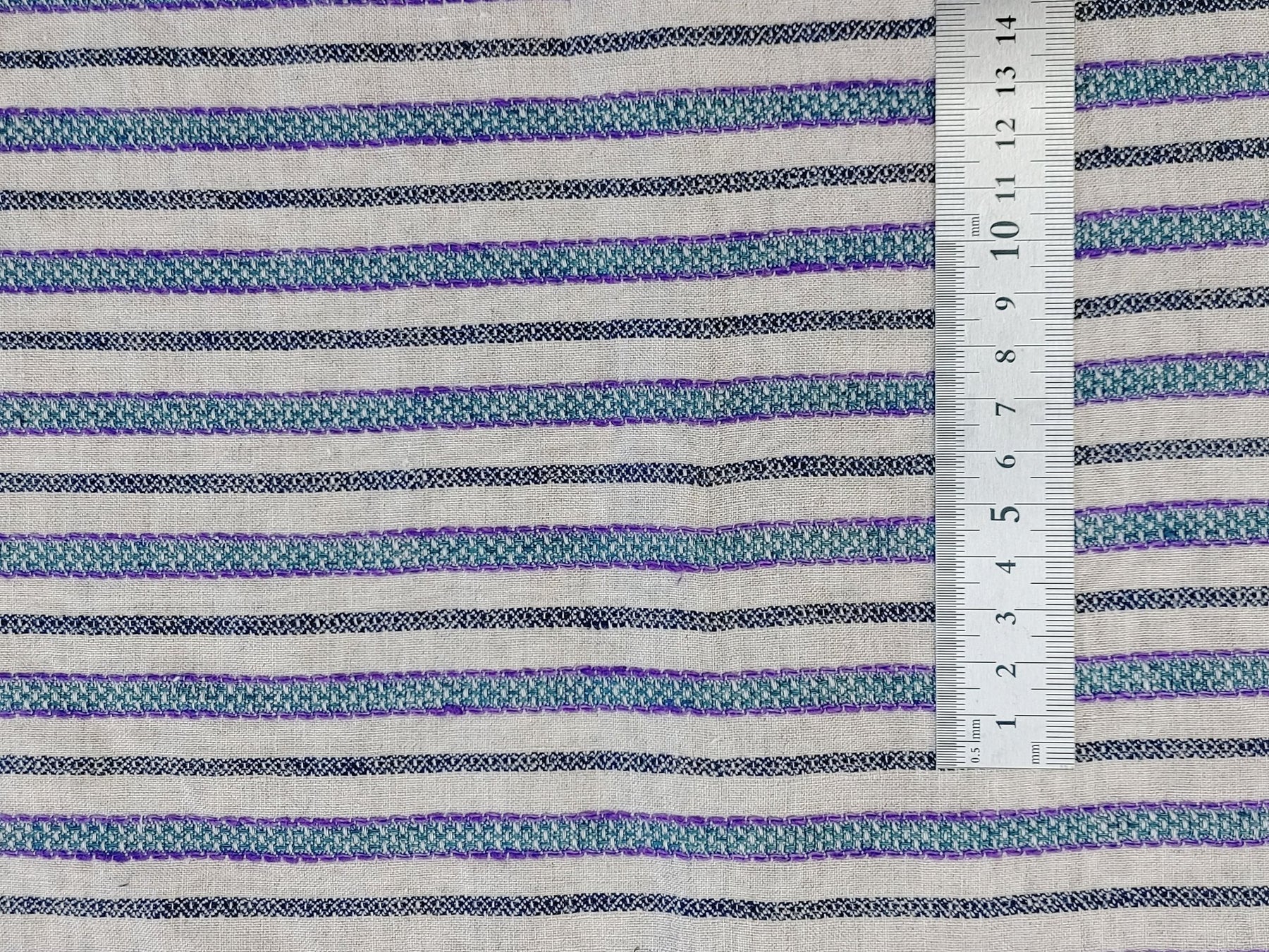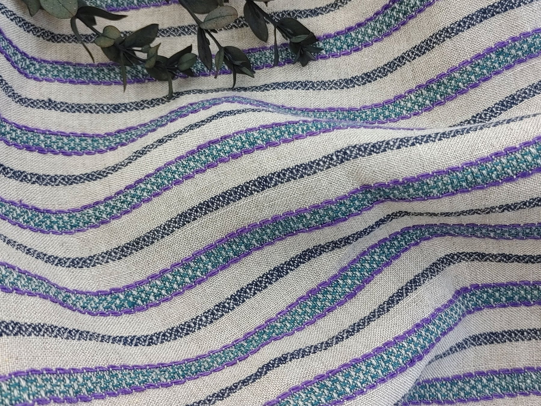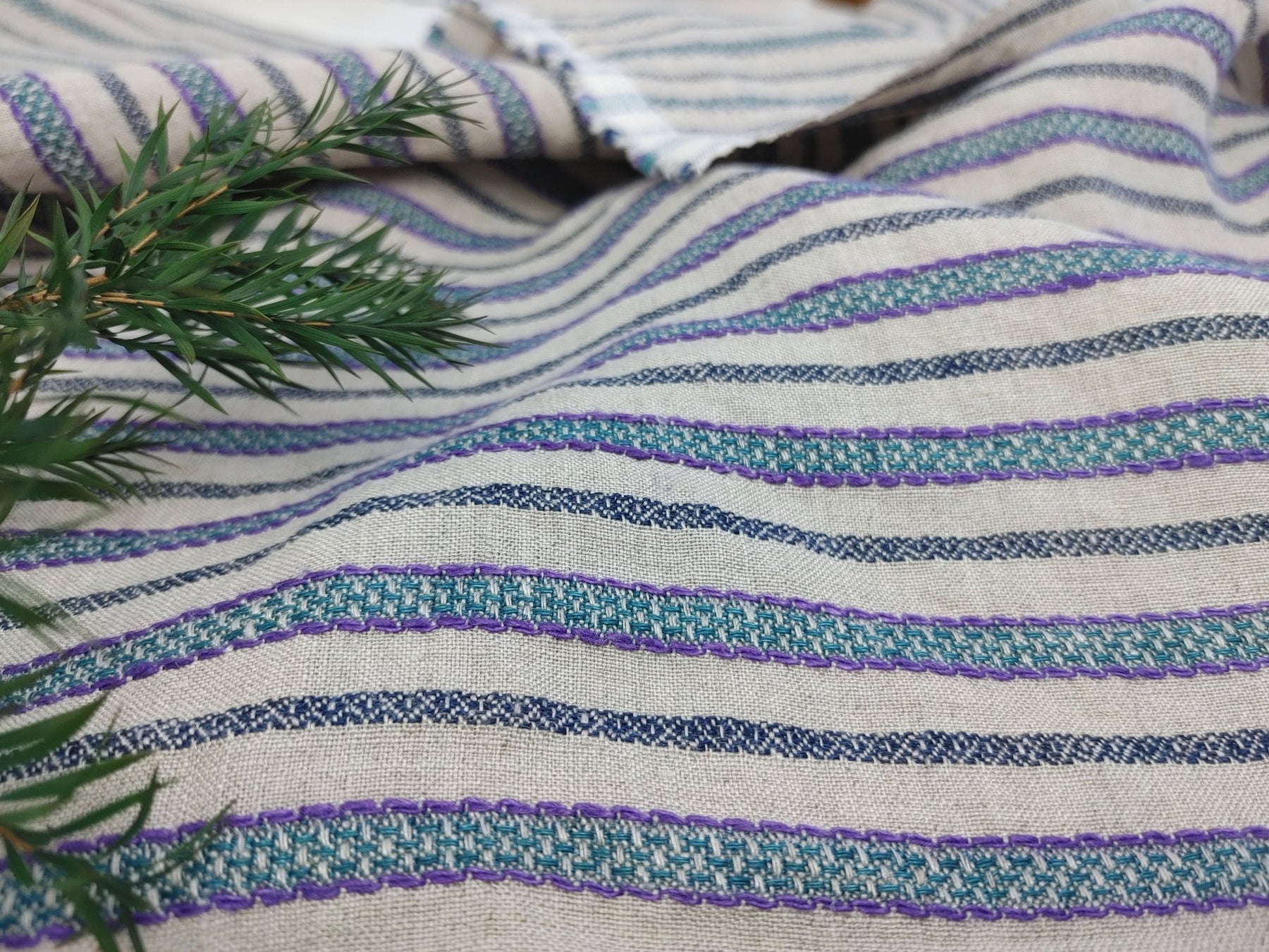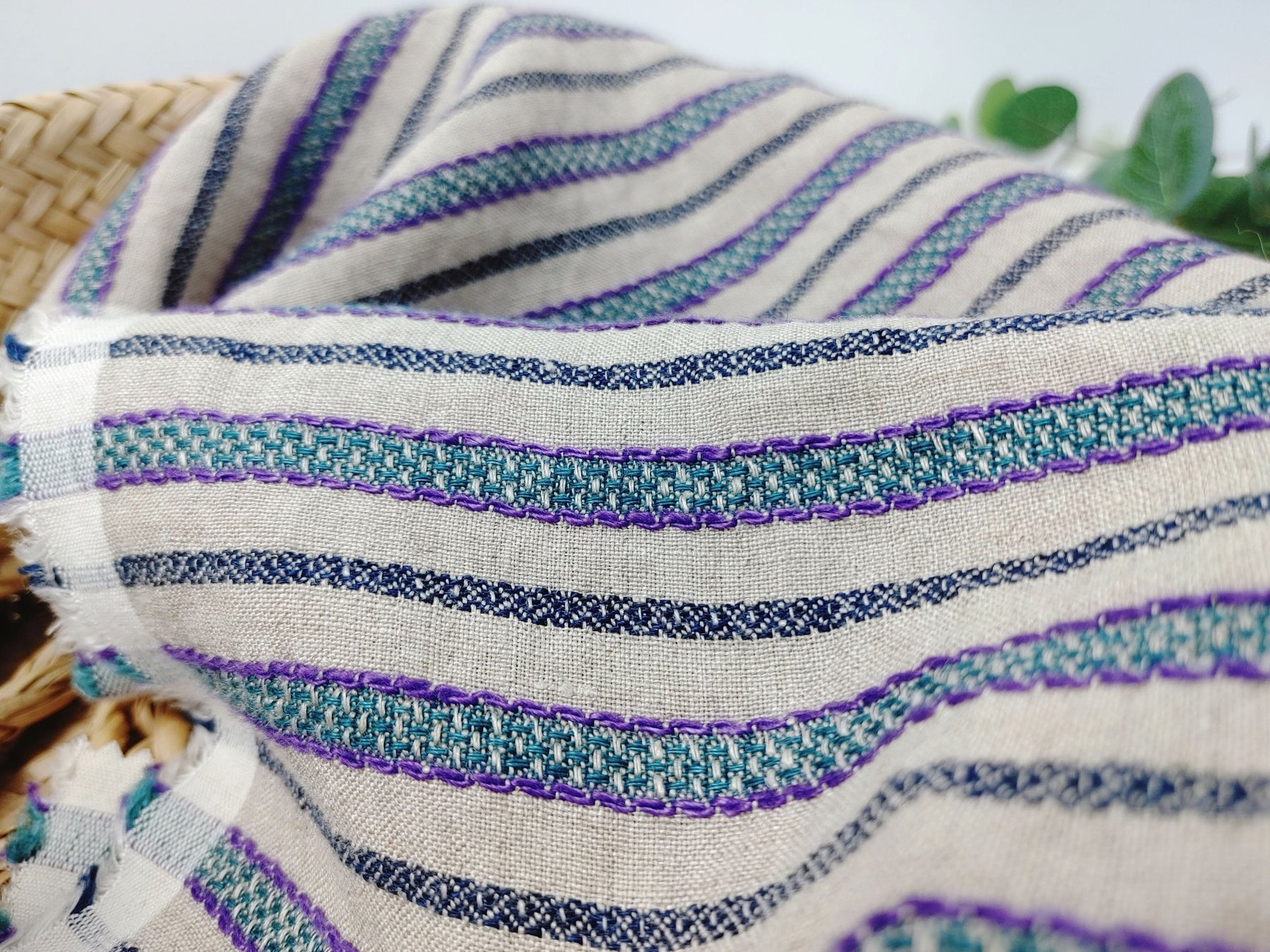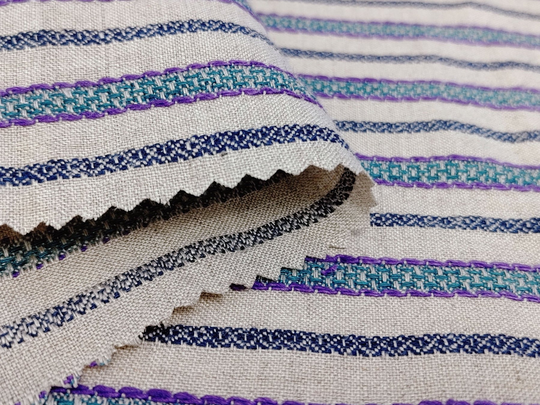 Step into sophistication with our Jacquard-woven linen fabric featuring a captivating horizontal stripe pattern. This fabric is a testament to craftsmanship, employing four distinct weaving structures to create a truly unique and special texture. The natural base color provides a subtle backdrop, allowing the vibrant stripes in green, violet, and navy to take center stage.