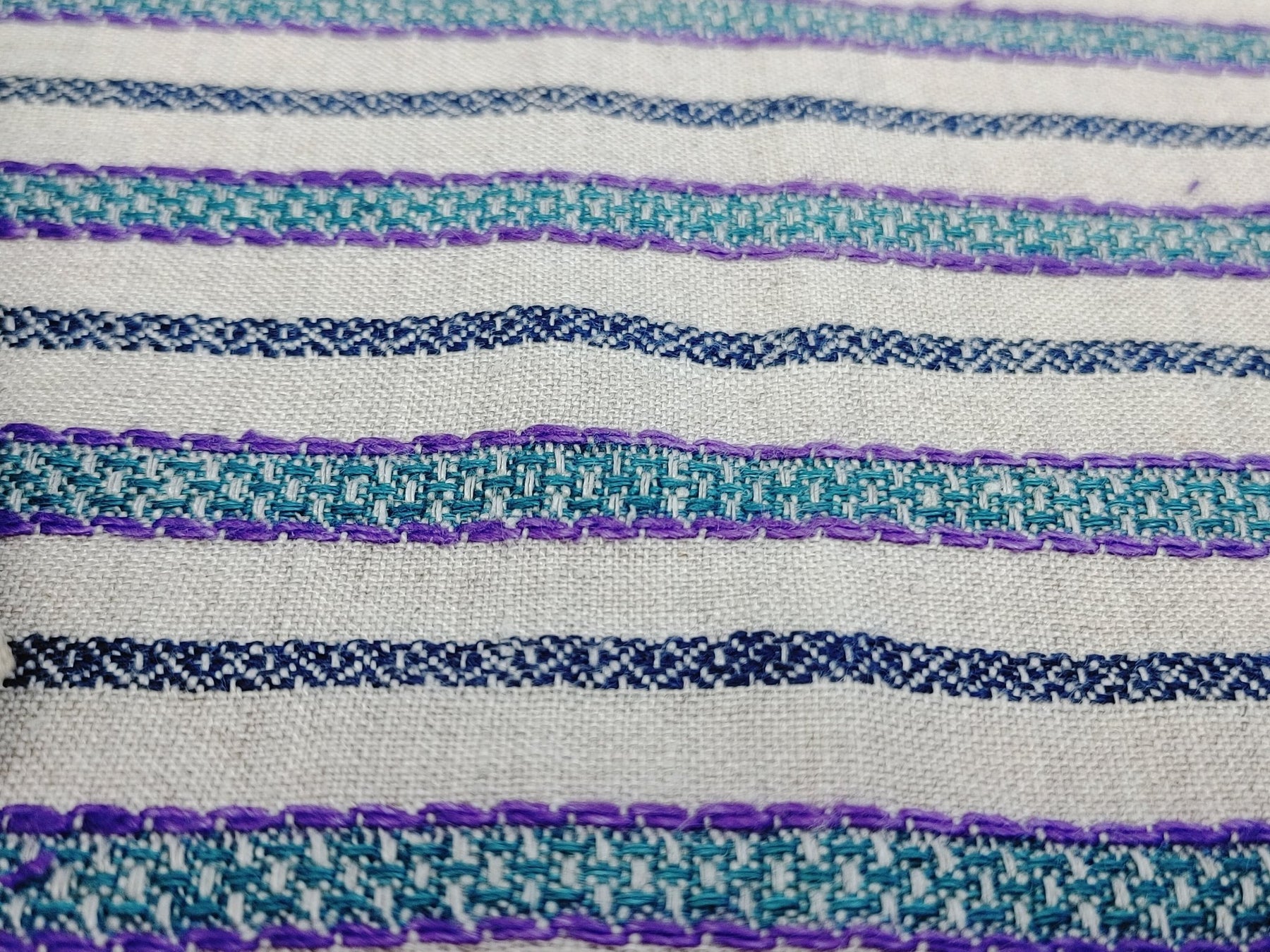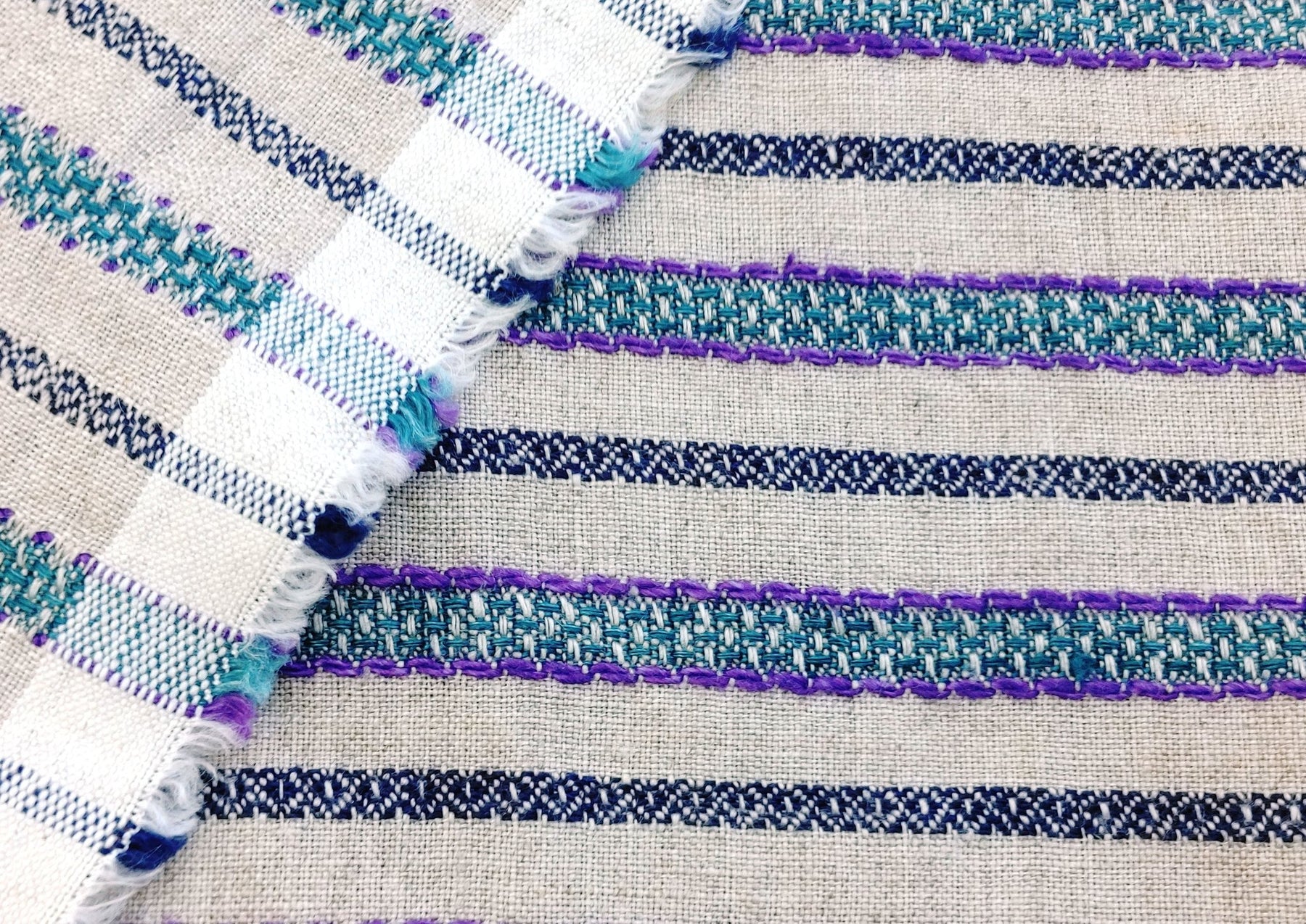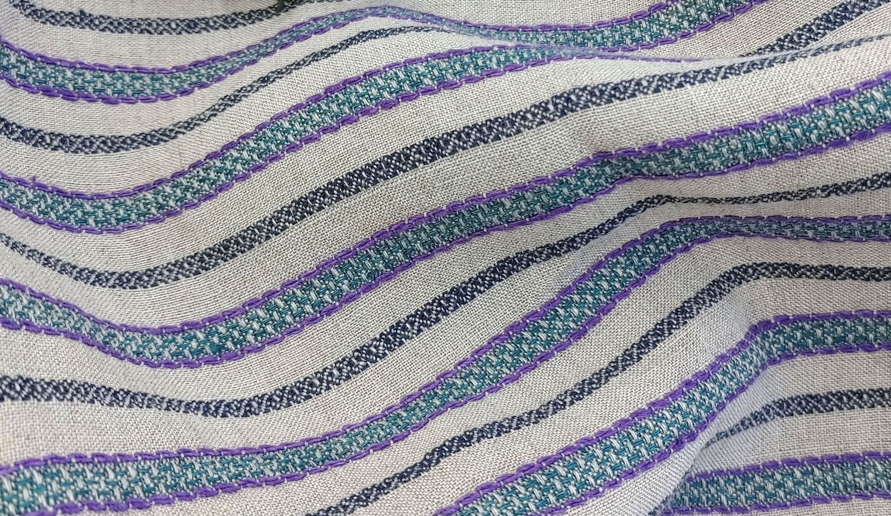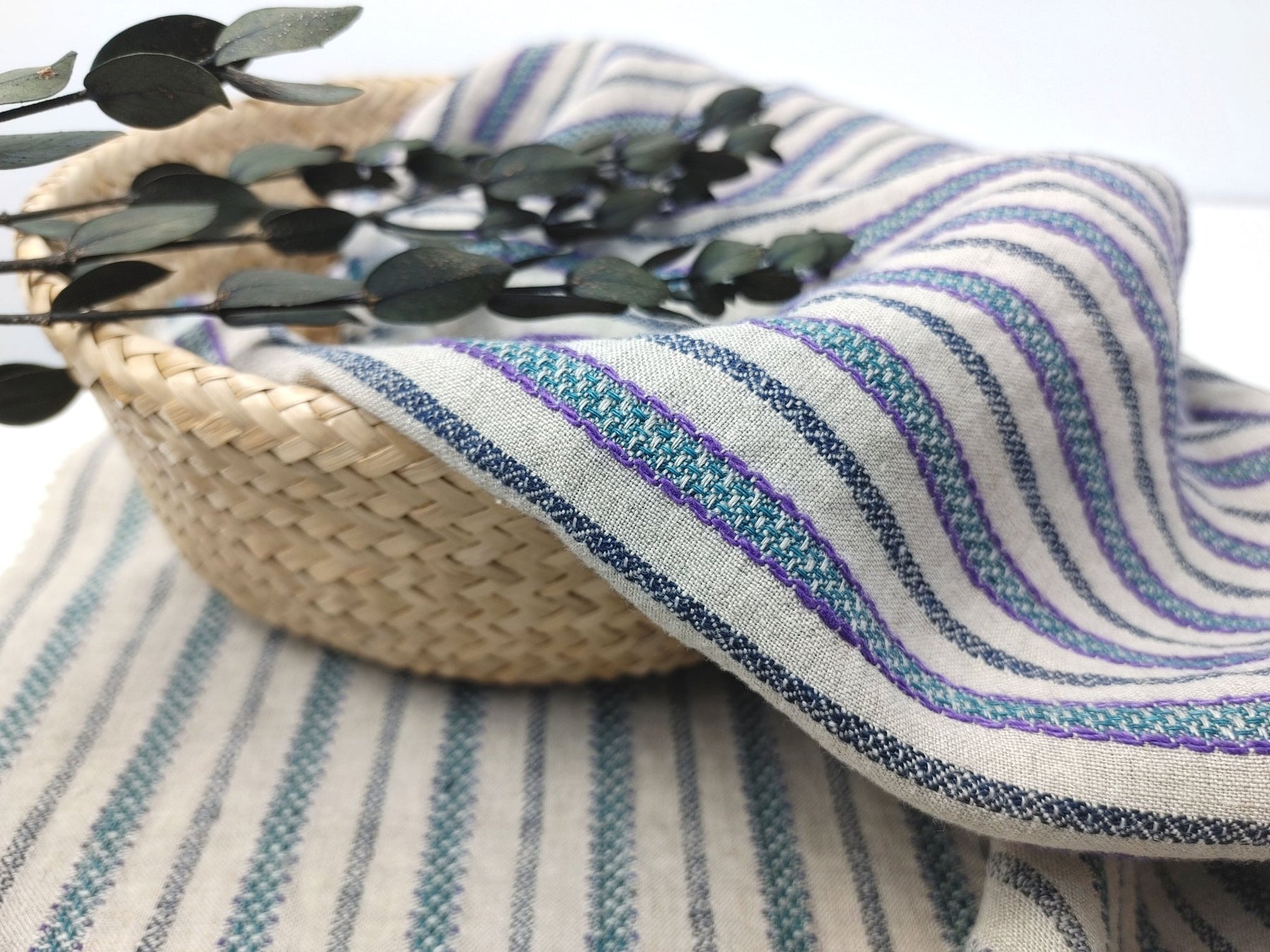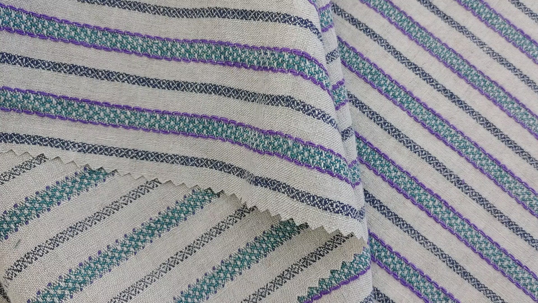 Step into sophistication with our Jacquard-woven linen fabric featuring a captivating horizontal stripe pattern. This fabric is a testament to craftsmanship, employing four distinct weaving structures to create a truly unique and special texture. The natural base color provides a subtle backdrop, allowing the vibrant stripes in green, violet, and navy to take center stage.