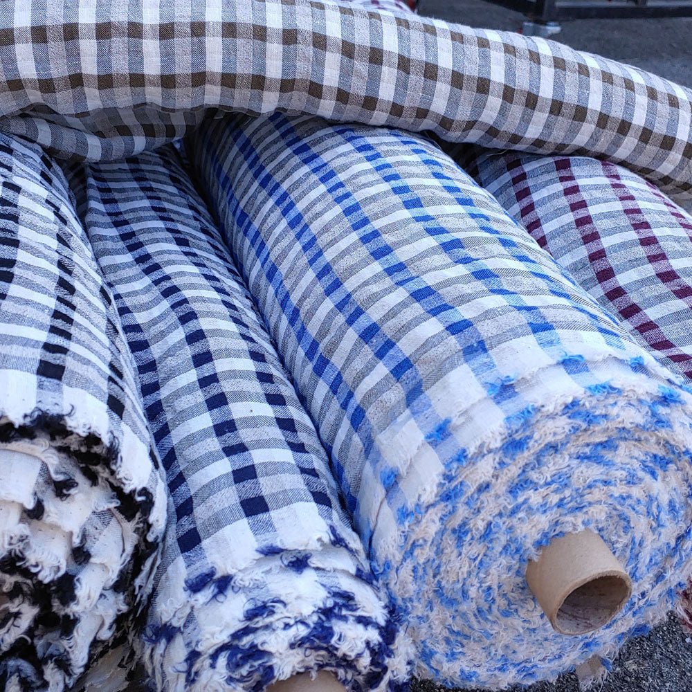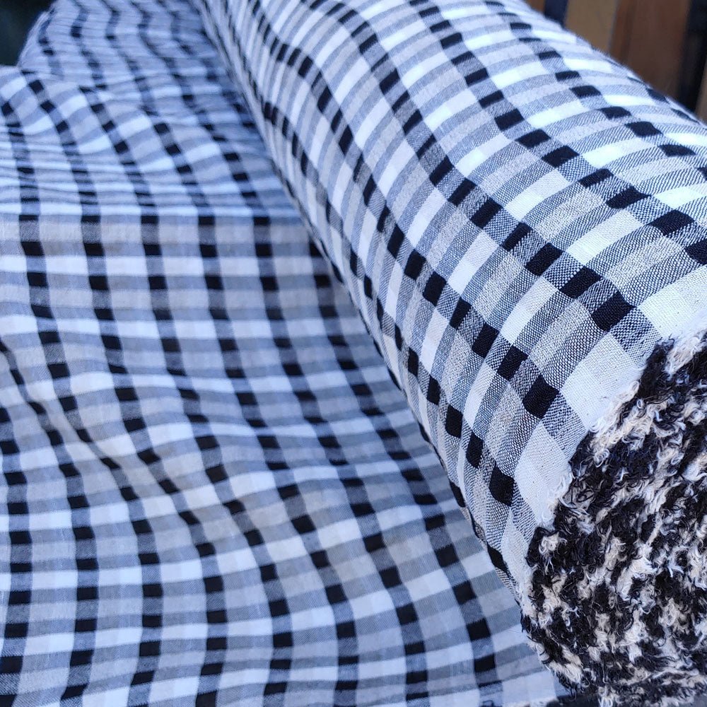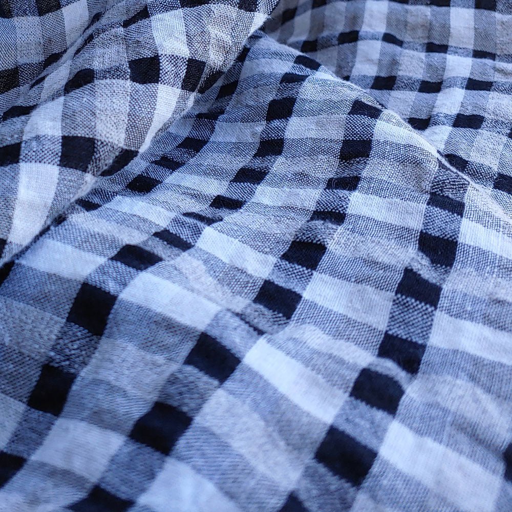 The 8% rayon gives the fabric a thin, high-twisted look, while the 2% polyester is twisted in with the linen yarn. These advanced techniques help create a fabric with unique features, such as natural seersucker effect and a cool, crisp feeling. This fabric is ideal for shirts and dresses.