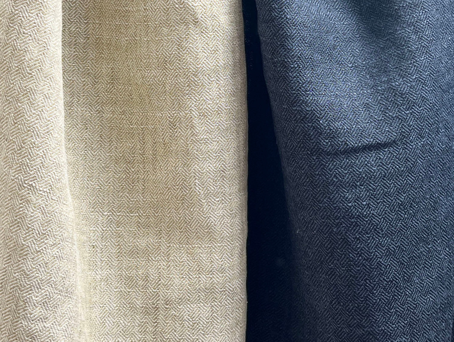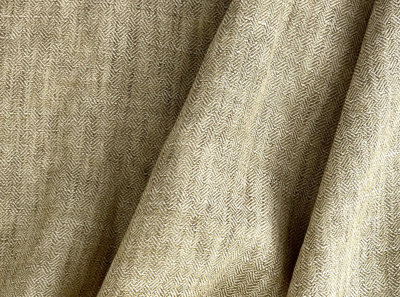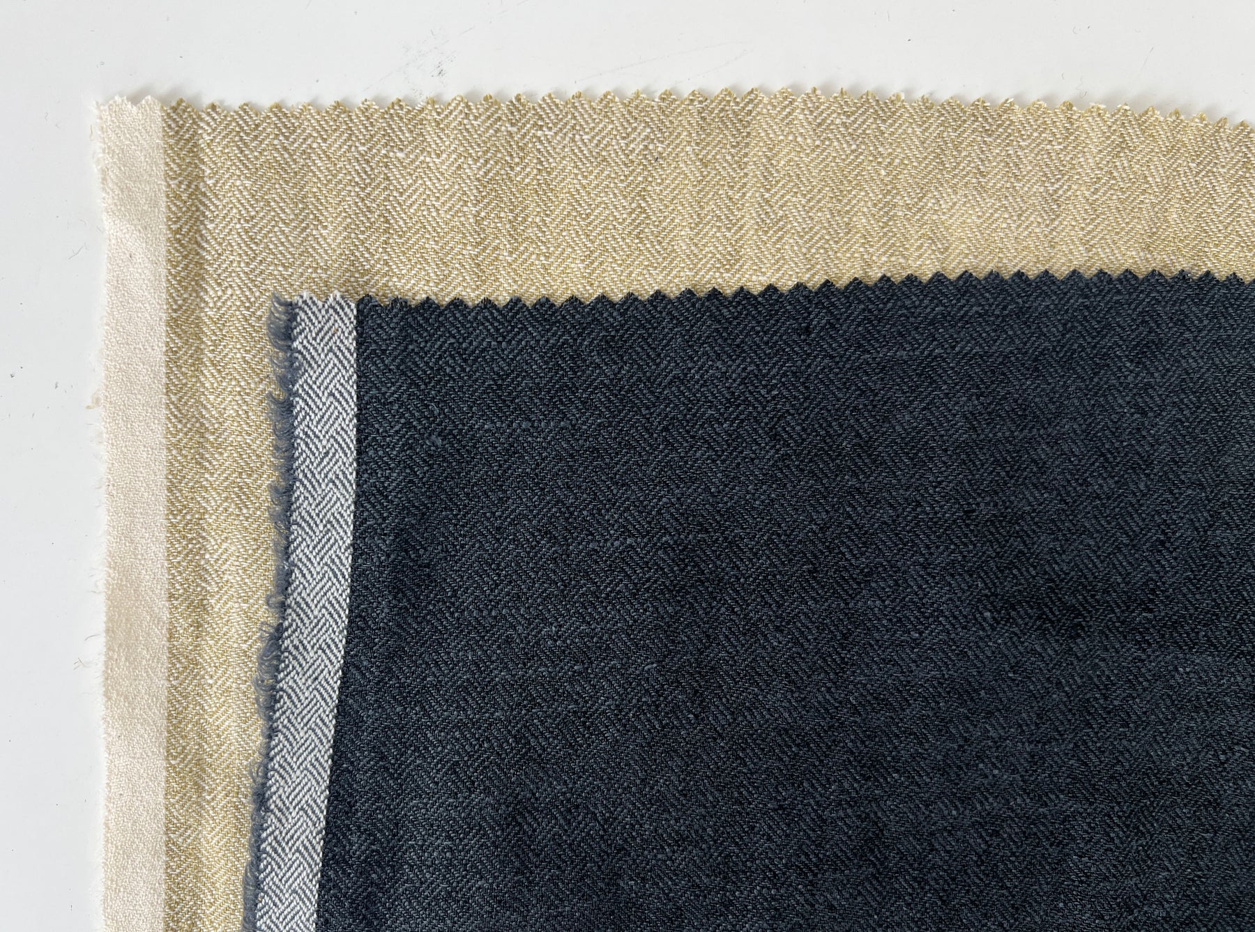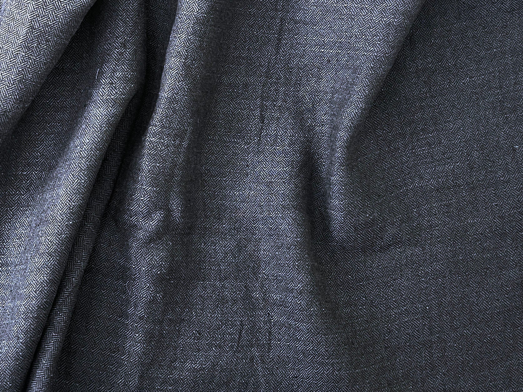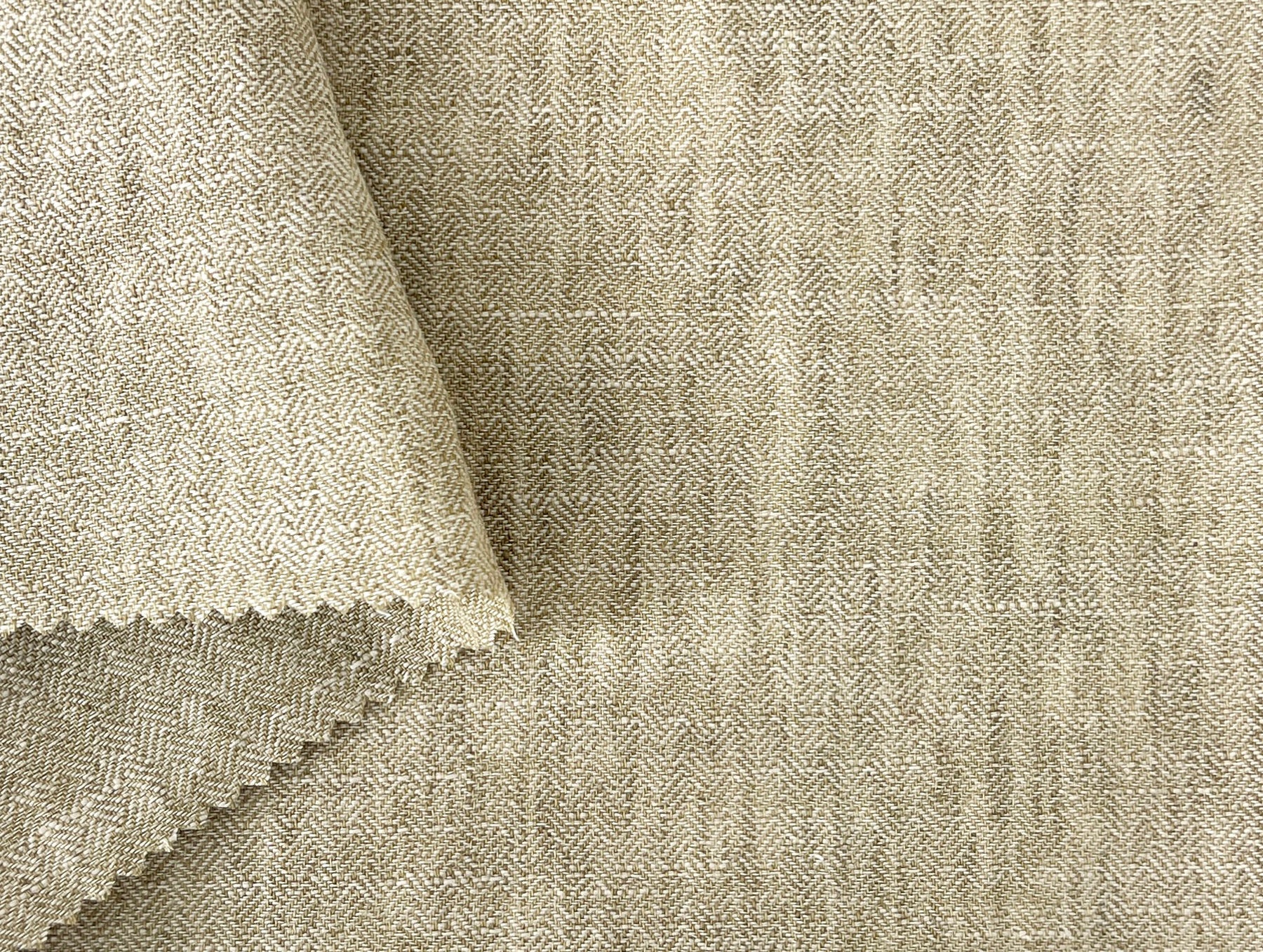 This linen–ramie–cotton blend fabric features a unique broken herringbone weave, a variation of the classic herringbone pattern. The warp and weft are woven in different colors, creating a subtle chambray two-tone effect with added depth and texture.
