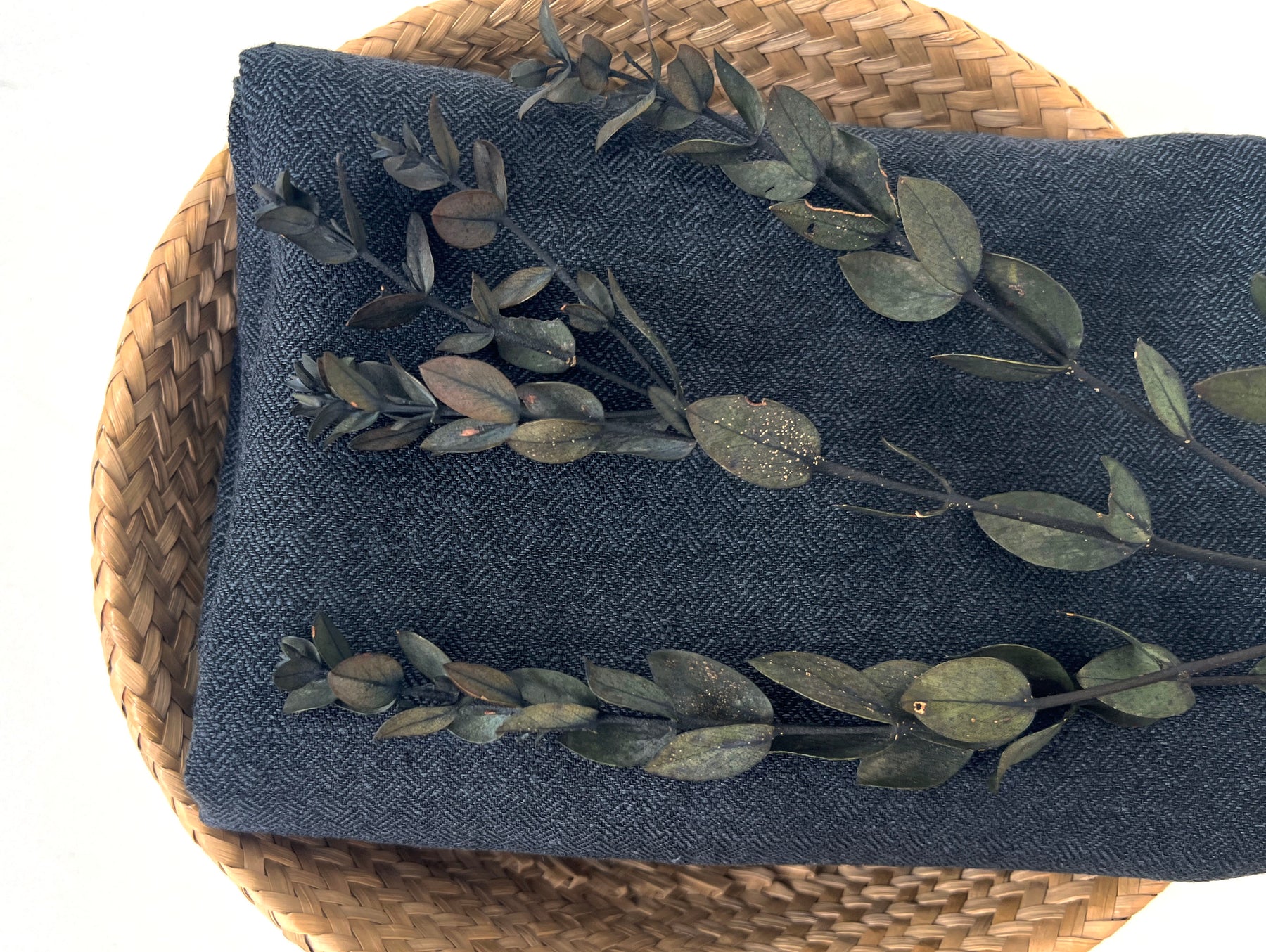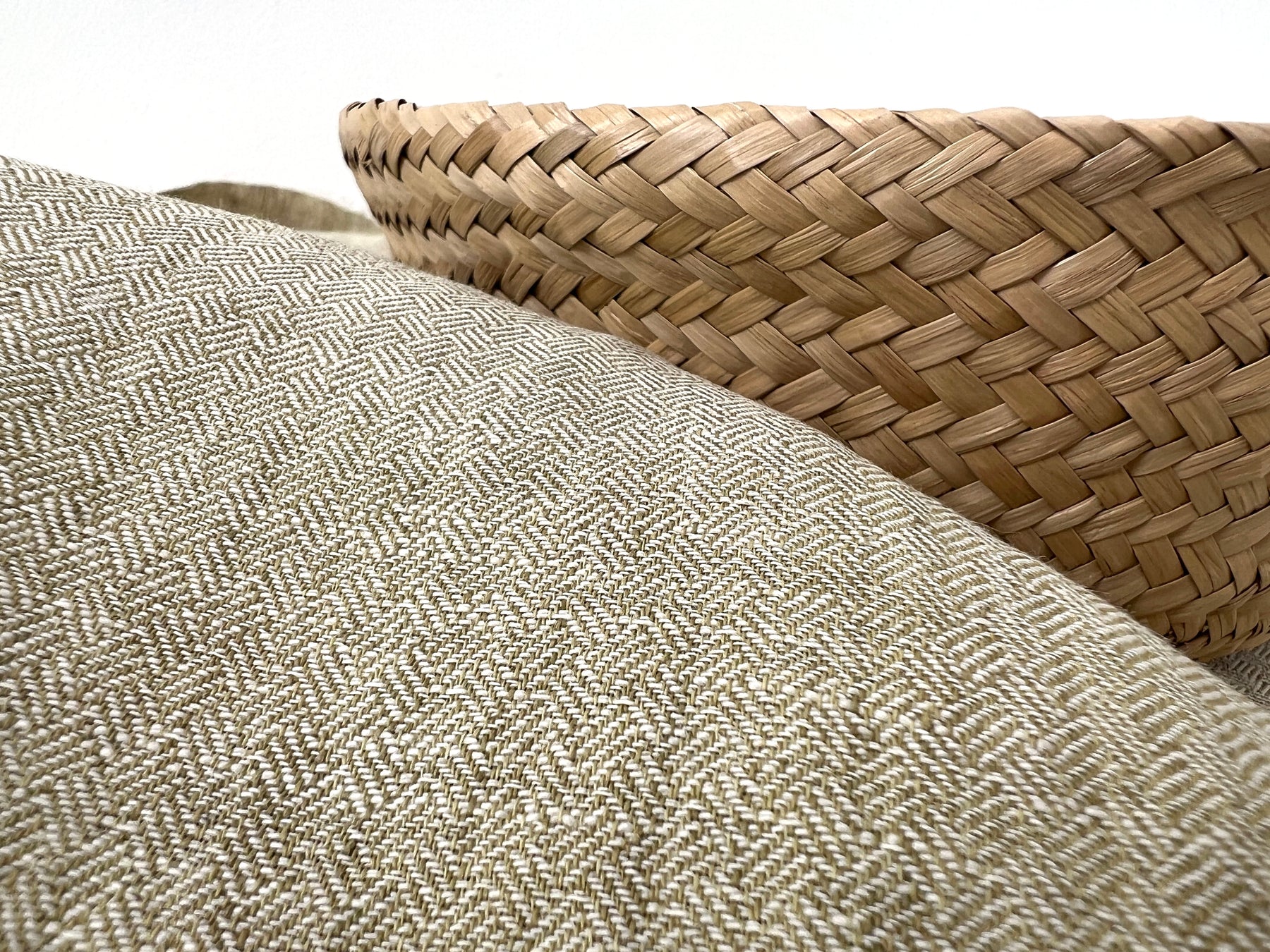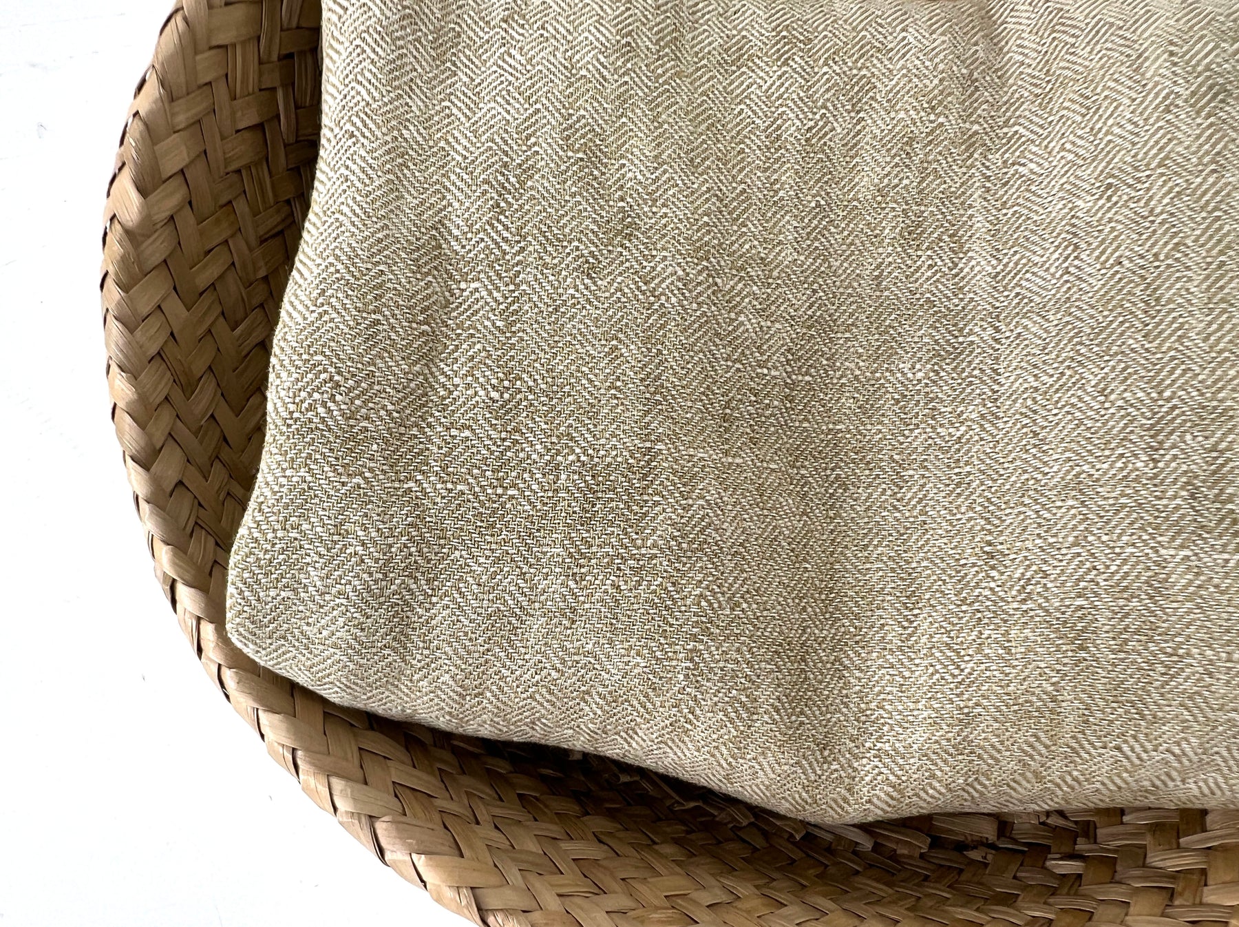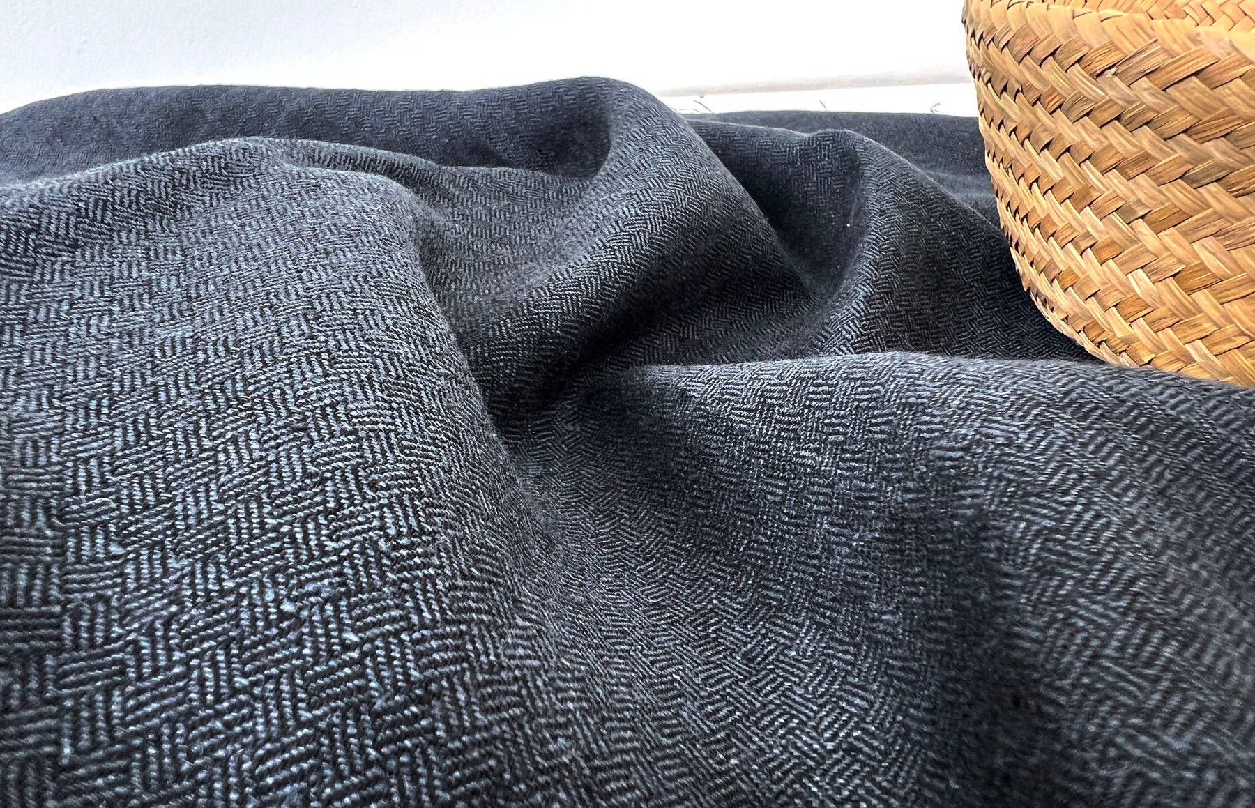 This linen–ramie–cotton blend fabric features a unique broken herringbone weave, a variation of the classic herringbone pattern. The warp and weft are woven in different colors, creating a subtle chambray two-tone effect with added depth and texture.