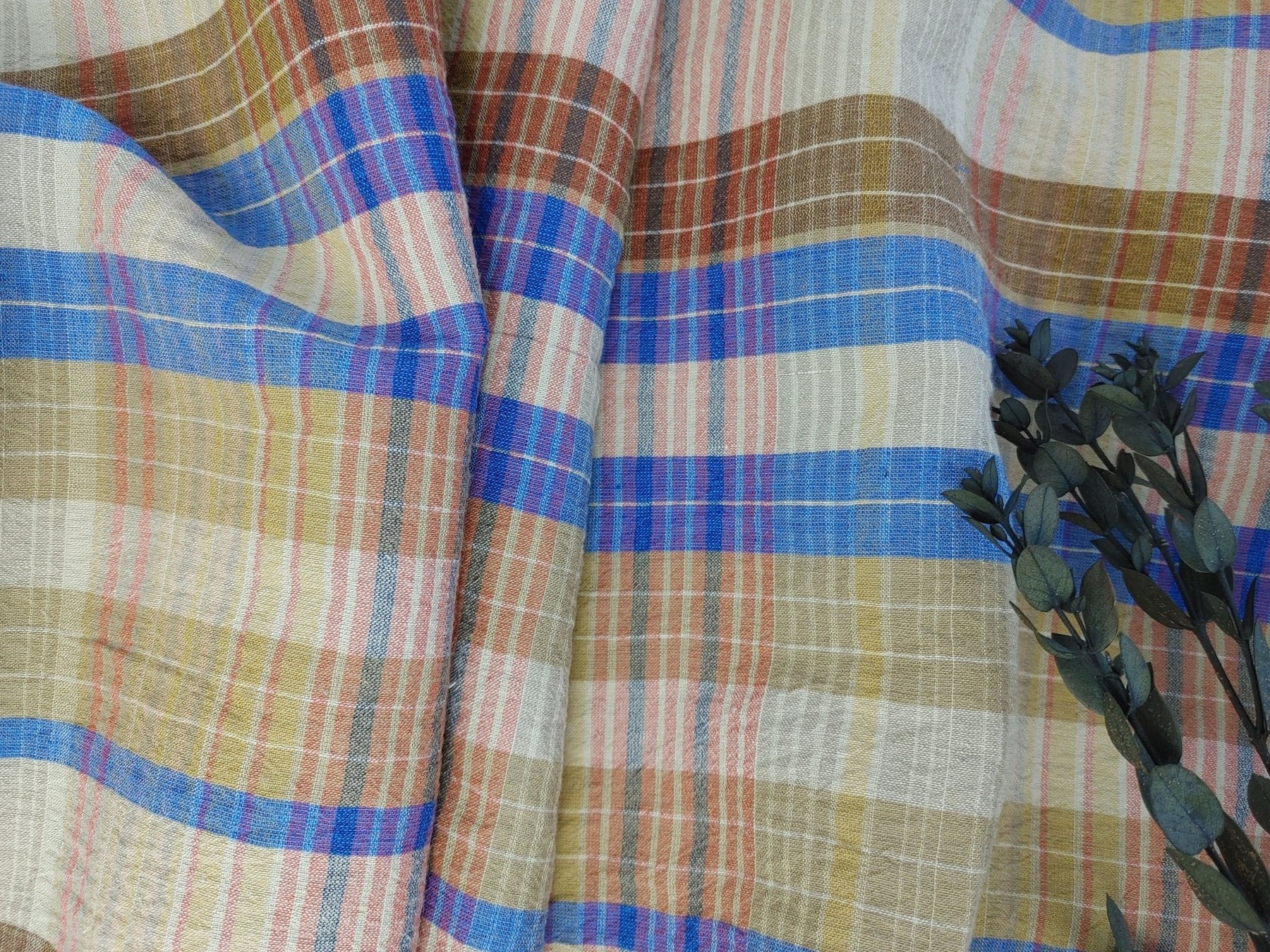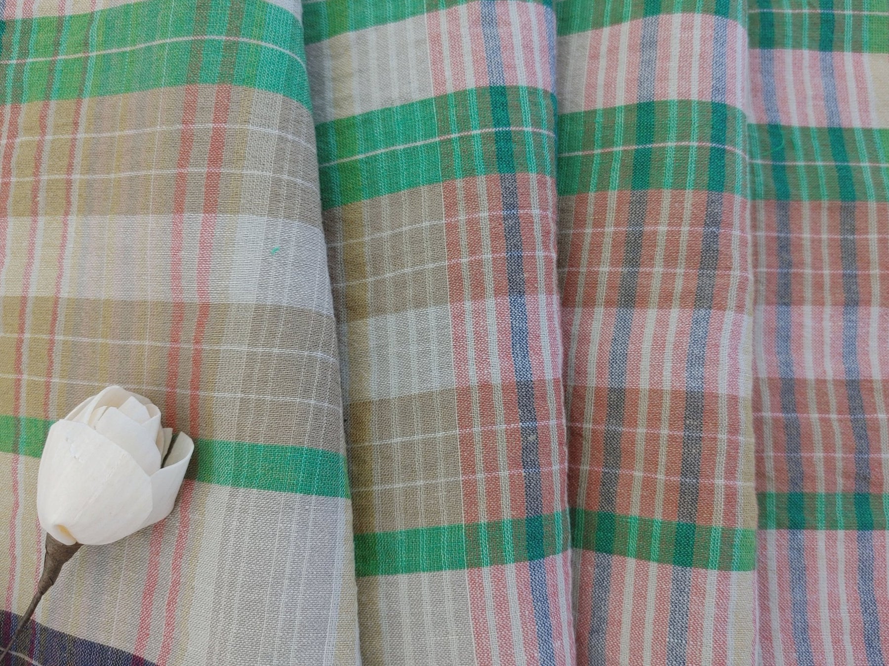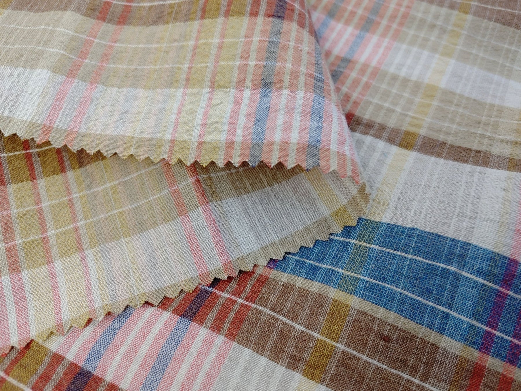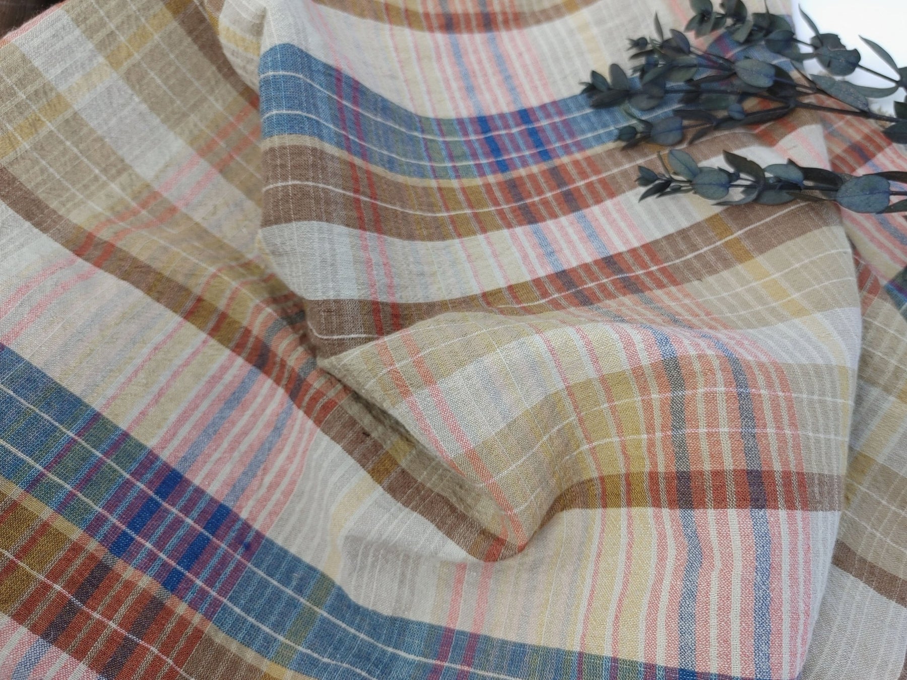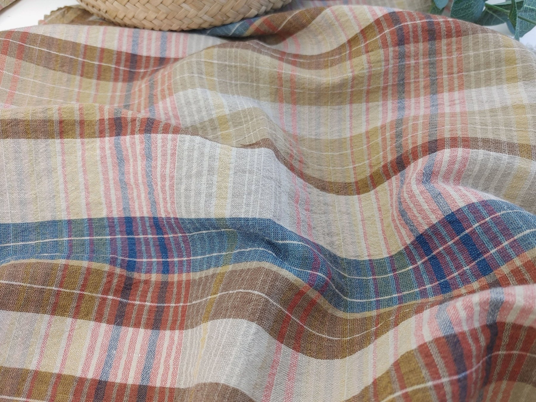 Introducing our "Linen Cotton PU Plaid Fabric with Subtle Wrinkle Charm." This fabric combines the natural feel of 35% linen and 64% cotton with a touch of 1% polyurethane for a gentle wrinkle effect. Weighing in at 110 g/sqm (3.25 oz per square yard) and measuring 56 inches (142 cm) wide, it's a lightweight and versatile choice. The pre-washed fabric offers a soft handfeel, and with a slight elasticity, it's perfect for creating comfortable, everyday pieces with style.