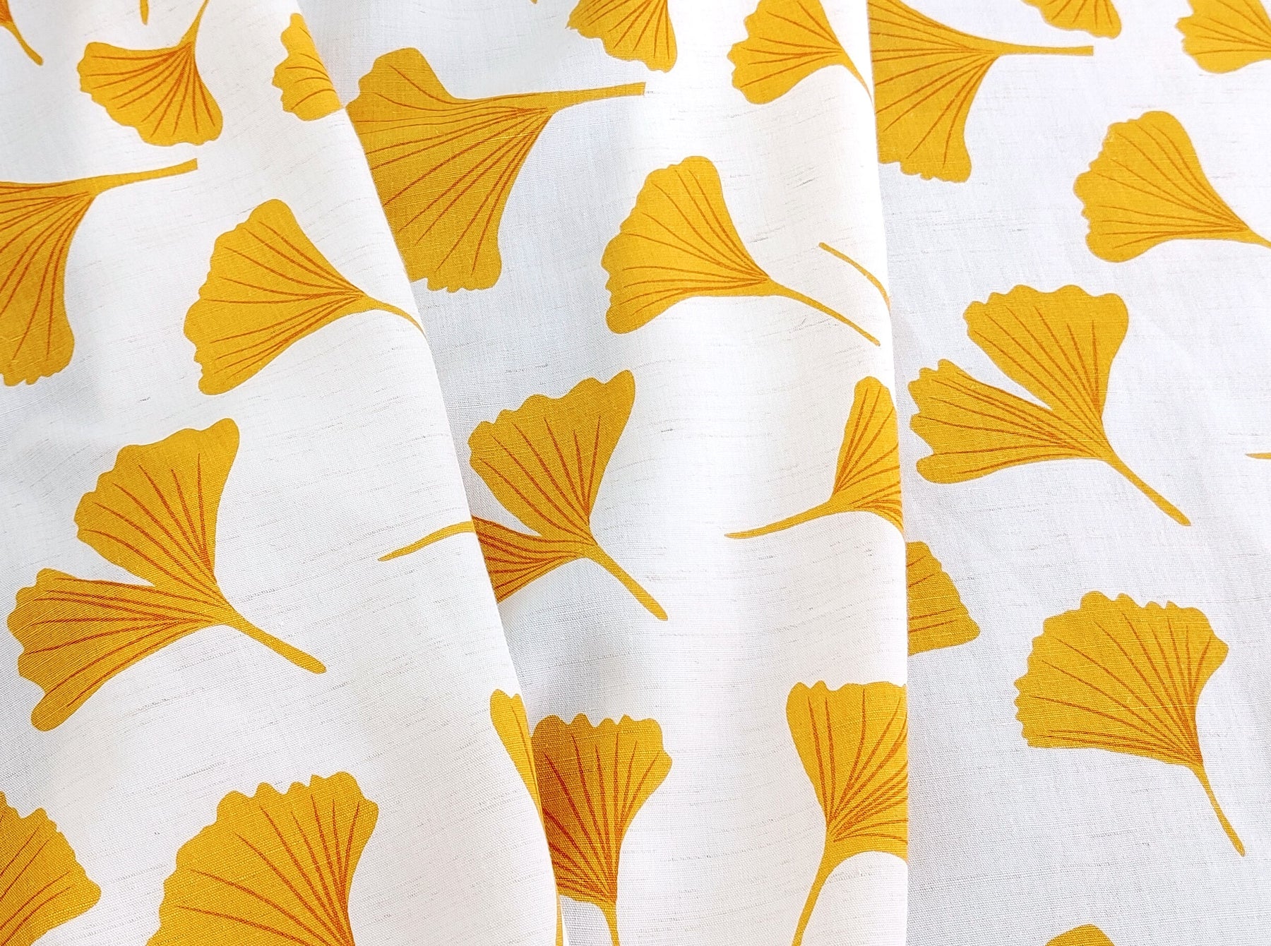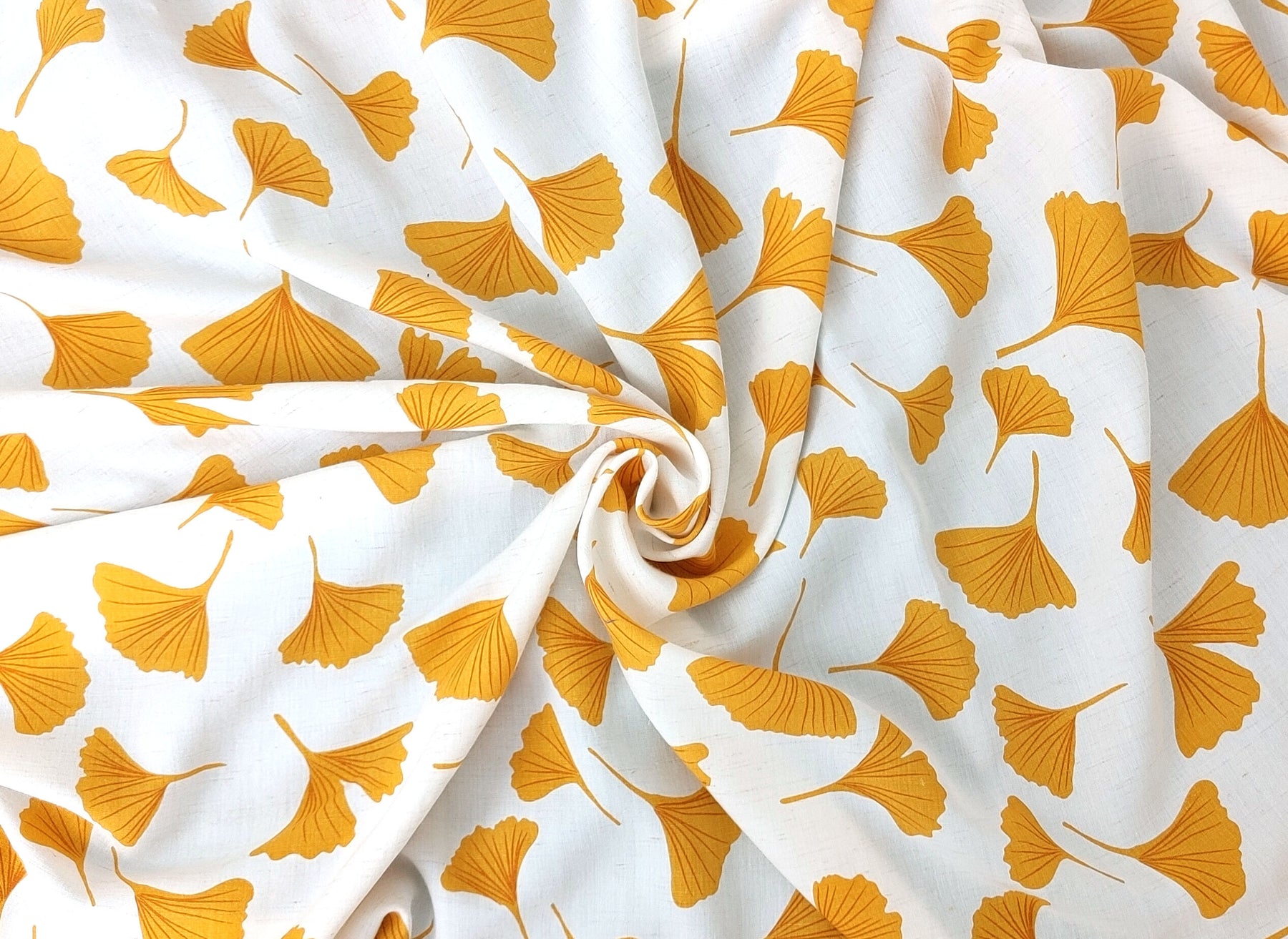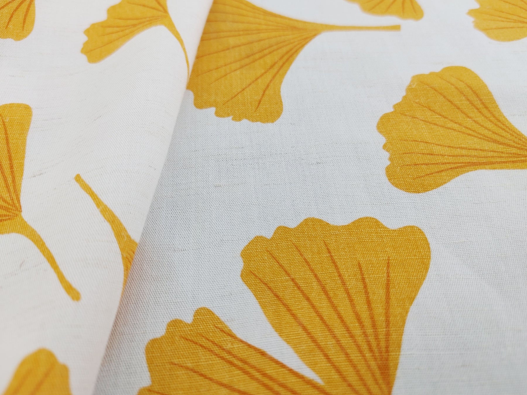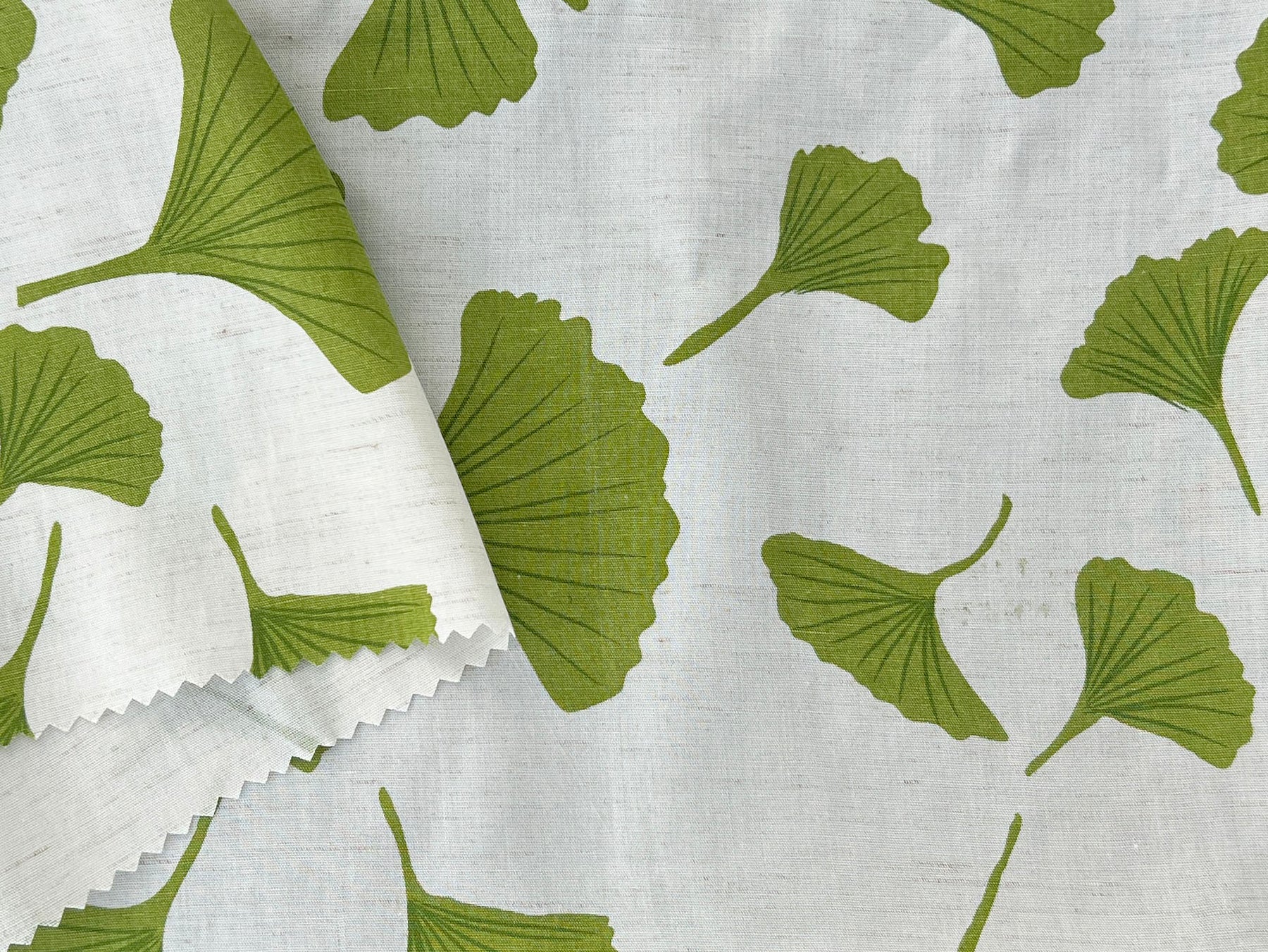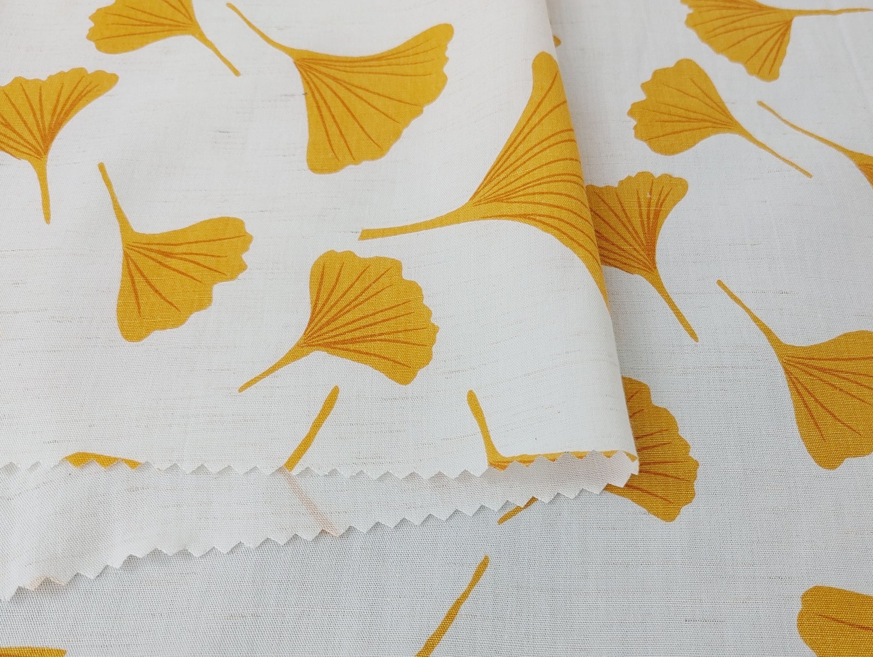 Enhance your sewing projects with our ginkgo Leaf Soft Linen Rayon Fabric. This fabric features a beautiful ginkgo leaf print and is composed of 7% linen and 93% rayon, providing a smooth, soft texture perfect for various uses. The lightweight material, at 119 g/sqm (3.51 oz per square yard), ensures ease of handling and comfort.