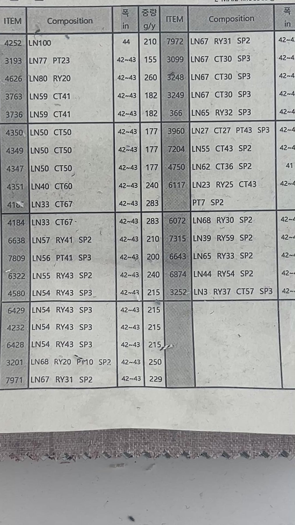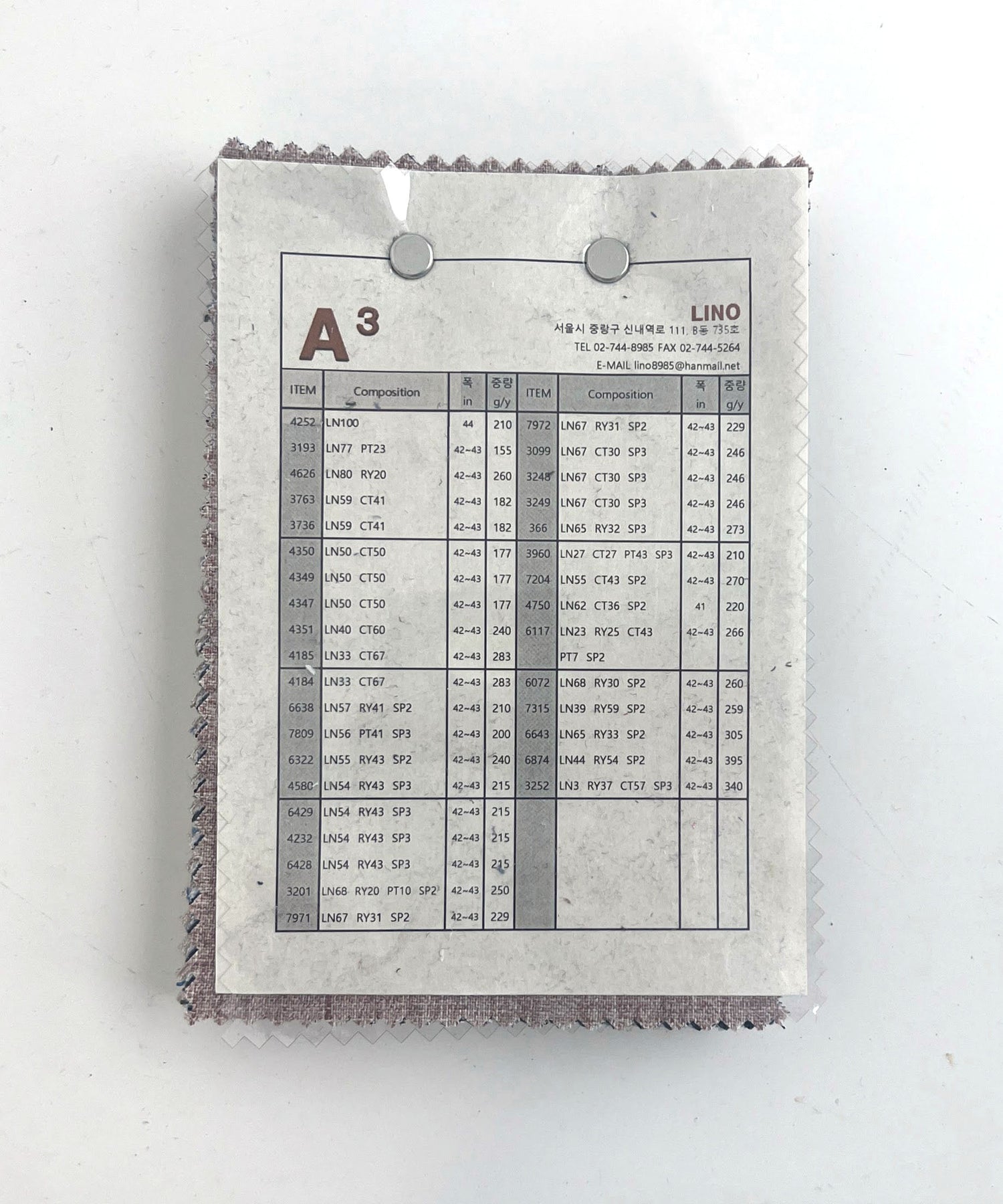 This collection includes 34 fabric swatches. Each swatch measures 11 x 15.5 cm (4.3 x 6.1 inches) and comes with a 3- to 4-digit item number sticker. You can use these numbers to search for each fabric directly on our website. Composition, width, and weight details are printed on the first page—perfect for exploring the possibilities of linen blends.
