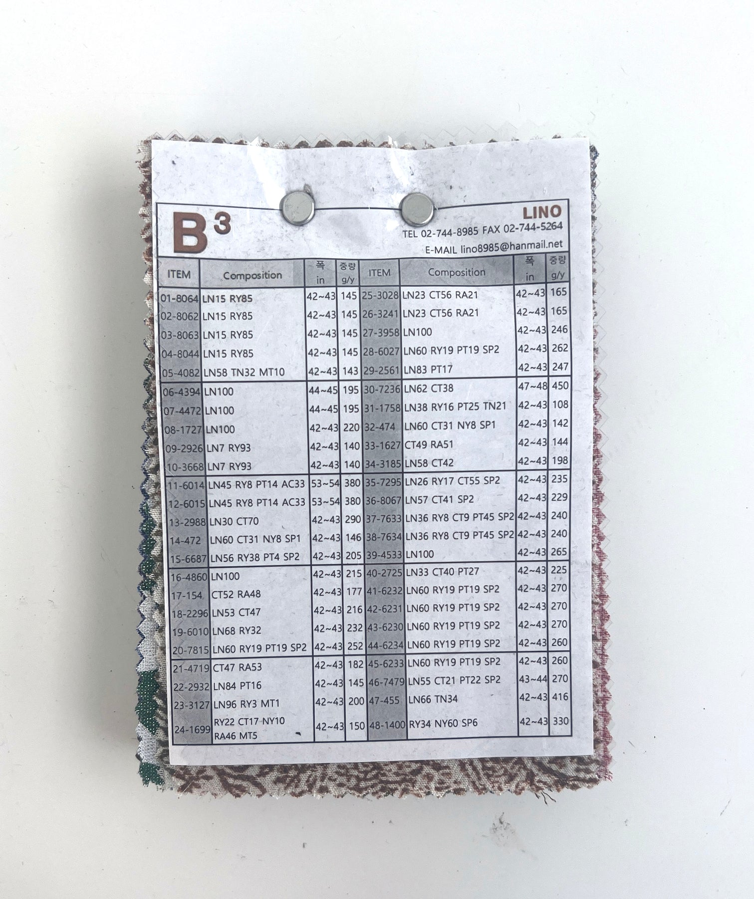This collection includes 48 swatches, each measuring 11 x 15.5 cm (4.3 x 6.1 inches), with a 3- to 4-digit item number sticker attached. You can use these numbers to easily search for each fabric on our website. A printed guide on the first page includes details on composition, width, and weight—ideal for exploring the wide range of linen blend possibilities.