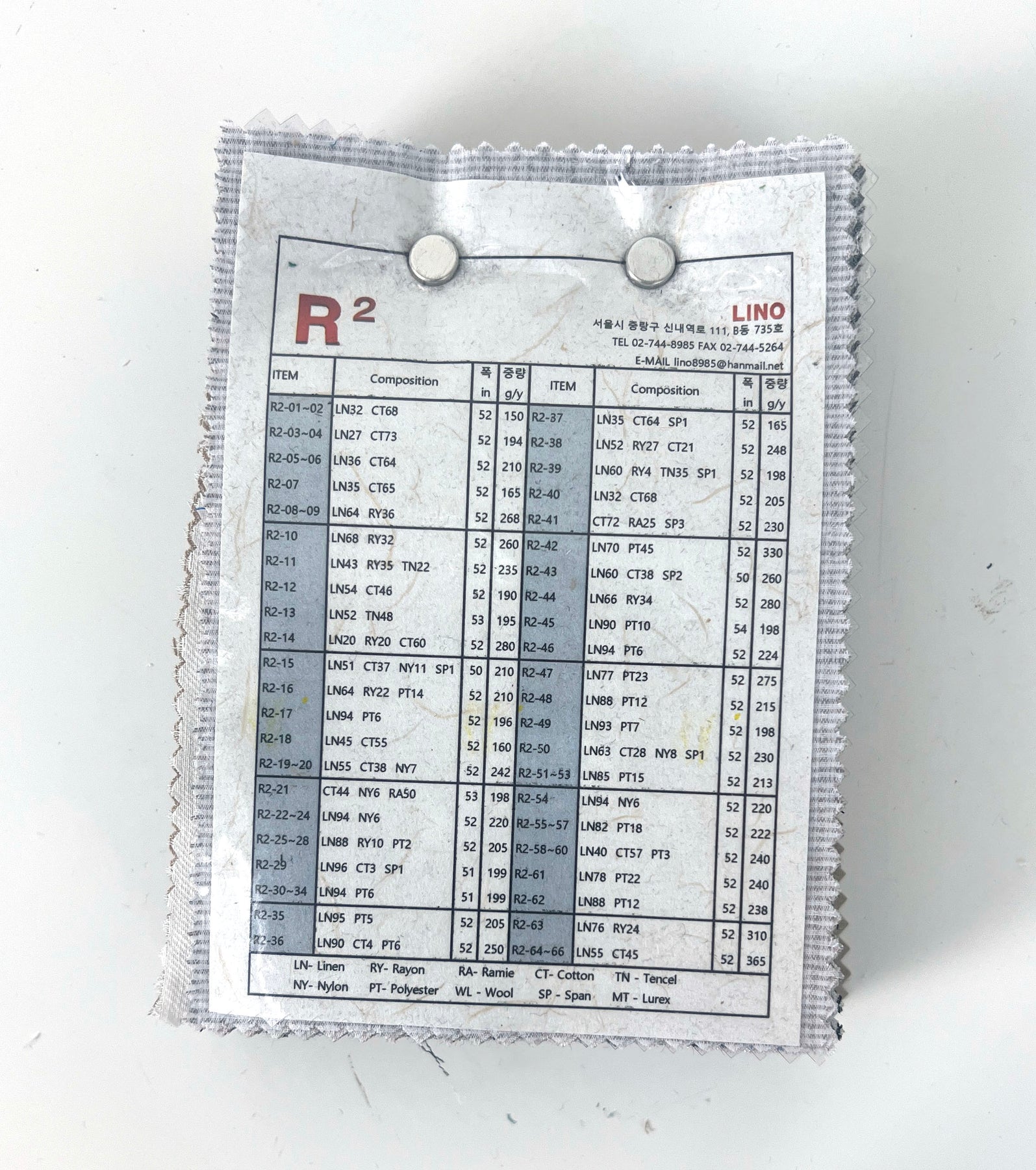 This collection includes 66 swatches, each measuring 11 x 15.5 cm (4.3 x 6.1 inches). A separate sheet is provided with the corresponding 3- to 4-digit item SKUs, making it easy to search for each fabric on our website. The first page also includes key information such as composition, width, and weight—ideal for exploring the full potential of our linen blends.