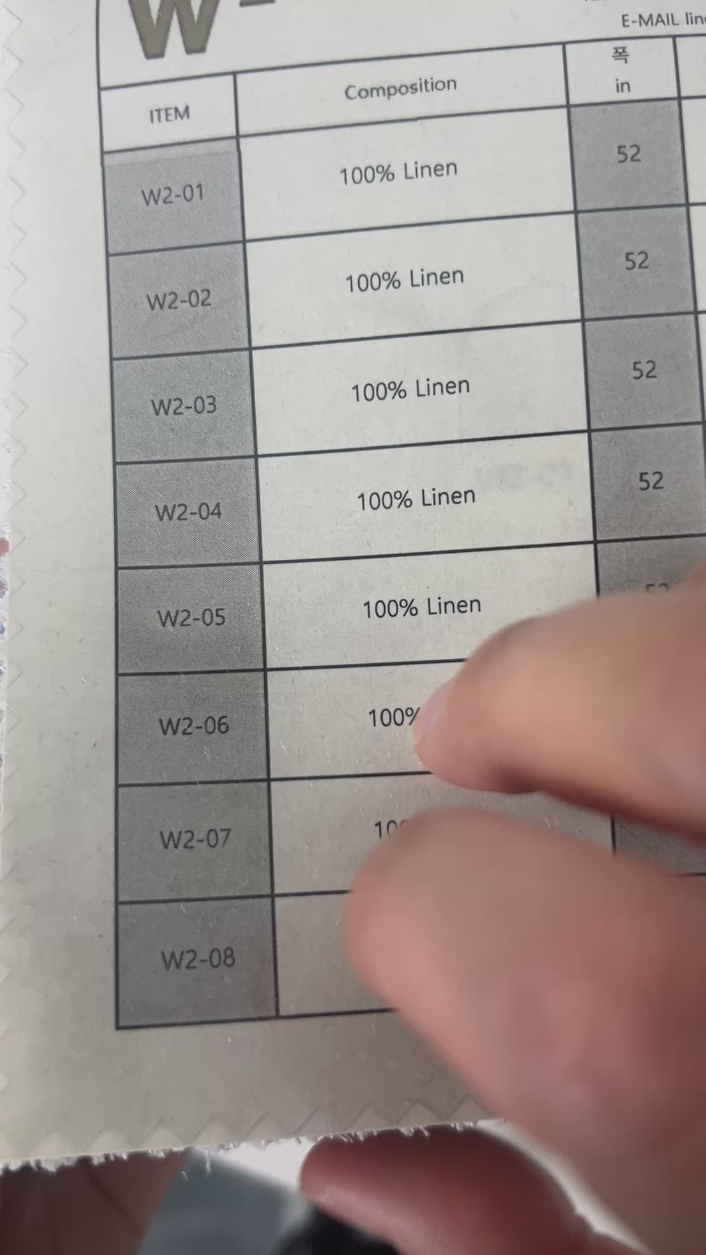 This set includes 8 swatches, each measuring 11 x 15.5 cm (4.3 x 6.1 inches), with a 3- to 4-digit item number sticker attached. These numbers can be used to easily search each fabric on our website. A printed guide on the first page provides key information such as composition, width, and weight—perfect for exploring the character and versatility of pure linen.
