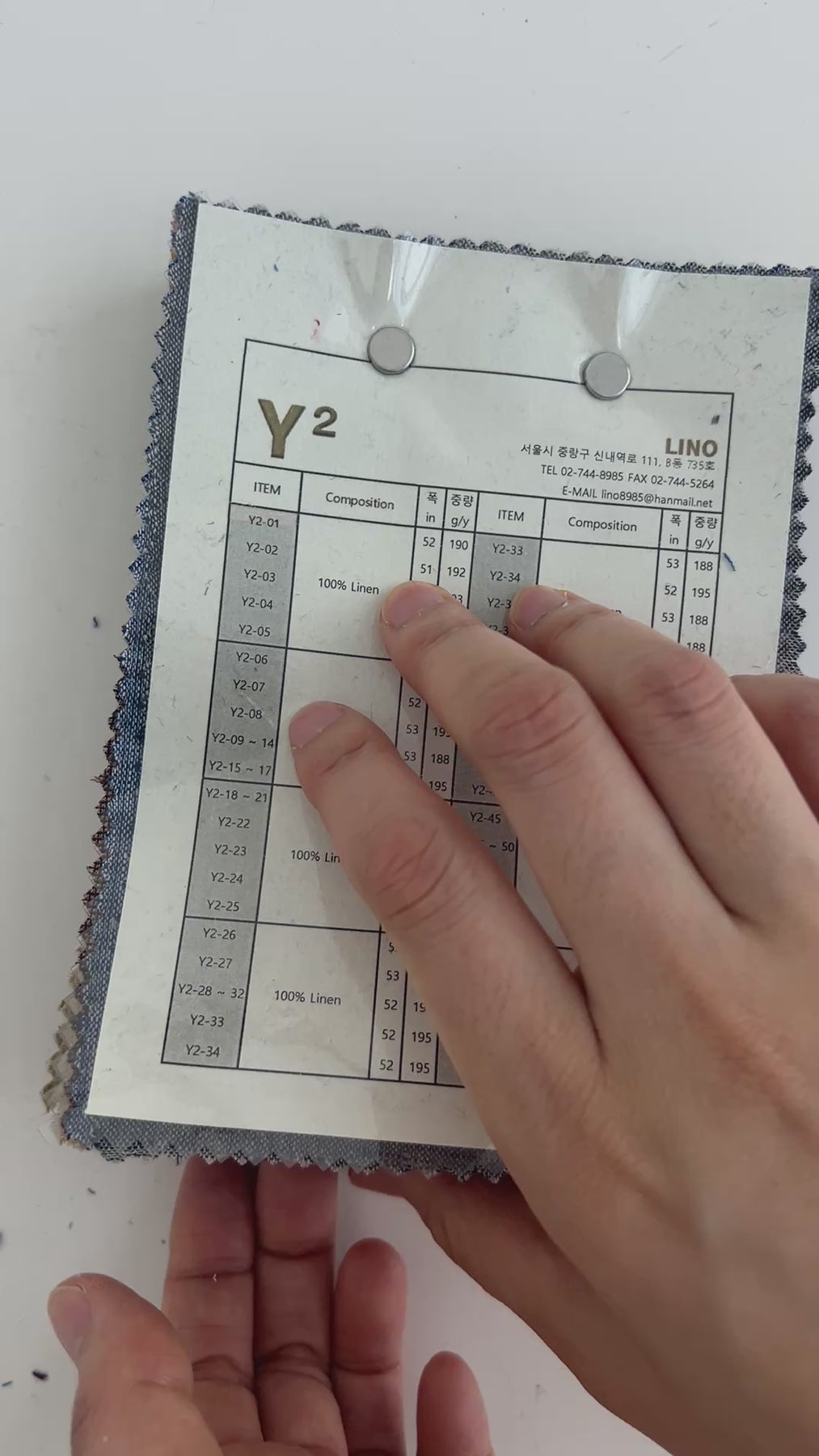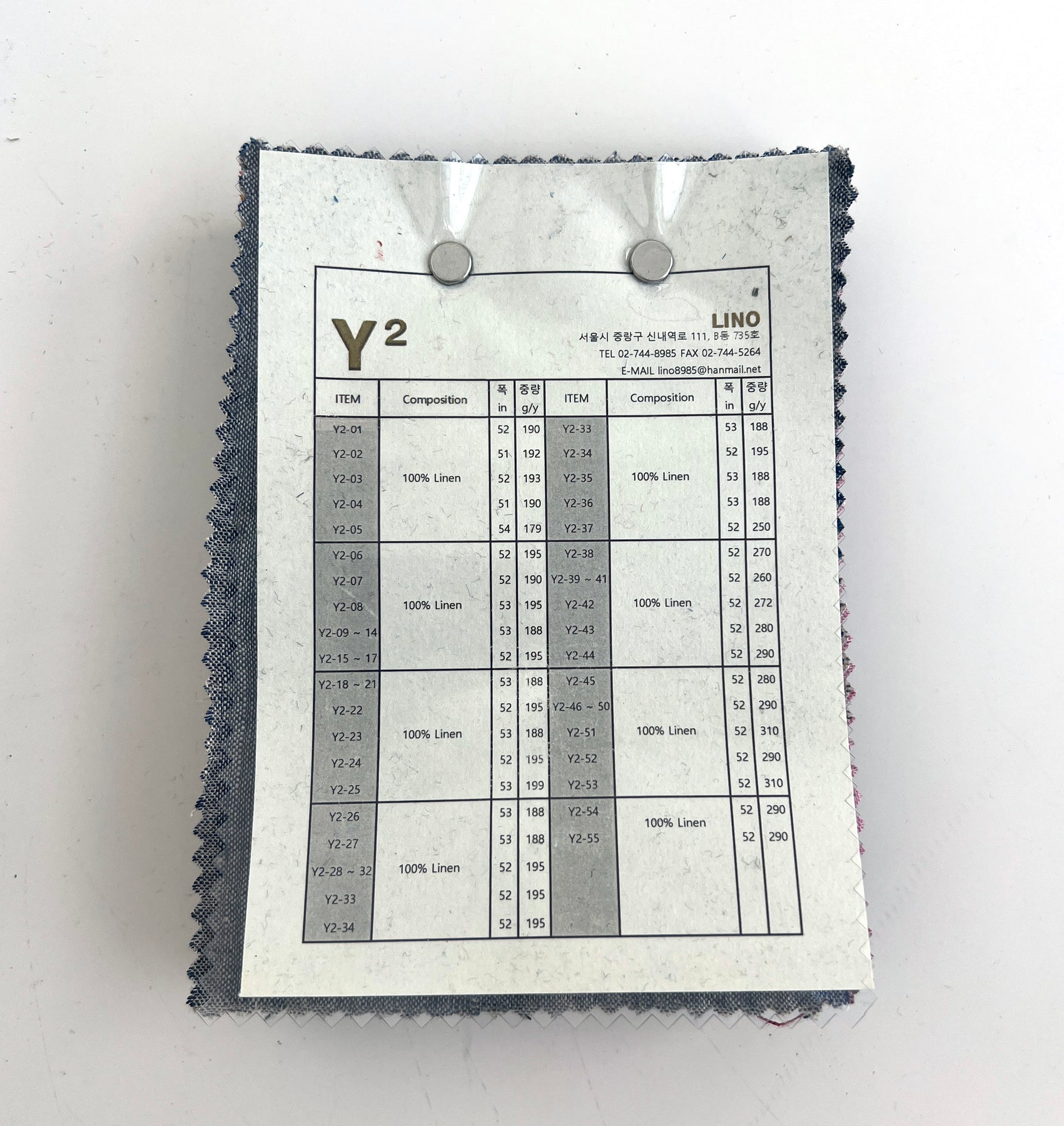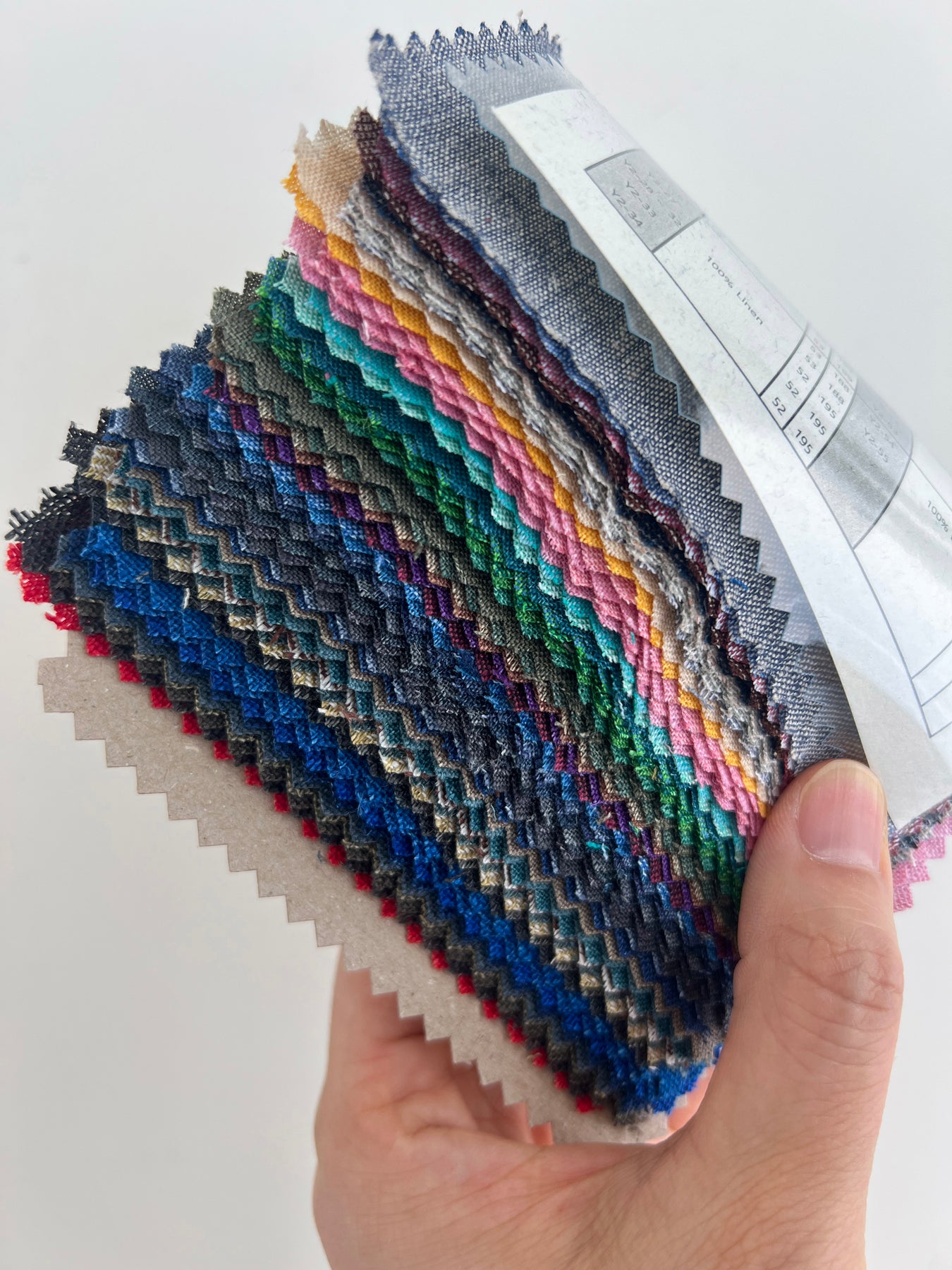 This collection includes 55 swatches, each measuring 11 x 15.5 cm (4.3 x 6.1 inches) and labeled with a 3- to 4-digit item number sticker. Composition, width, and weight details are provided on the first page—perfect for anyone seeking timeless linen textures with a sophisticated yarn-dyed finish.