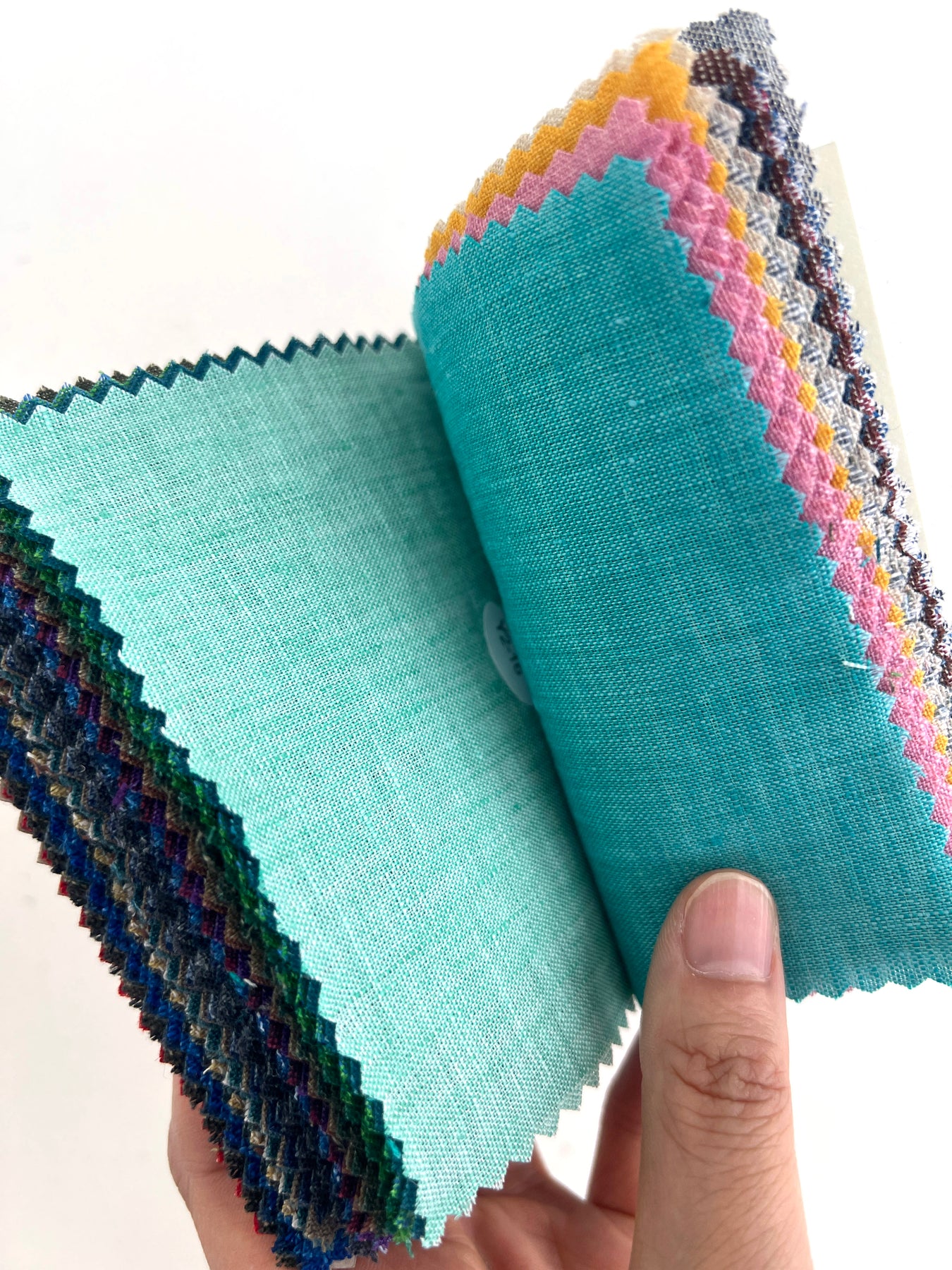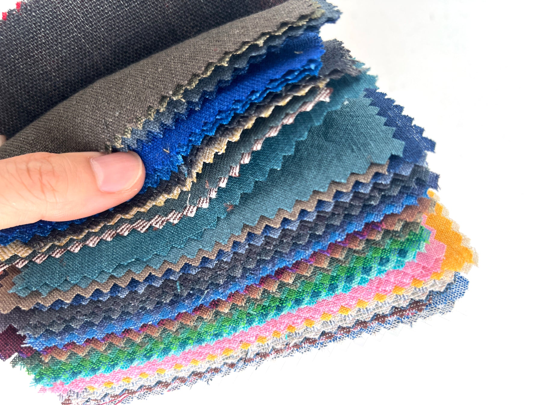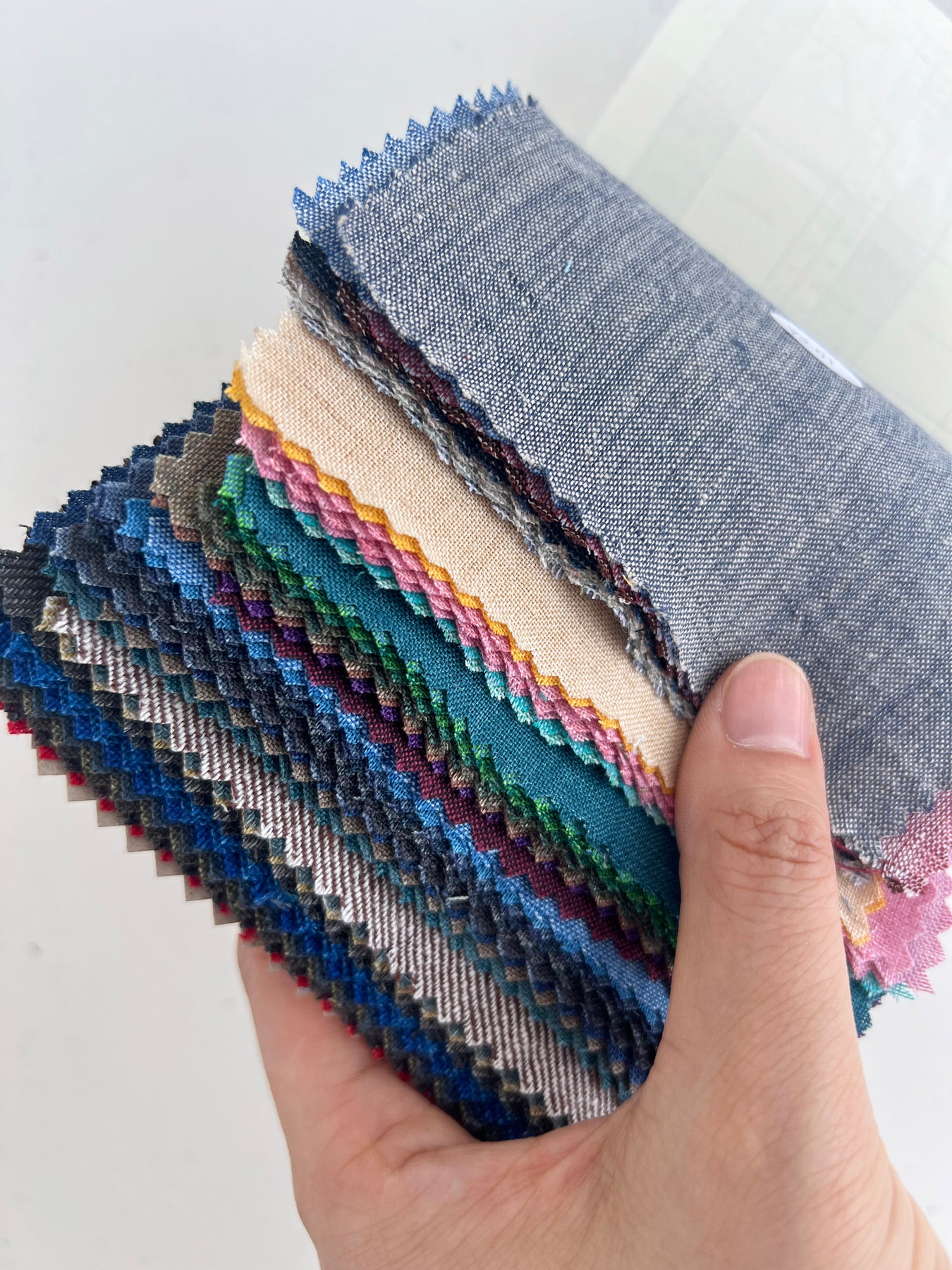 This collection includes 55 swatches, each measuring 11 x 15.5 cm (4.3 x 6.1 inches) and labeled with a 3- to 4-digit item number sticker. Composition, width, and weight details are provided on the first page—perfect for anyone seeking timeless linen textures with a sophisticated yarn-dyed finish.