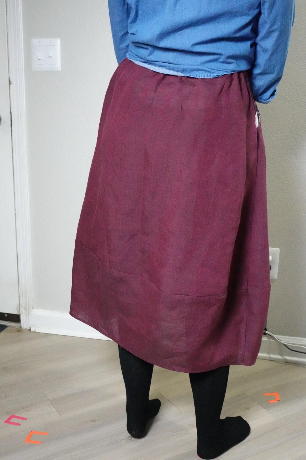 The Lotus Skirt is designed for a 160 cm/ 5'4" person to wear this so that the top and bottom skirt meet at the knee. You may change this to fit your preferences, or lengthen or shorten the skirt to match your height