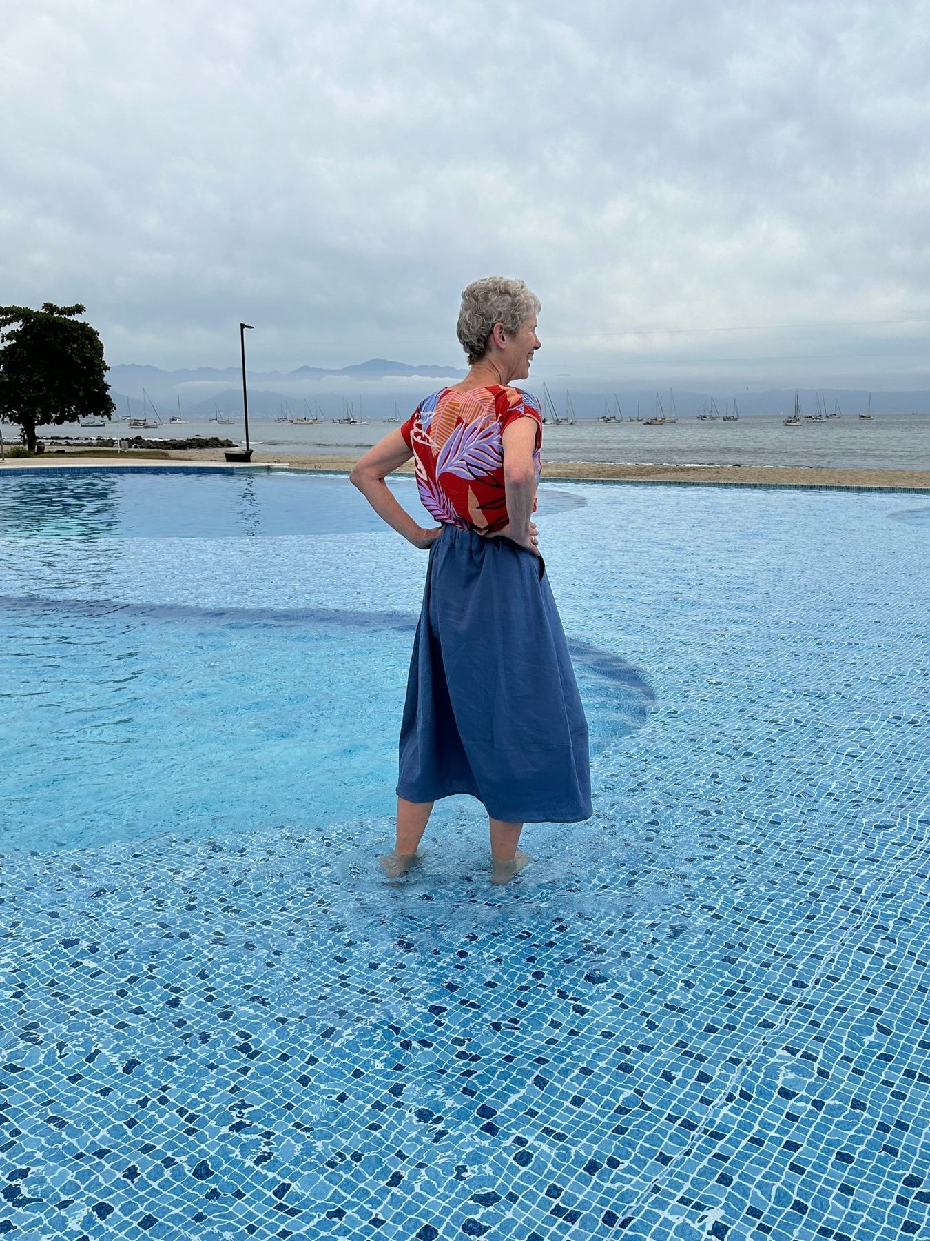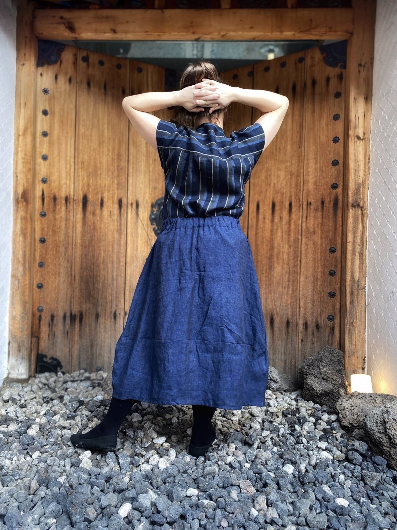 Instagram user @sewingwithlinen made a size 12 Lotus in our Linen/Silk Canvas 6555 blue and 6494 white