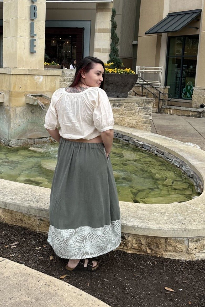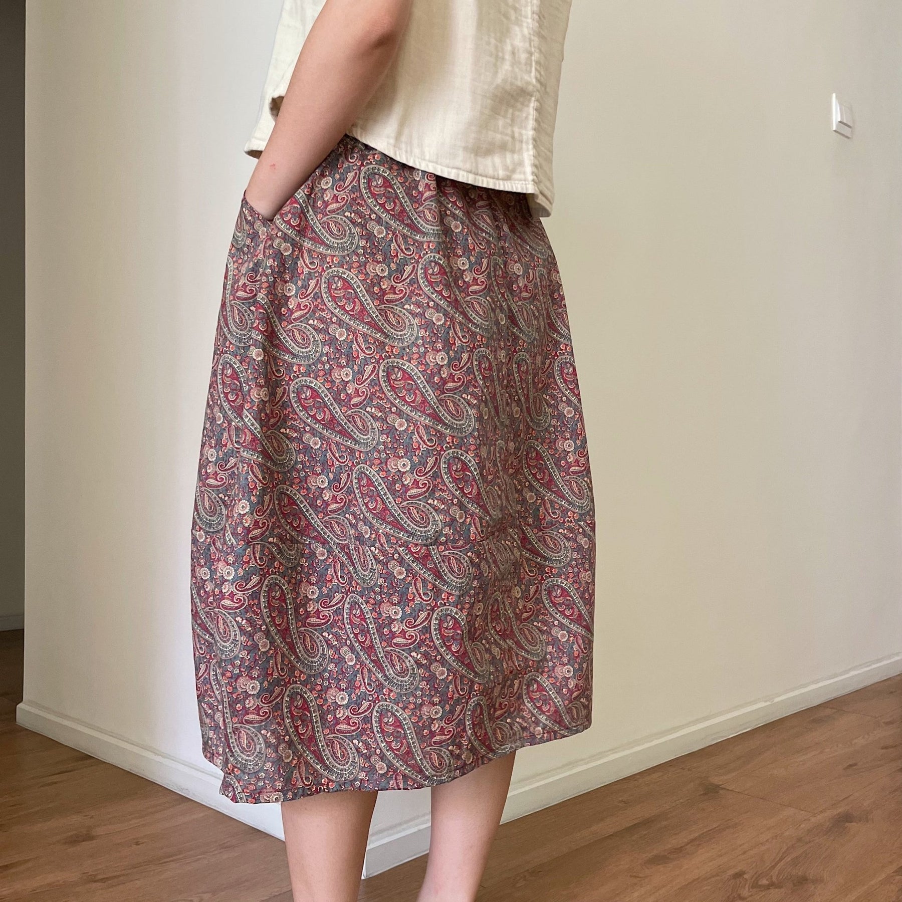 This skirt is designed to be sewn by all levels, from confident beginner to expert. The skirt features a flat front and elastic back waistband, slash pockets at the waist and a tapered lower skirt.