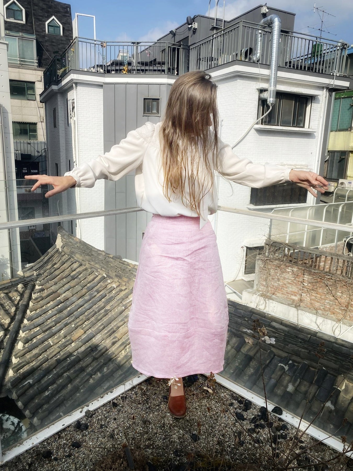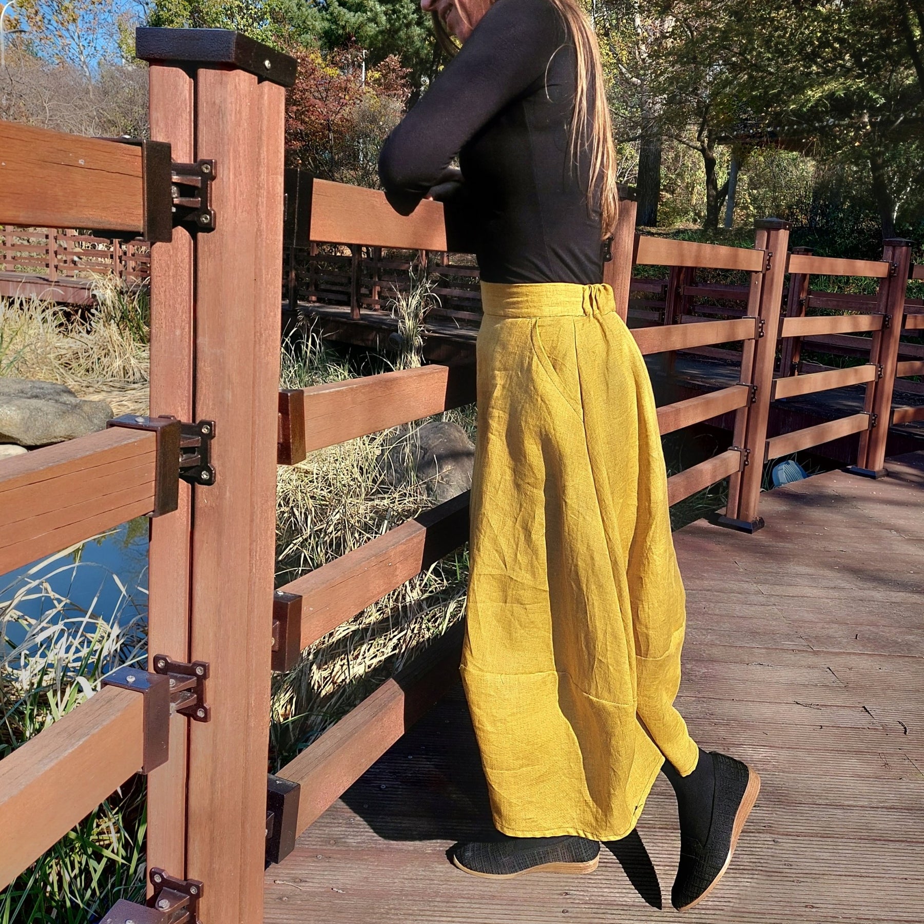 A jar skirt, or “항아리치마/hangari skirt (pronounced hang-ah-ri), is a Korean style skirt, also known outside of Korea as a lantern skirt. In Korea, it is commonly used in informal hanbok known as gaeryang hanbok (개량한복), which can be worn comfortably in everyday life. The most prominent feature of the jar skirt is the fact that it has a jar shape to it, extending out from the top and tapering in at the bottom.
