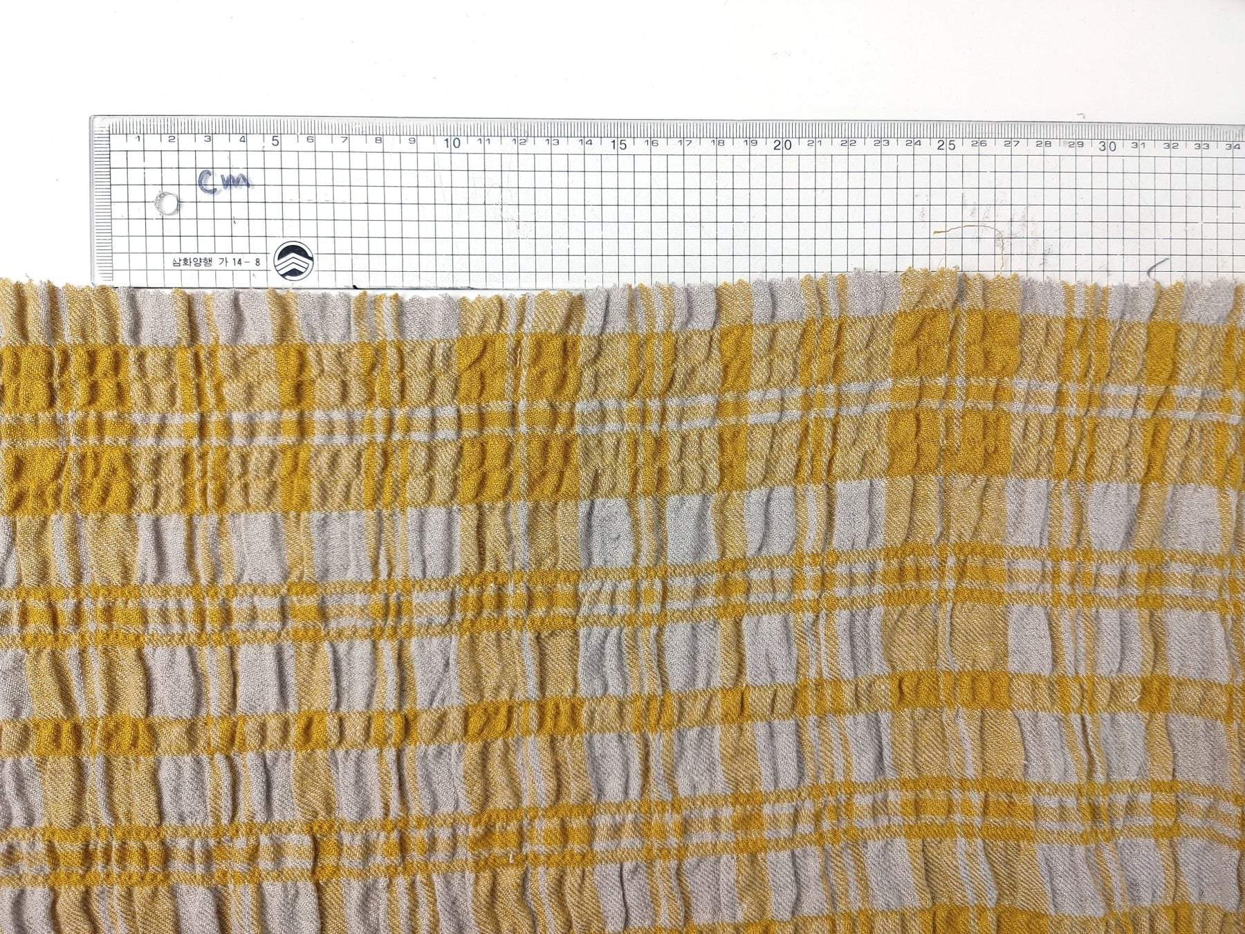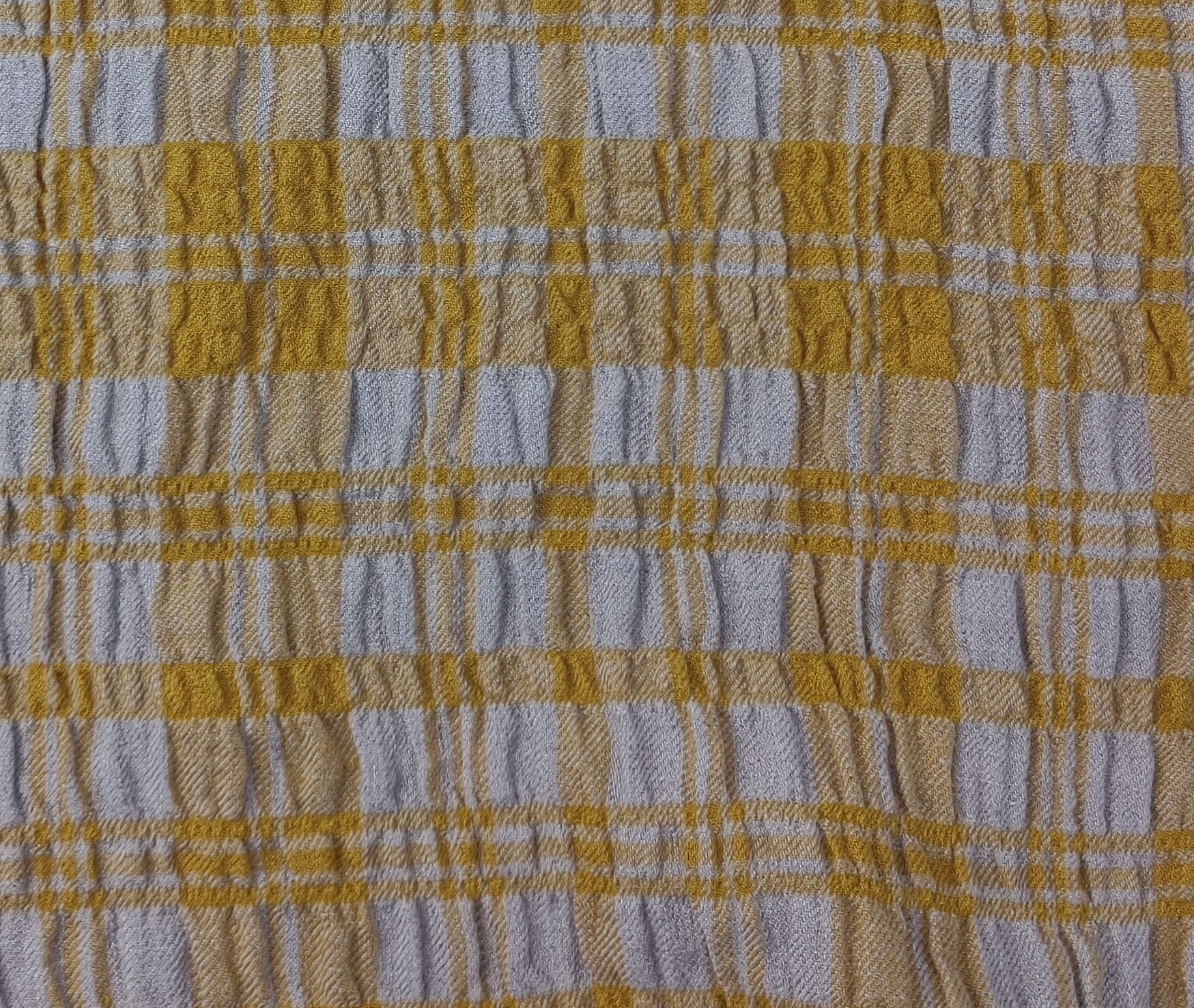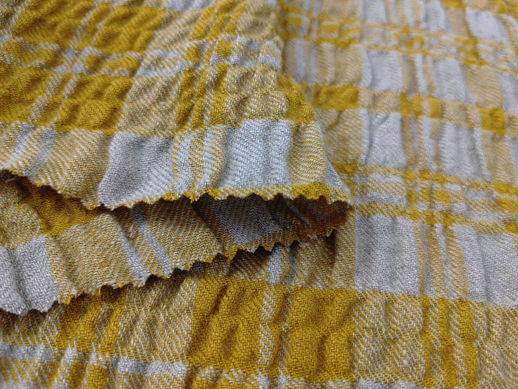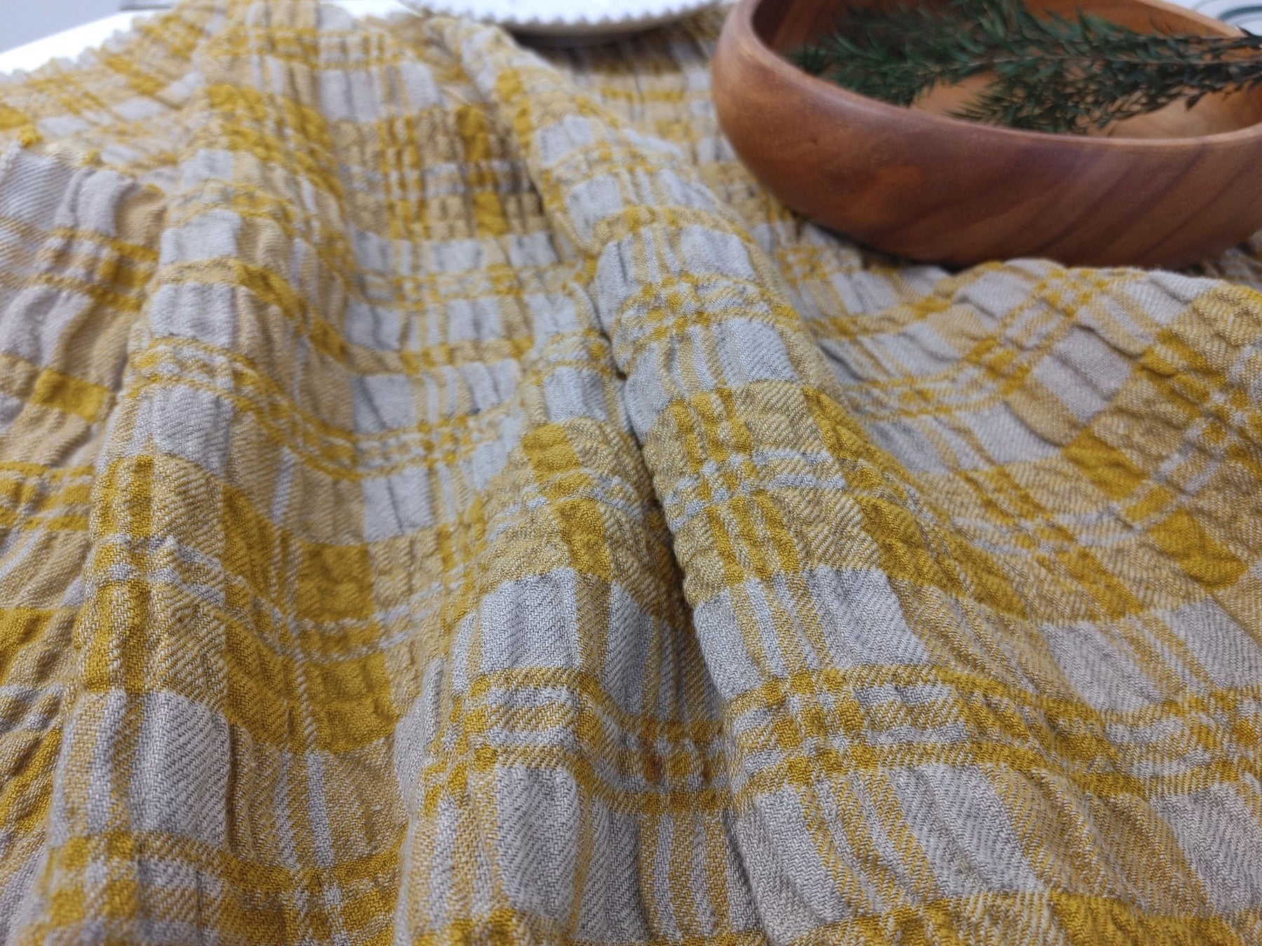 Introducing a remarkable fabric: a Linen Blend Plaid with a Distinctive Wrinkle Effect. This unique textile features a composition of 95% linen, 4% rayon, and 1% PU, with the weft side ingeniously infused with rayon and PU to create a dramatic and eye-catching wrinkle effect.
