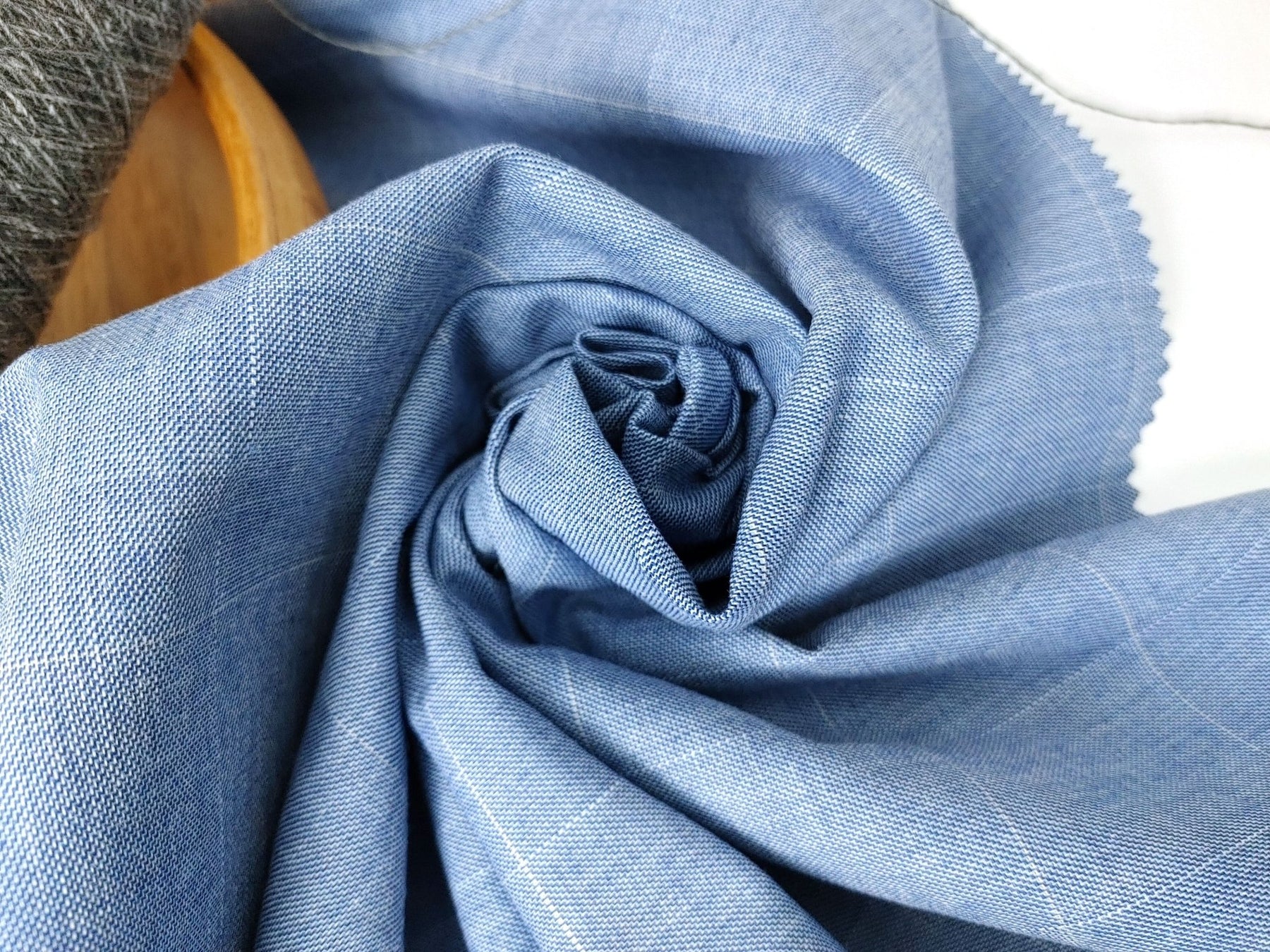 Experience the versatility of our Ramie Cotton Stretch Fabric with Blue Windowpane. Comprising 72% Cotton, 26% Ramie, and 2% PU, this light-to-medium weight fabric at 159 g/sqm combines a soothing blue twill with a classic white pin windowpane pattern. The pre-washed softness guarantees a comfortable feel, and the stretch effect adds modern flexibility. Elevate your wardrobe with this timeless blend of comfort and style, perfect for a variety of garment creations.