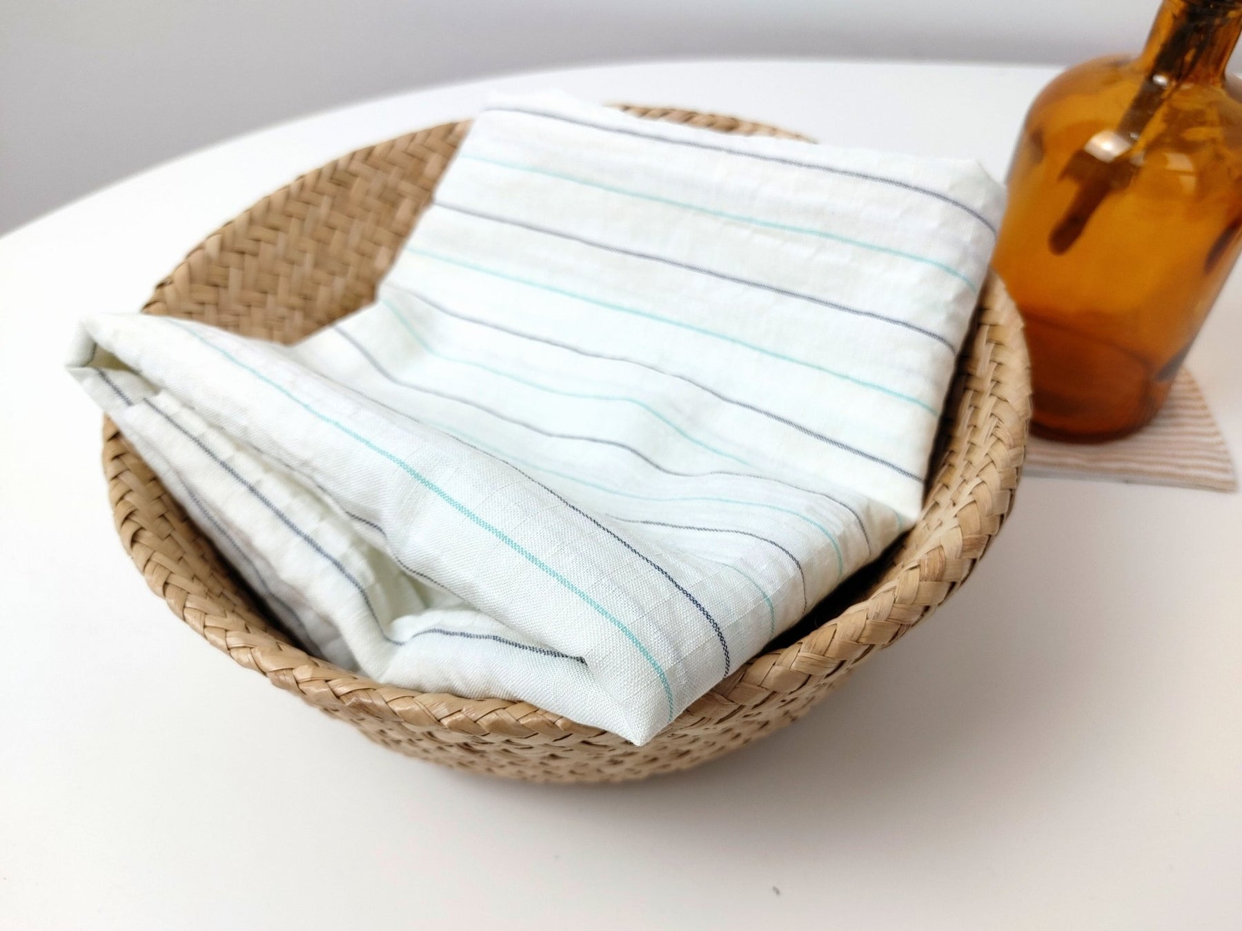 Introducing our Linen Blend Fabric with a captivating wrinkle effect and subtle stretch. The white base is adorned with two complementary colors of stripes, creating a timeless design. Crafted from 60% Linen, 31% Cotton, 8% Nylon, and 1% PU, this fabric strikes a perfect balance between natural and synthetic fibers. With a light weight of 130 g/sqm (3.83 oz per square yard), it offers a comfortable and stylish option for your sewing projects. Enjoy the pre-washed, soft handfeel and discover a perfect fusion of unique texture and timeless elegance in every creation.