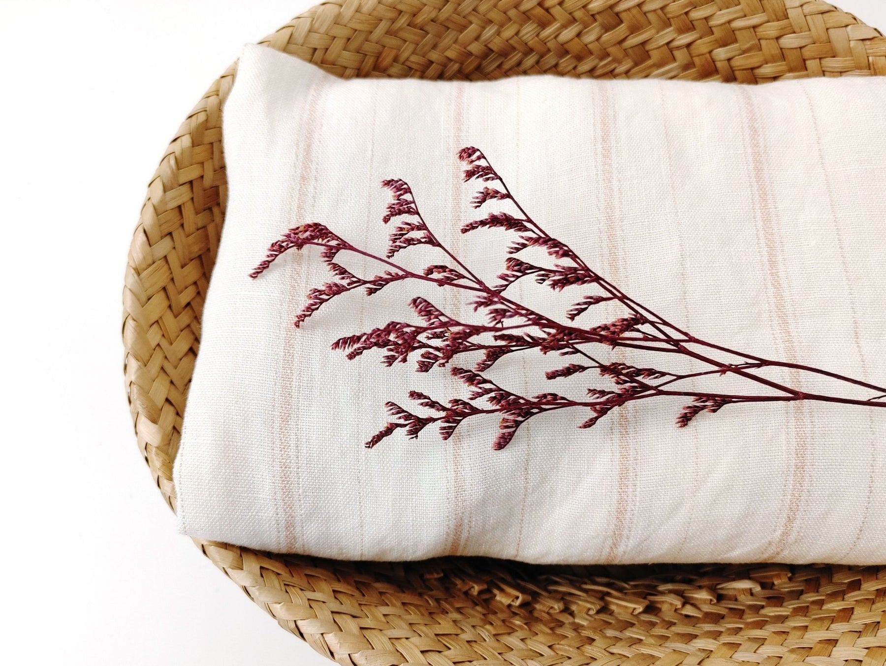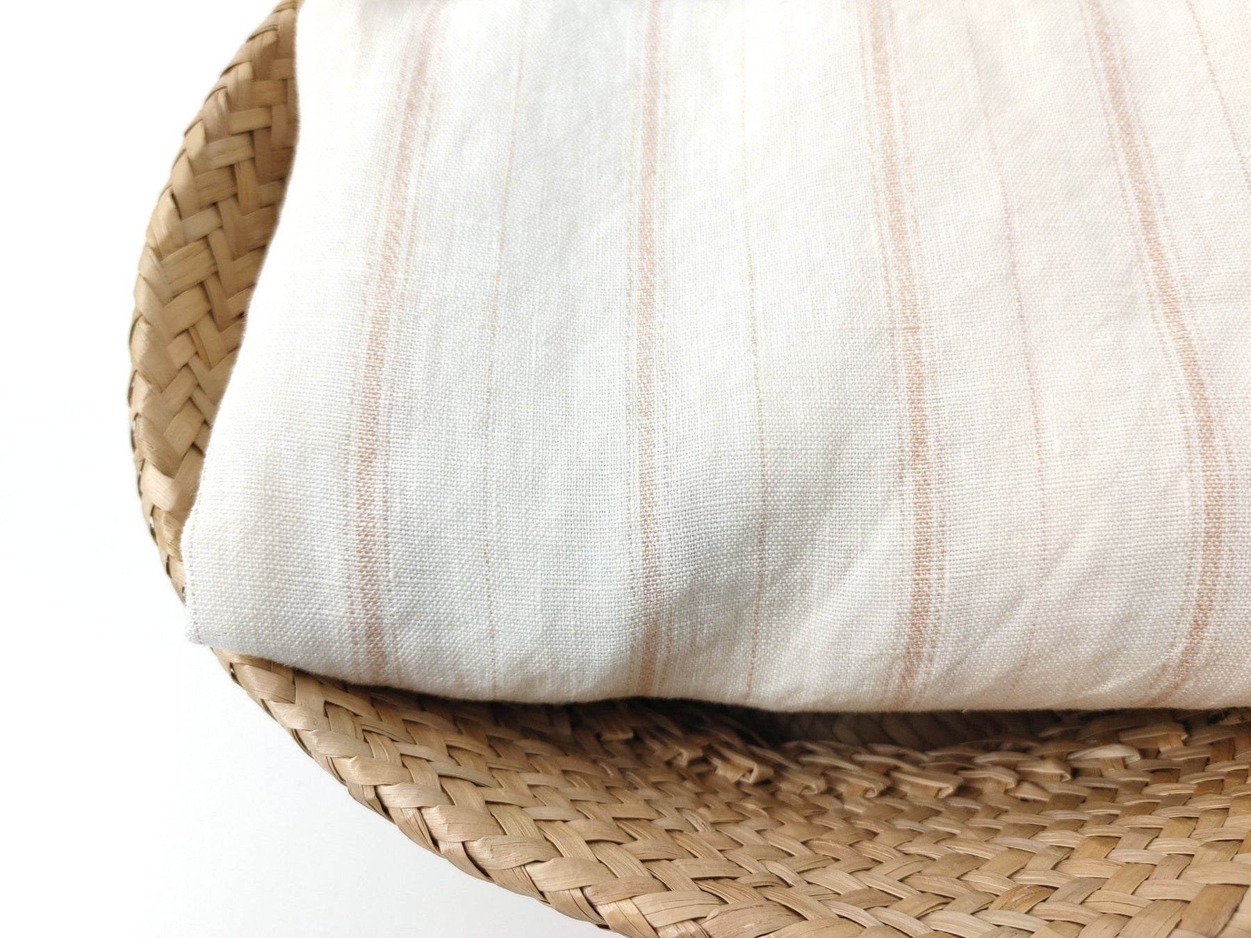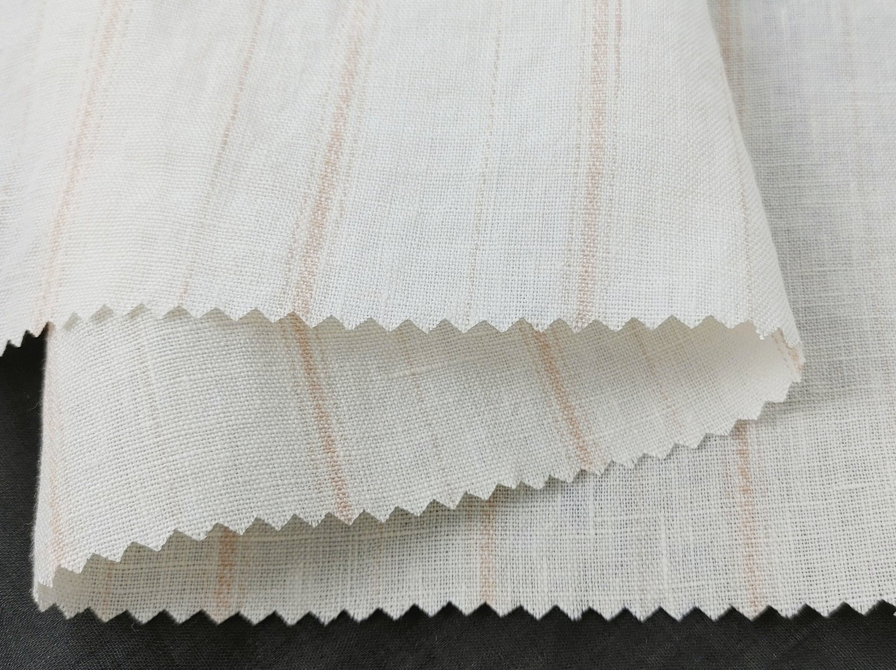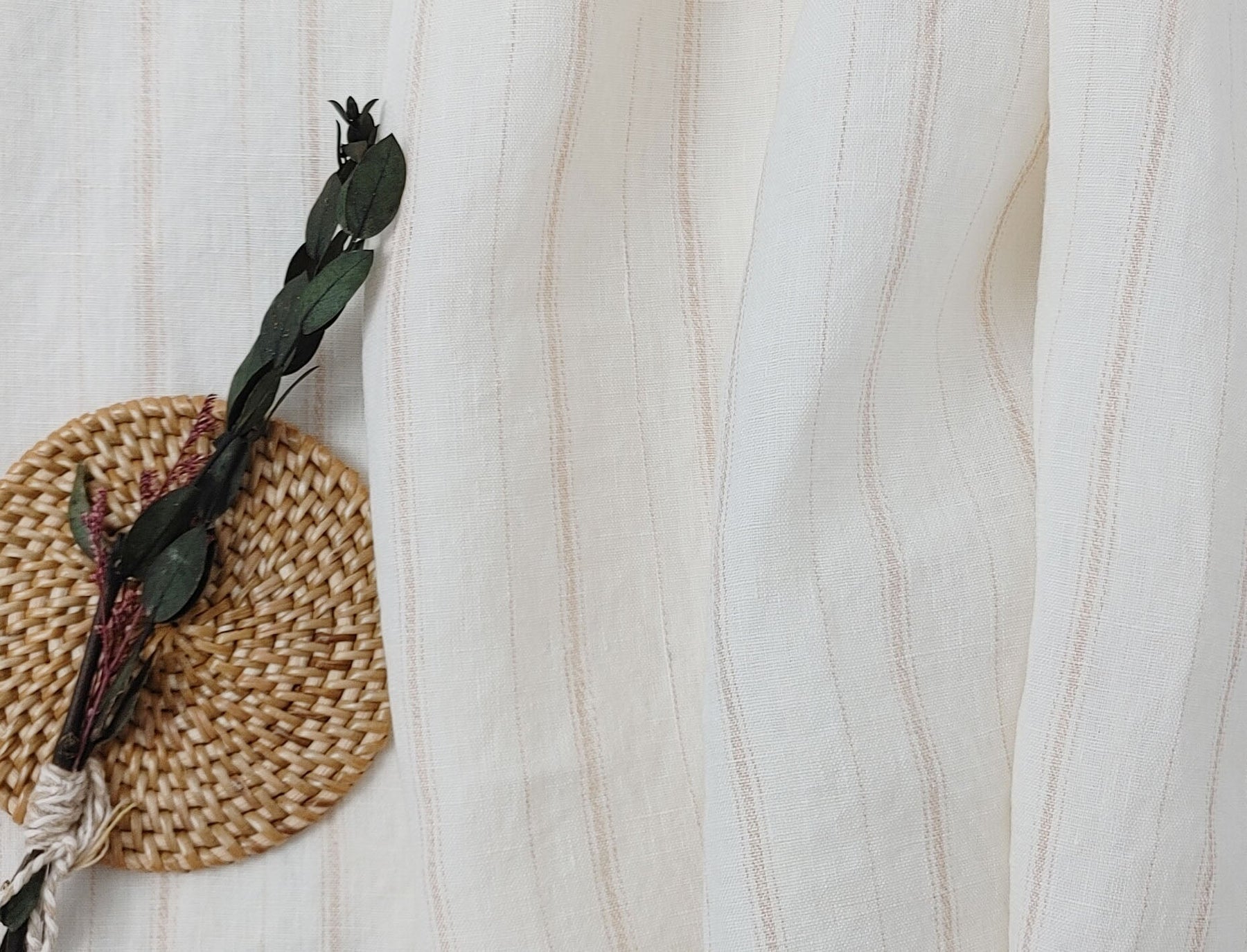 Discover elegance in simplicity with our 100% Linen Fabric featuring subtle beige stripes on an ivory base. The calm and classic stripe pattern adds a touch of sophistication to any project. With its medium weight and soft pre-washed feel, this fabric is versatile for various sewing endeavors, from garments to home decor. Elevate your creations with this timeless fabric, perfect for adding understated charm to your designs.