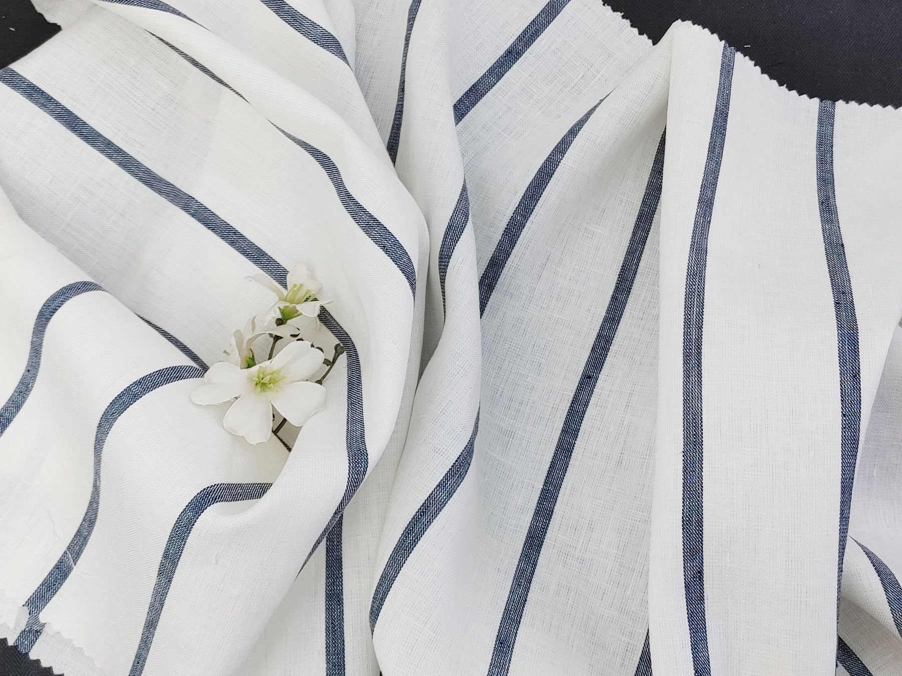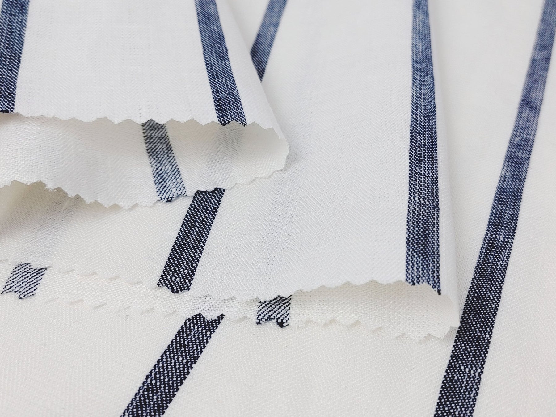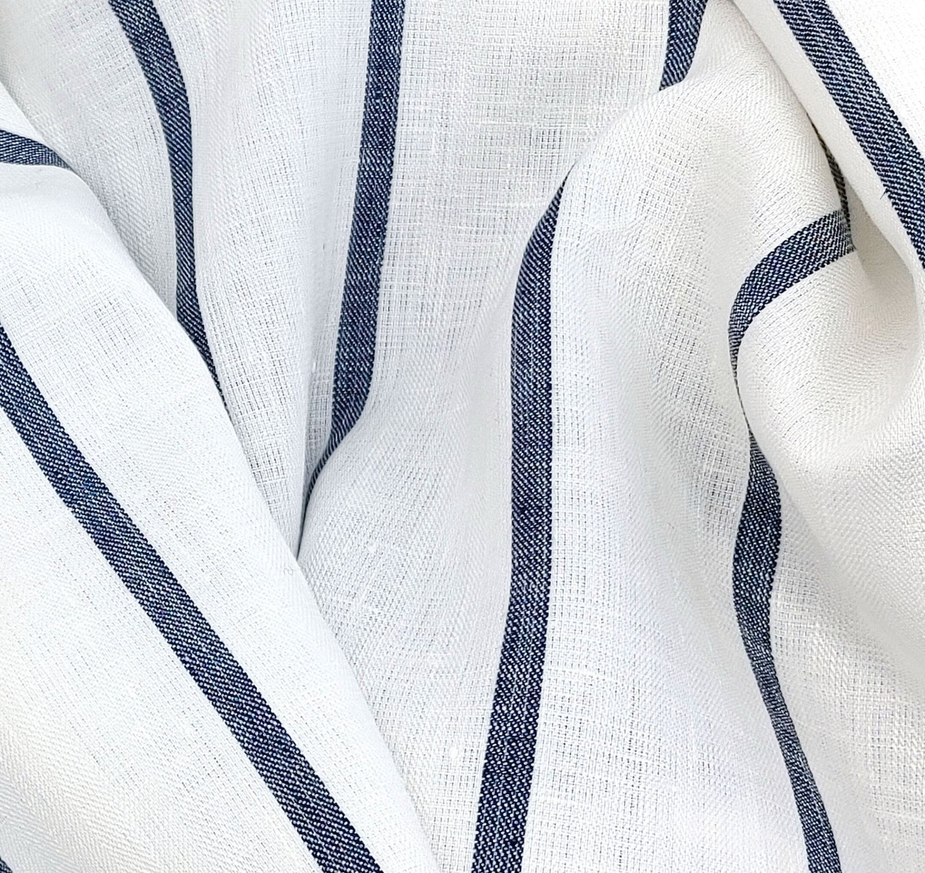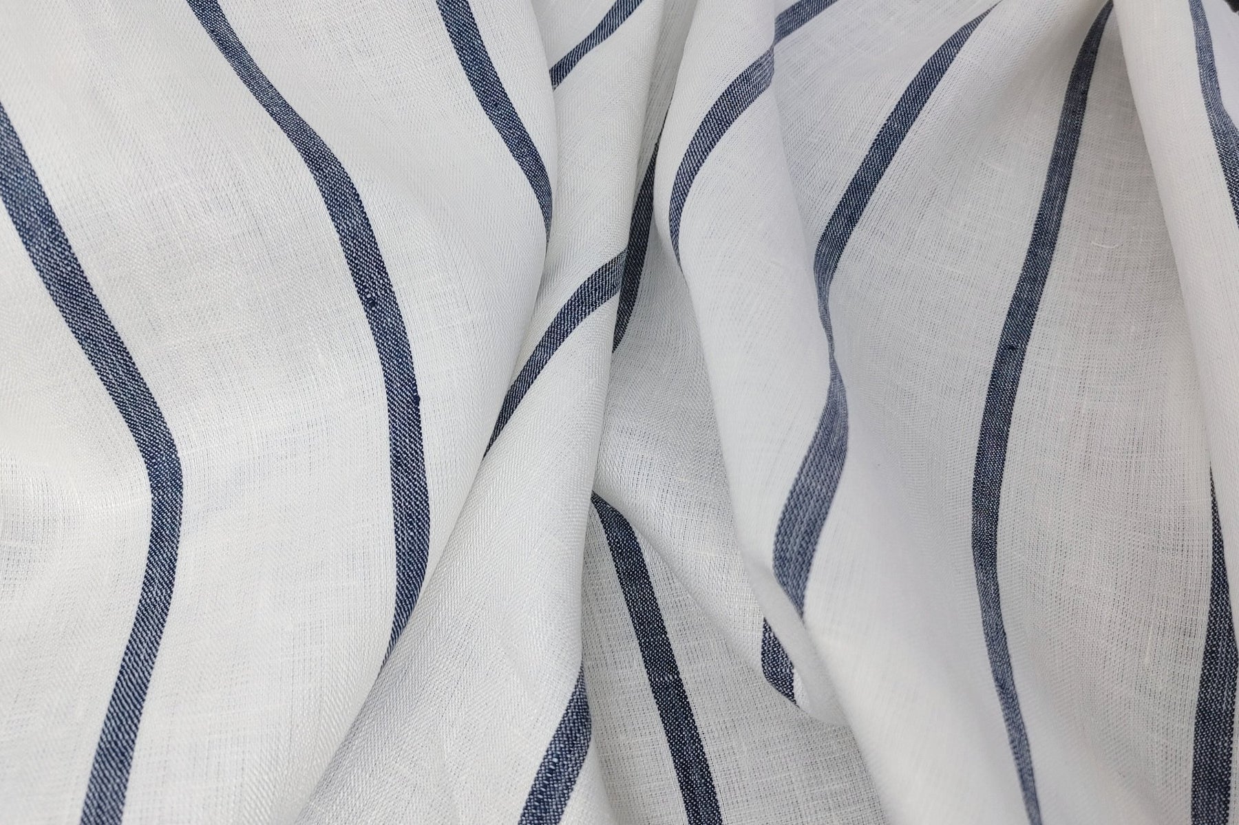 Immerse yourself in the timeless elegance of our 100% Linen HBT Fabric, featuring a herringbone twill weave, a pristine white base, and distinguished navy color stripes. A strong mercerizing process elevates the fabric's tactile experience, resulting in a soft and slightly shiny finish.