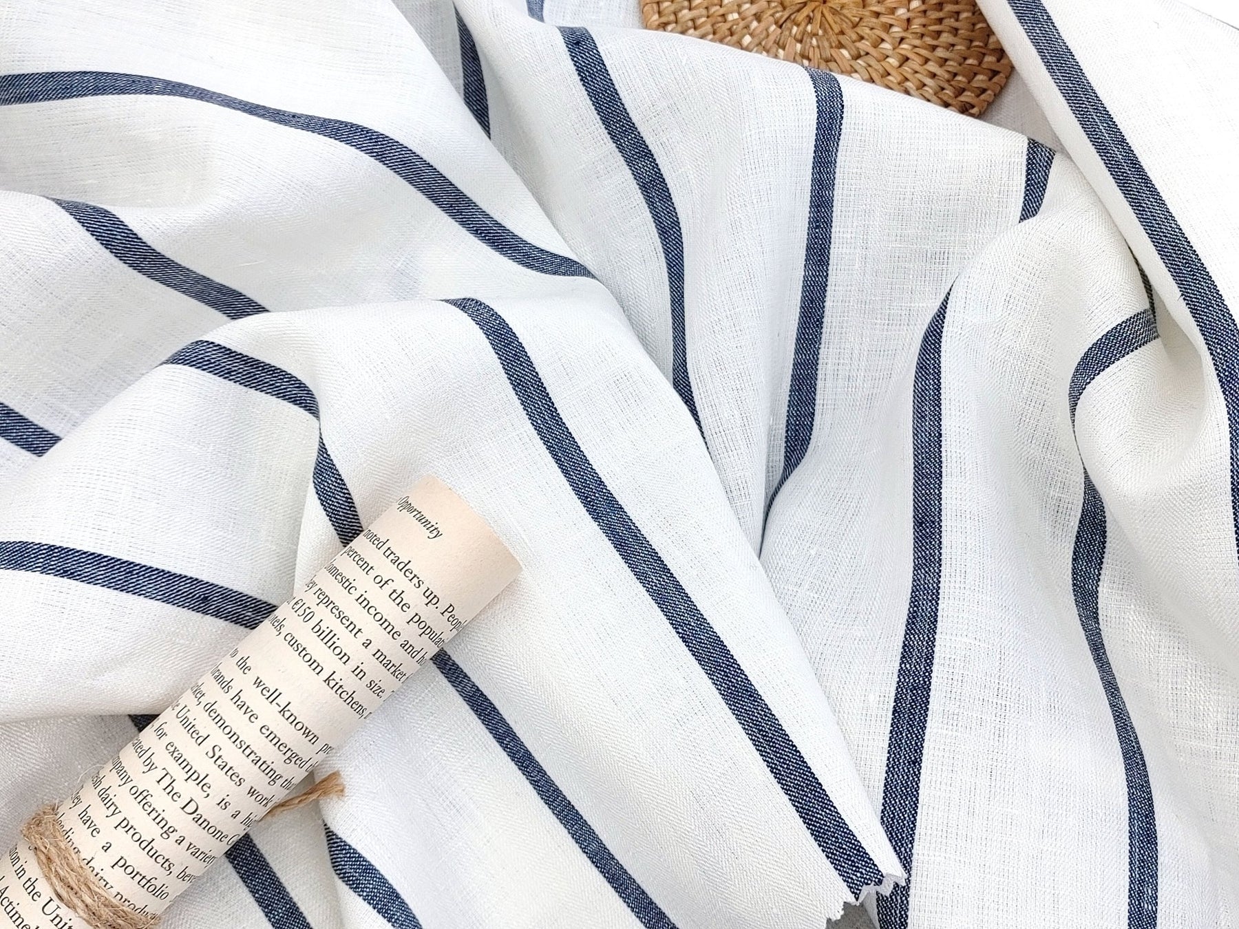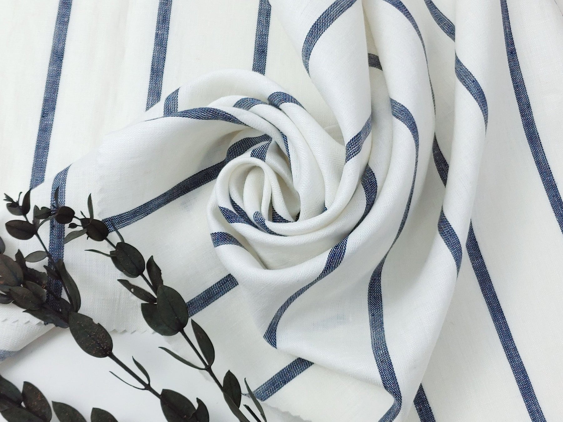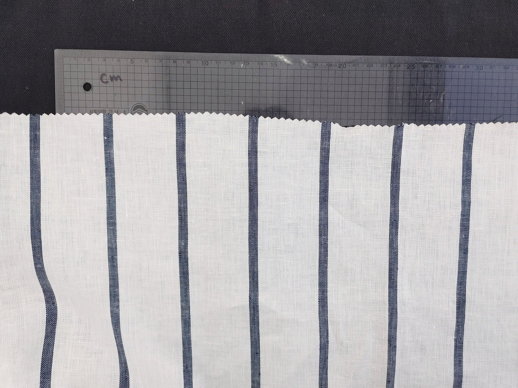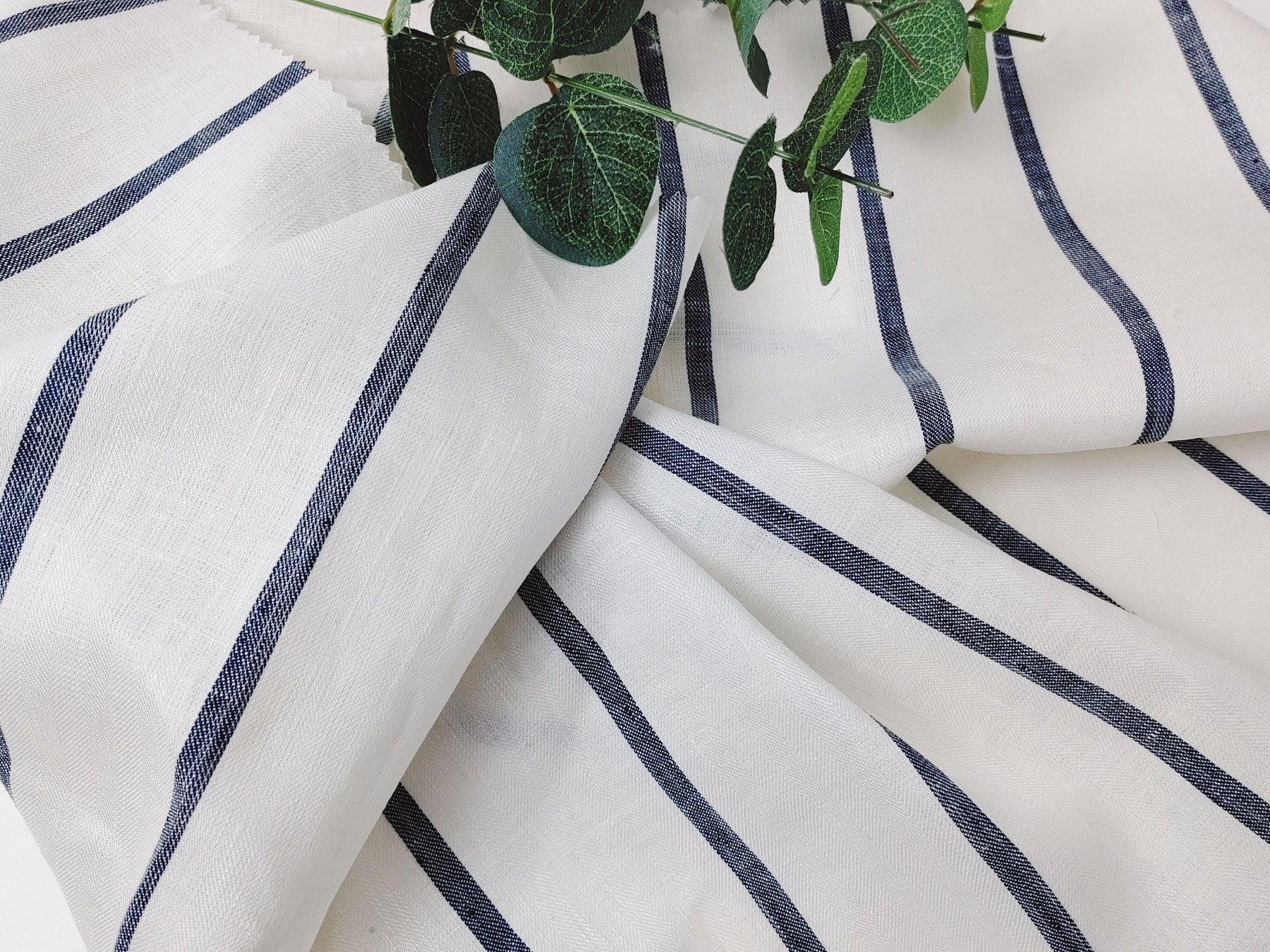 Immerse yourself in the timeless elegance of our 100% Linen HBT Fabric, featuring a herringbone twill weave, a pristine white base, and distinguished navy color stripes. A strong mercerizing process elevates the fabric's tactile experience, resulting in a soft and slightly shiny finish.