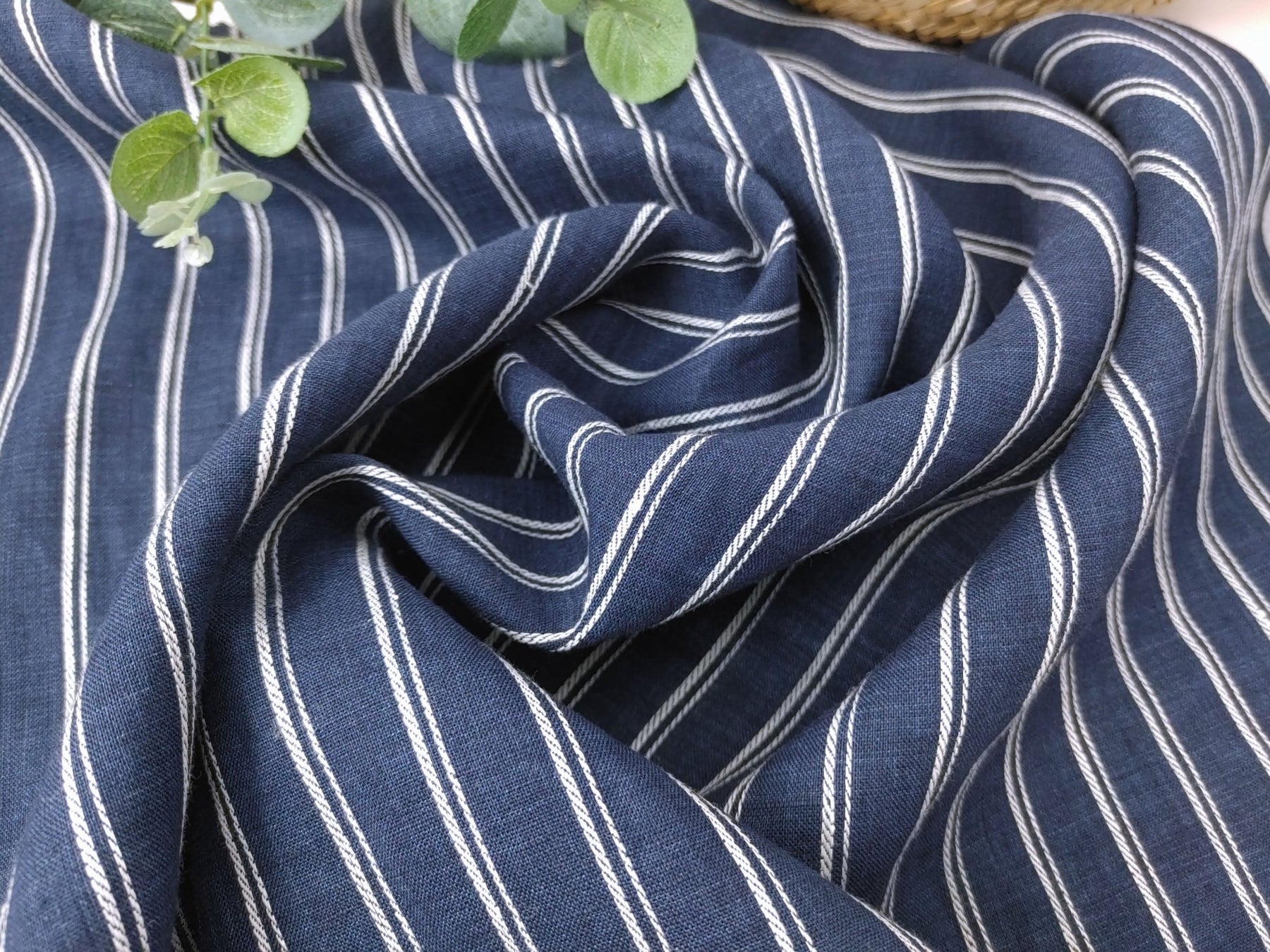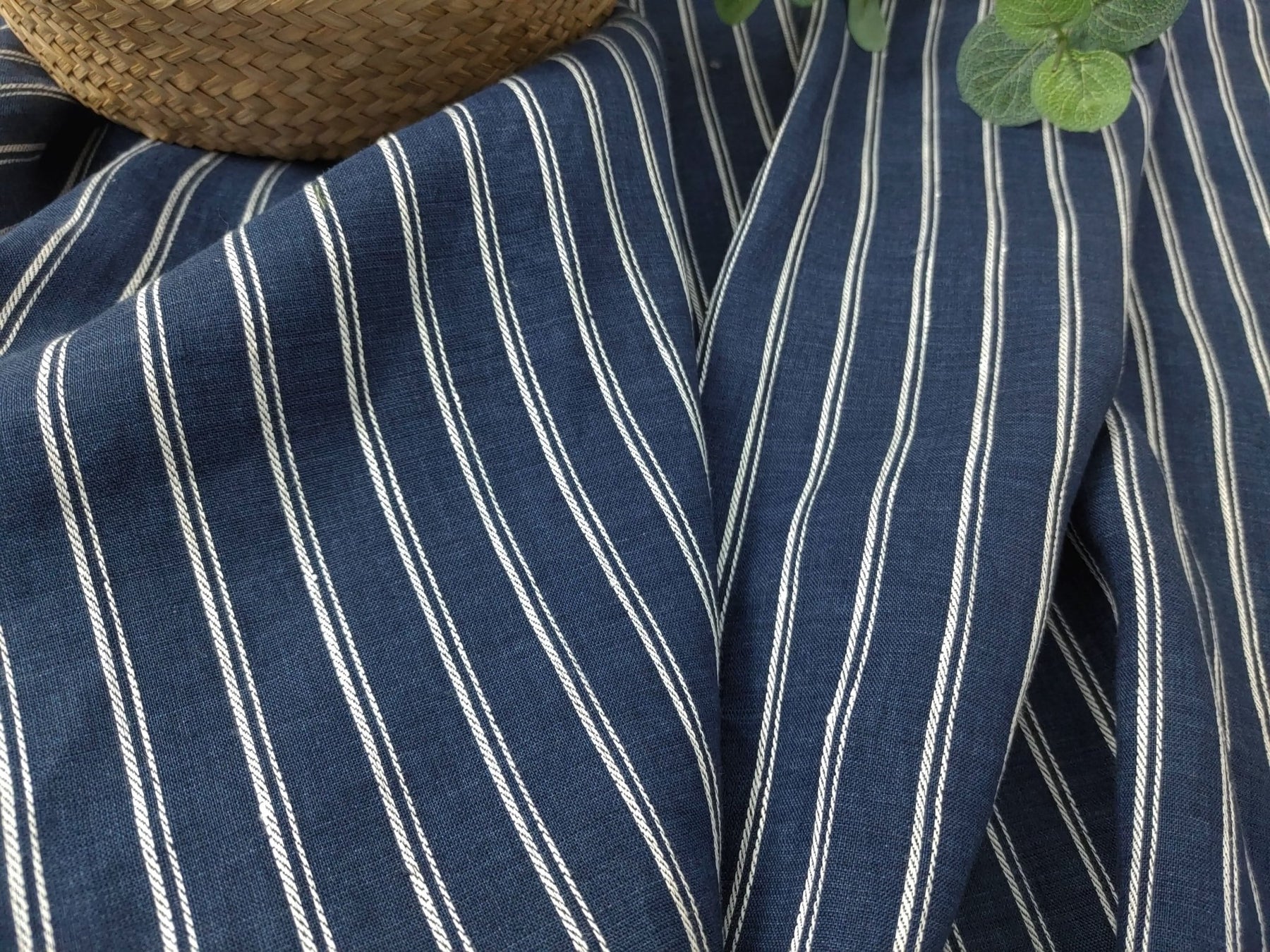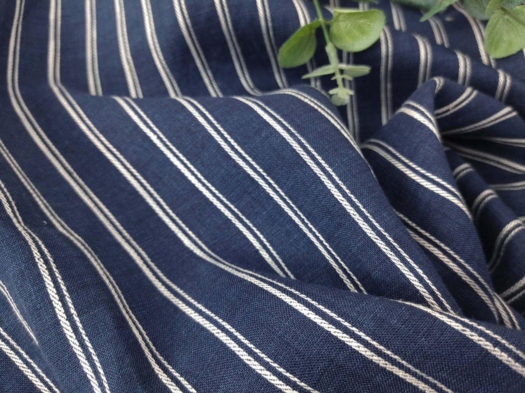 Experience the epitome of sophistication with our Dobby Stripe Elegance in 100% Linen Fabric. The navy base features a classic plain weaving structure, while the striking white stripe, crafted in twill, adds a touch of distinction. The fabric's composition of 100% linen ensures a lightweight to medium weight feel, perfect for a range of projects. Pre-washed for a soft touch, this fabric boasts a timeless charm and a lack of elasticity, making it an ideal choice for garments and crafts that prioritize both style and comfort.