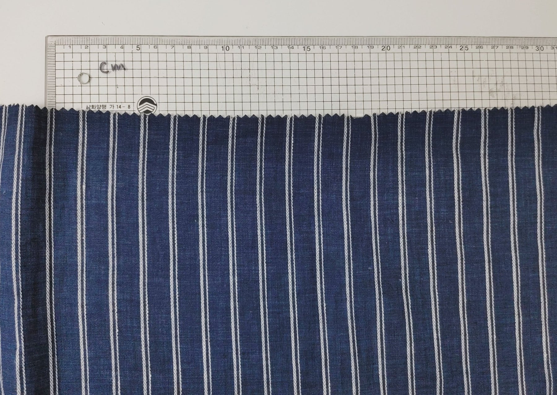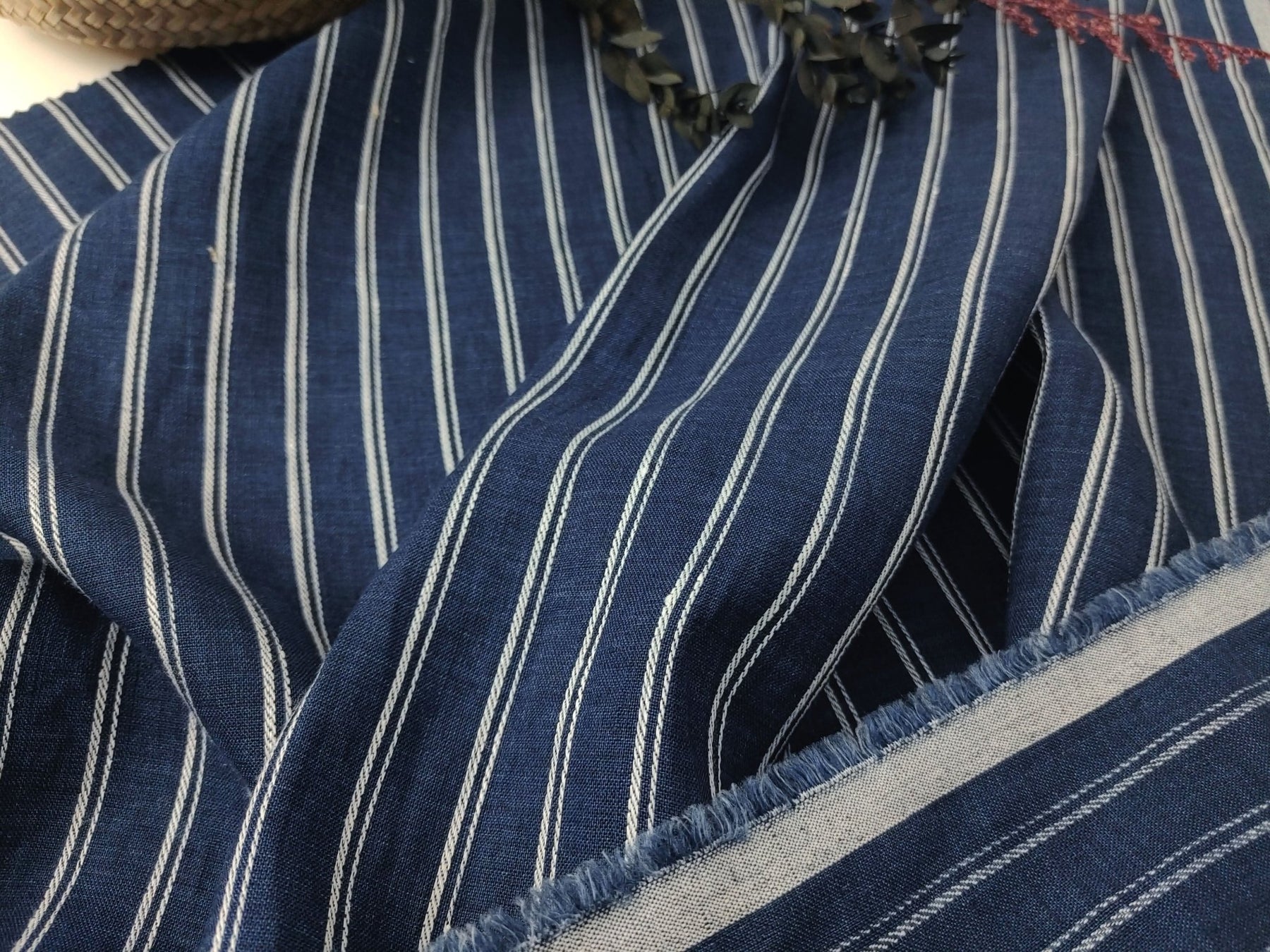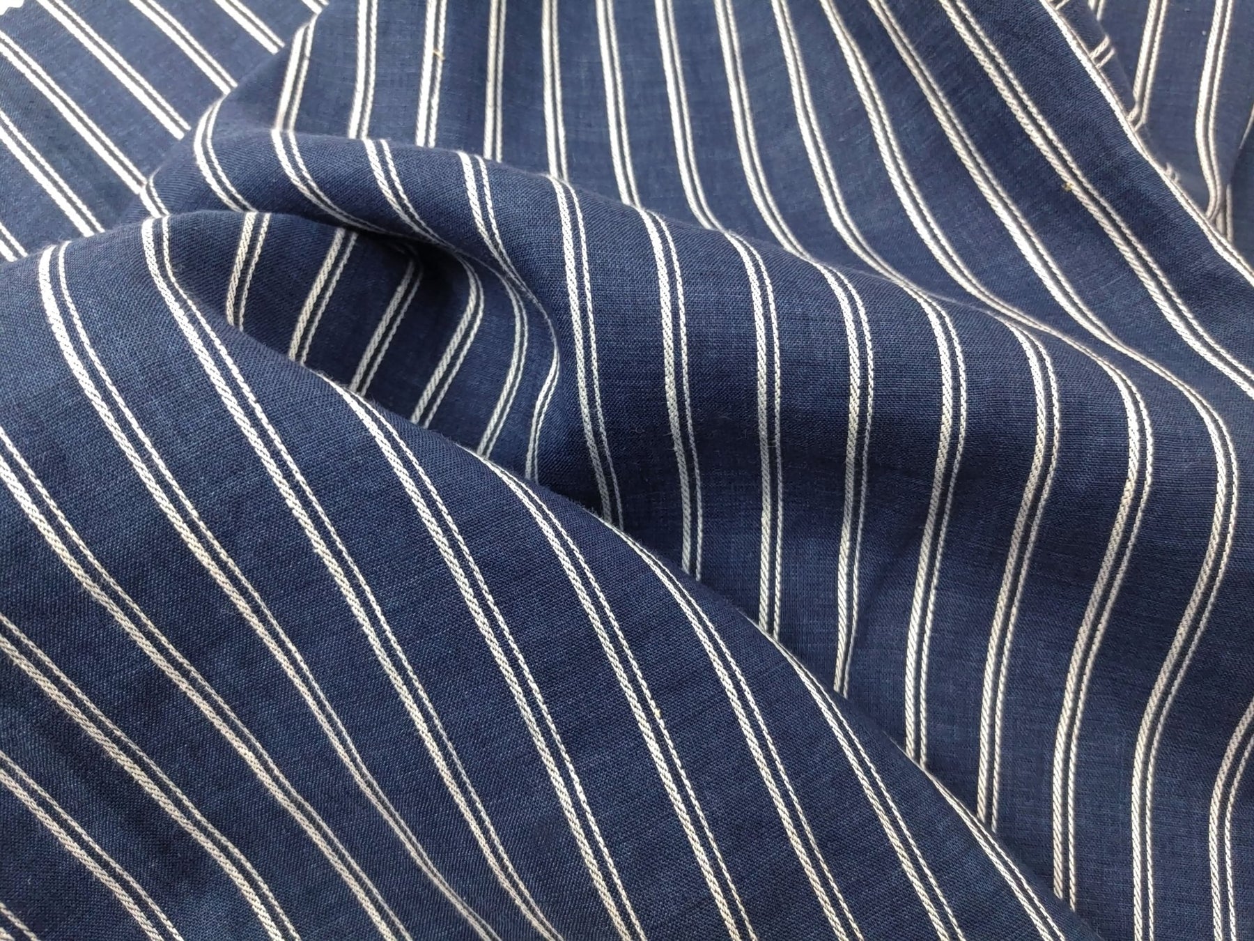 Experience the epitome of sophistication with our Dobby Stripe Elegance in 100% Linen Fabric. The navy base features a classic plain weaving structure, while the striking white stripe, crafted in twill, adds a touch of distinction. The fabric's composition of 100% linen ensures a lightweight to medium weight feel, perfect for a range of projects. Pre-washed for a soft touch, this fabric boasts a timeless charm and a lack of elasticity, making it an ideal choice for garments and crafts that prioritize both style and comfort.