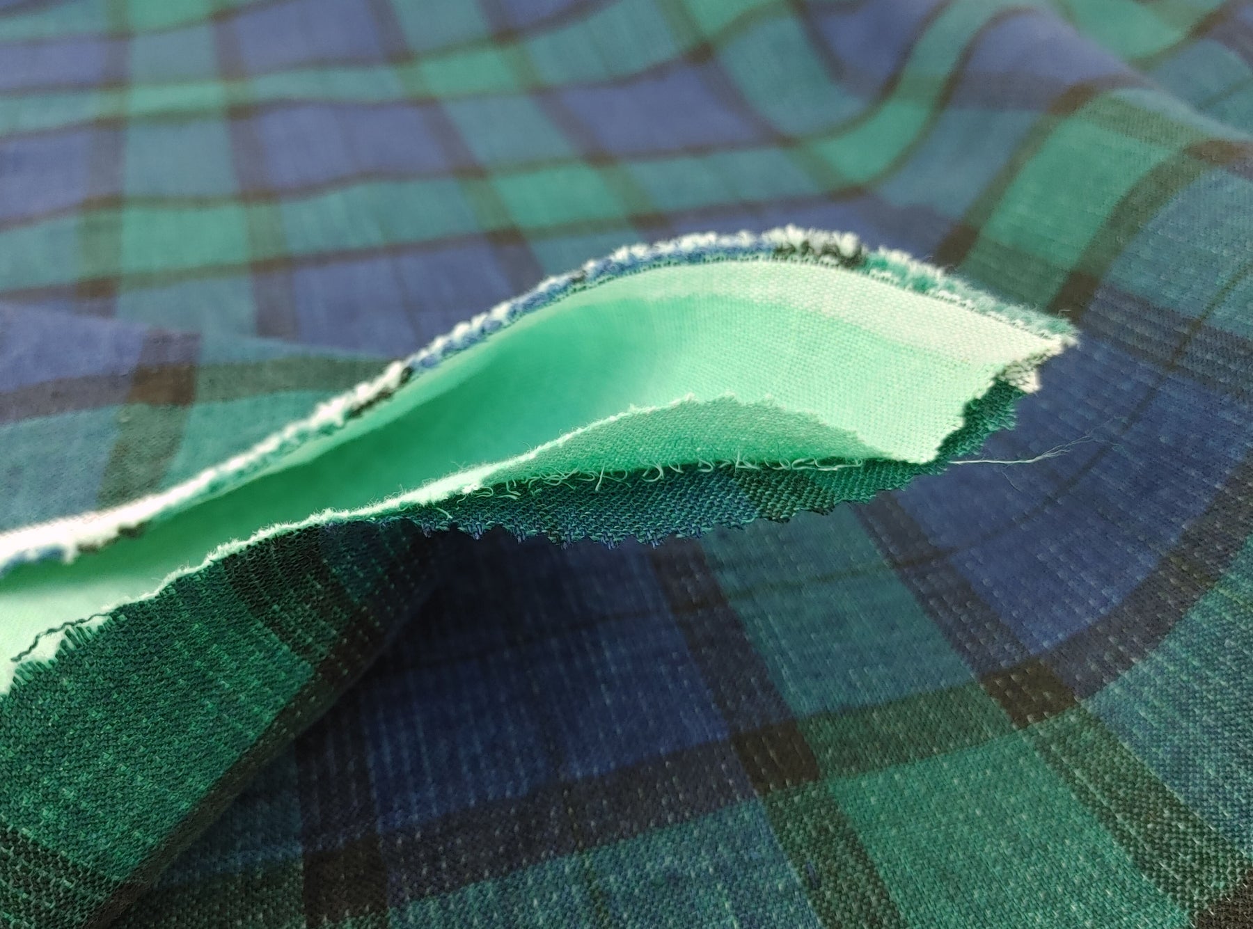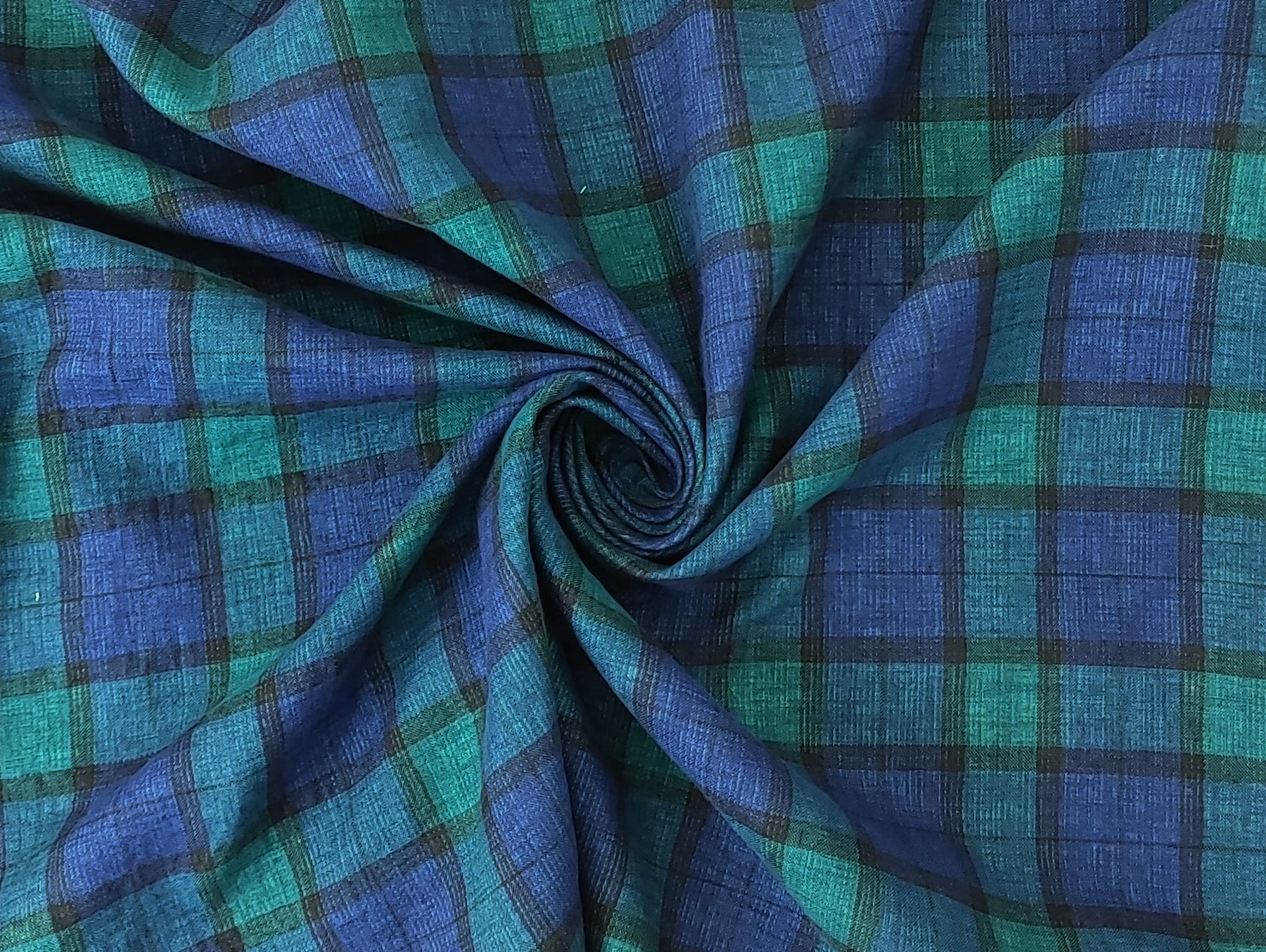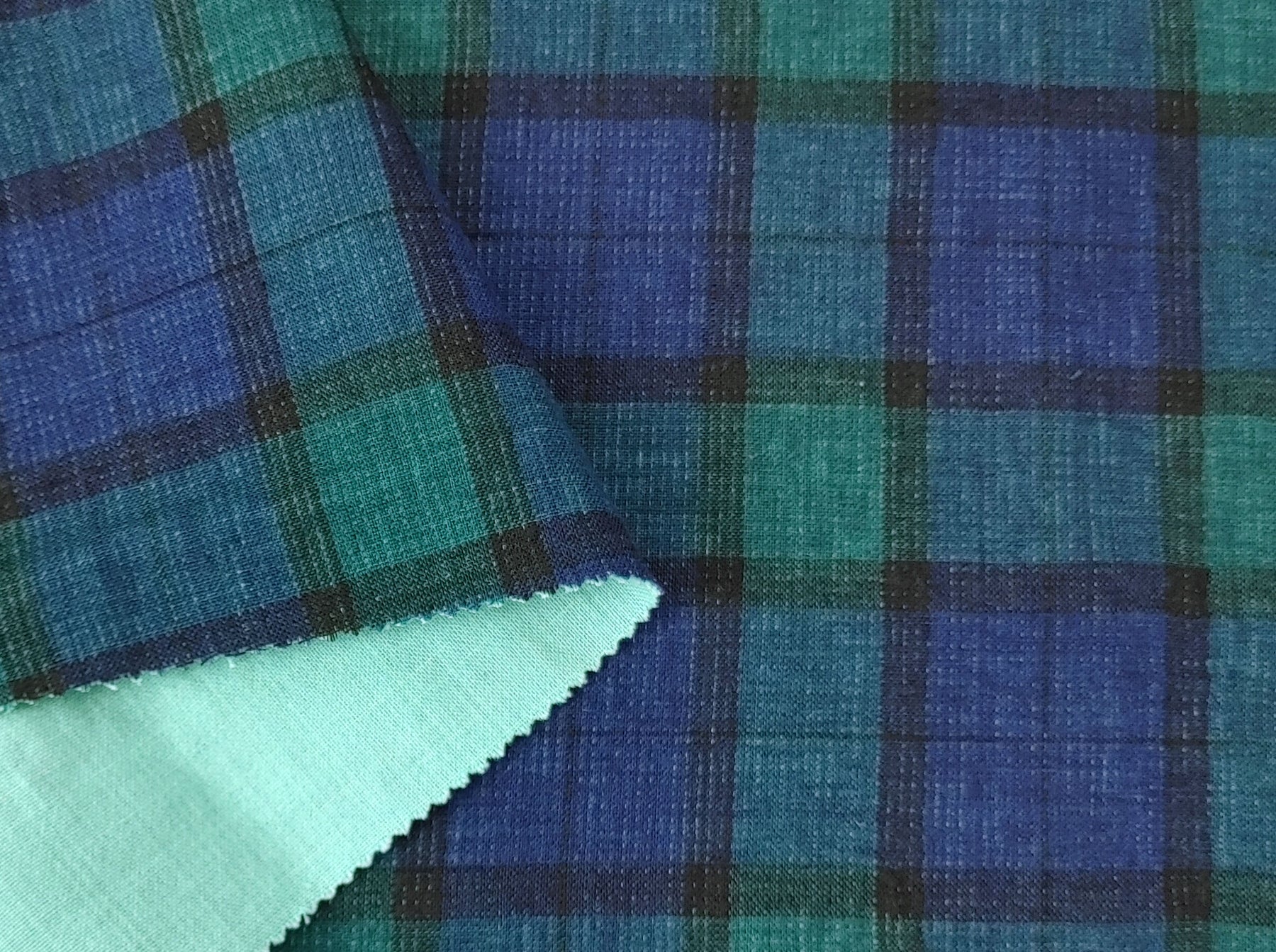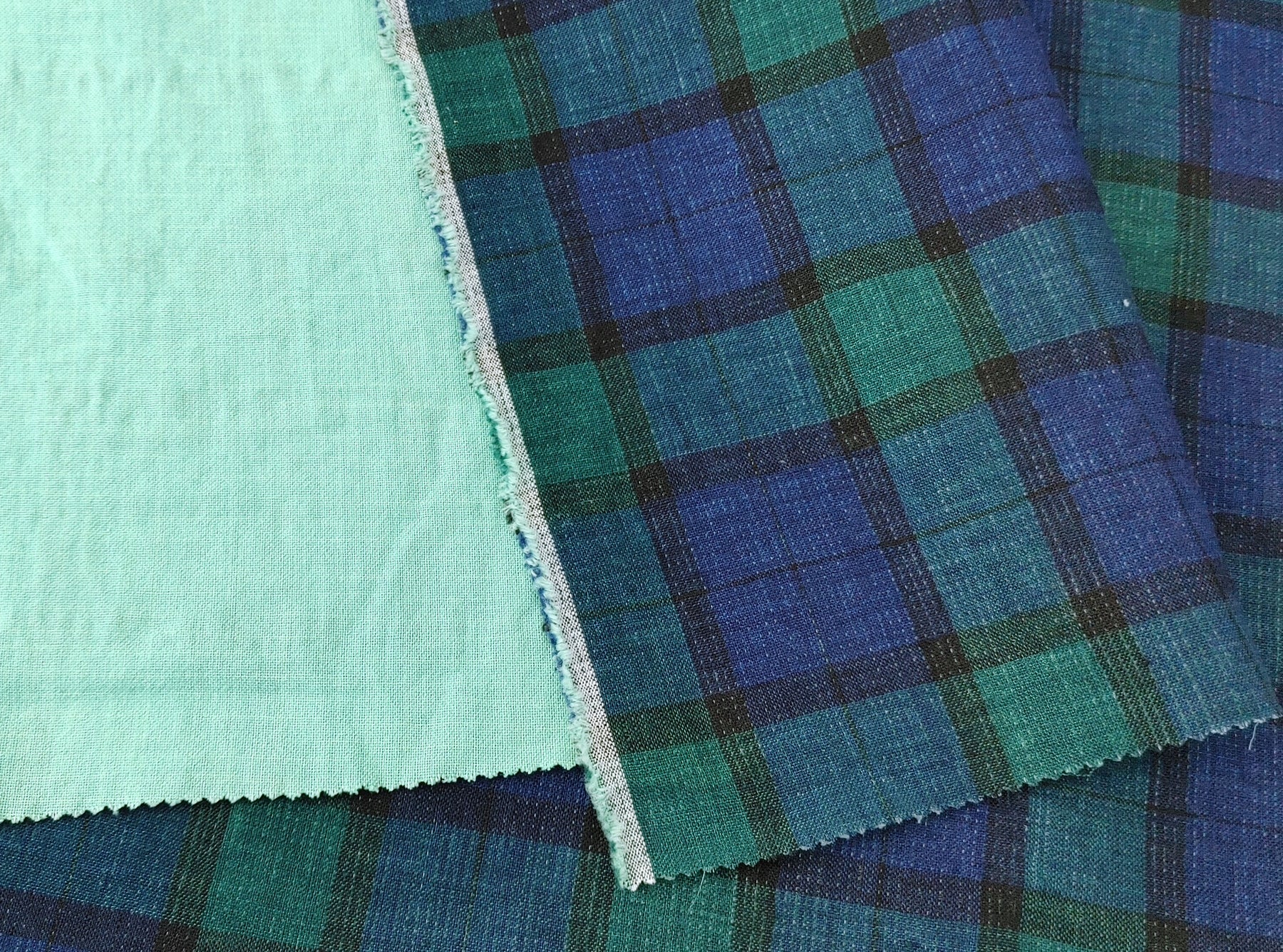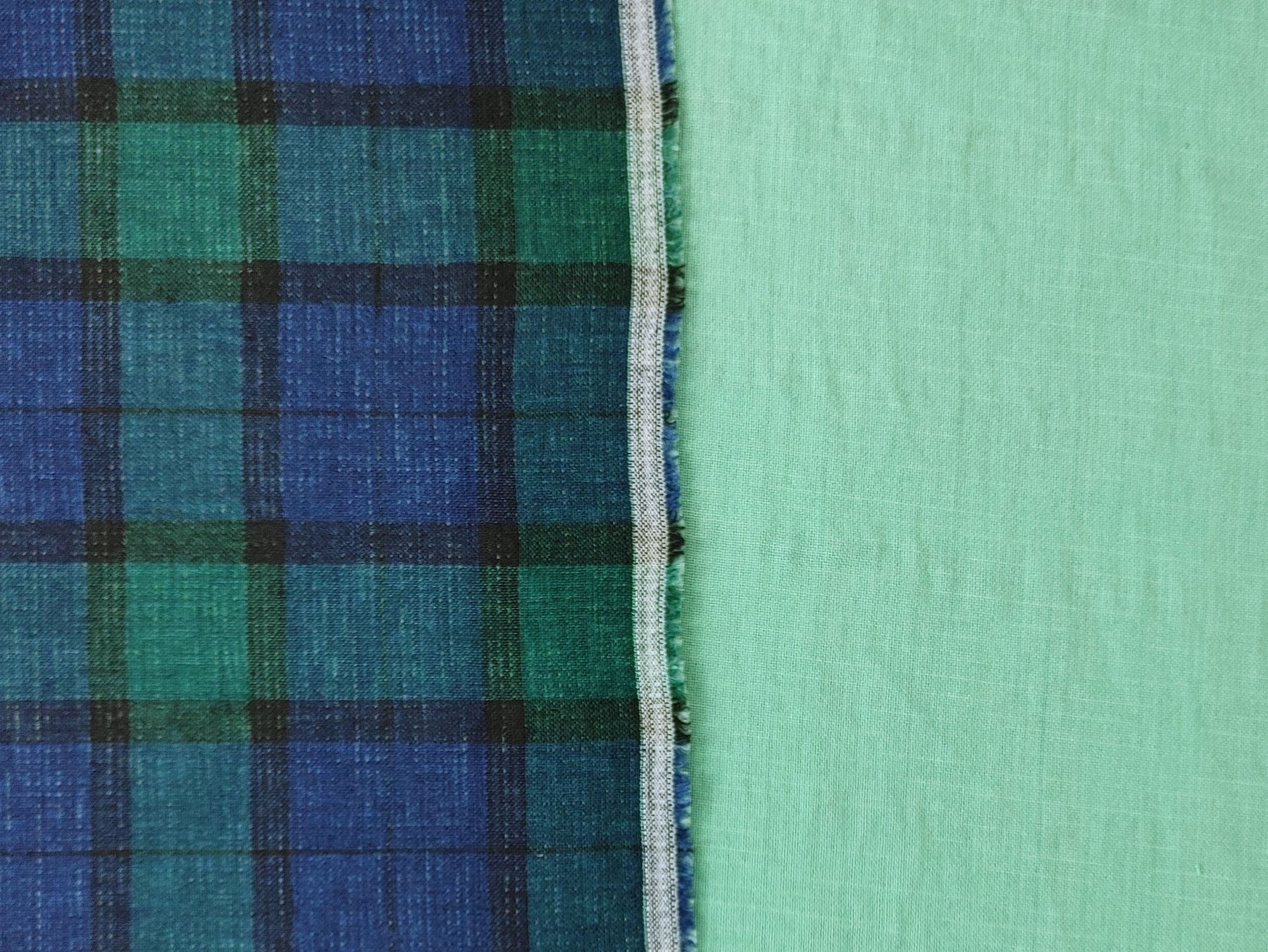Discover a one-of-a-kind fabric that combines timeless style with practical versatility. This double-faced fabric features a striking green plaid linen on the front, complemented by a soft light green linen-cotton blend on the reverse. Whether you’re crafting garments, home décor, or accessories, the reversible design offers endless creative possibilities.