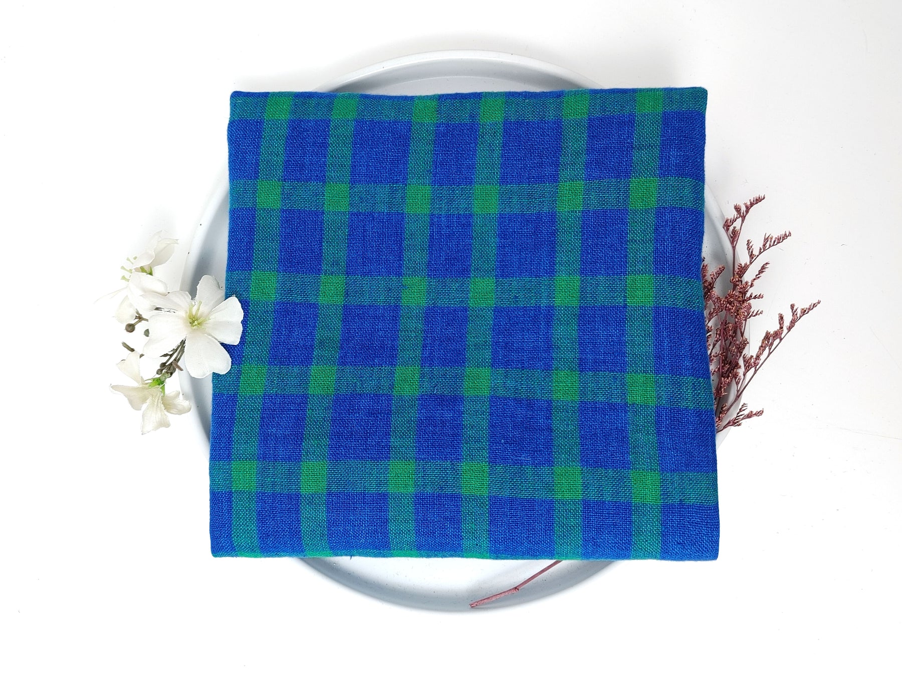 This 100% linen fabric features a unique variant of the classic gingham check, combining blue and green tones with a vintage-inspired delavé dyeing technique that creates a naturally faded, worn-in effect. Crafted from medium to slightly heavy linen yarn (9s), it offers both durability and a distinctive, rustic aesthetic. Pre-washed for added softness, this fabric has no elasticity, making it perfect for relaxed yet refined garments or home décor projects. Its subtle faded color and natural texture bring a touch of timeless character to any creative endeavor.