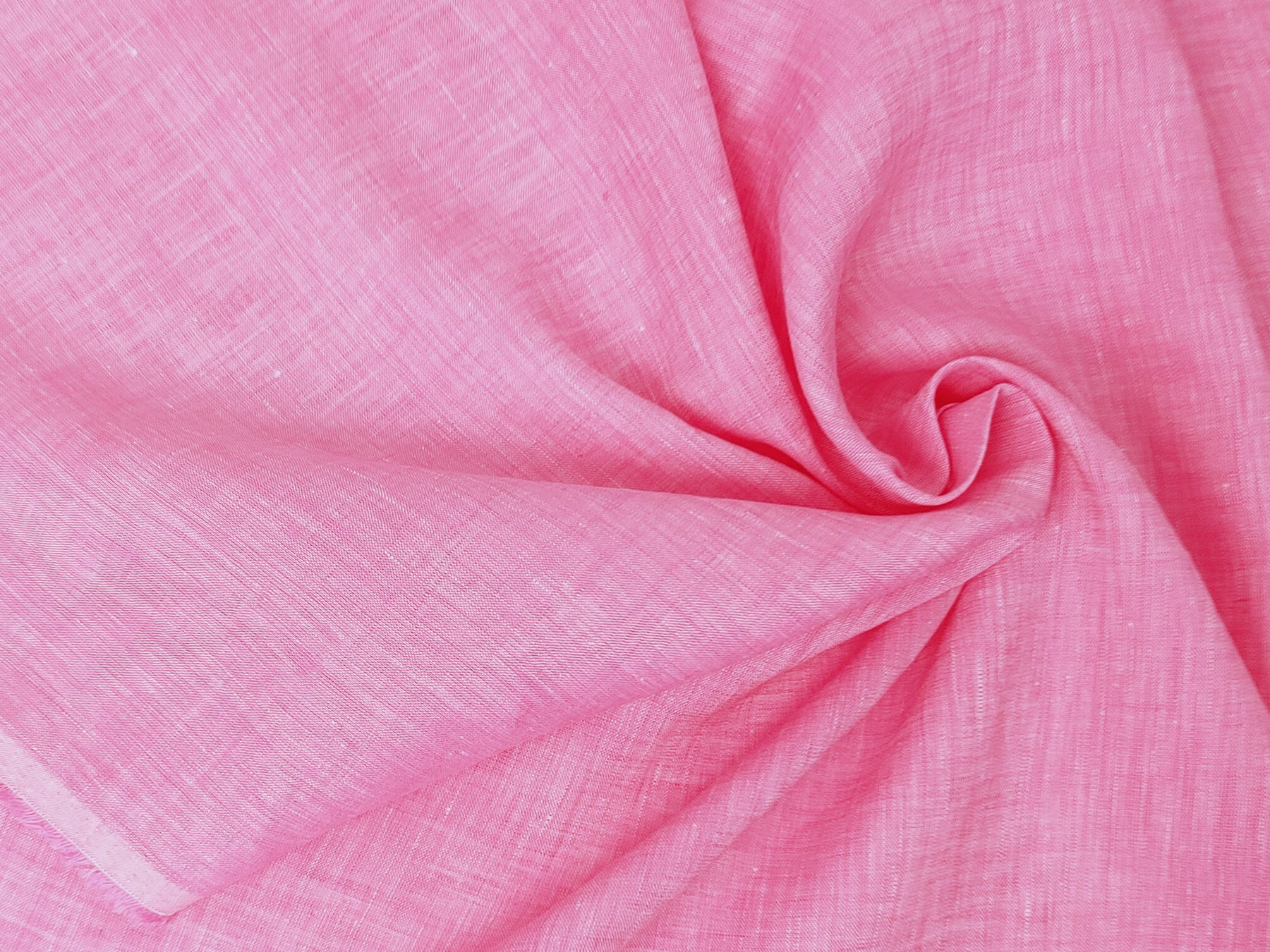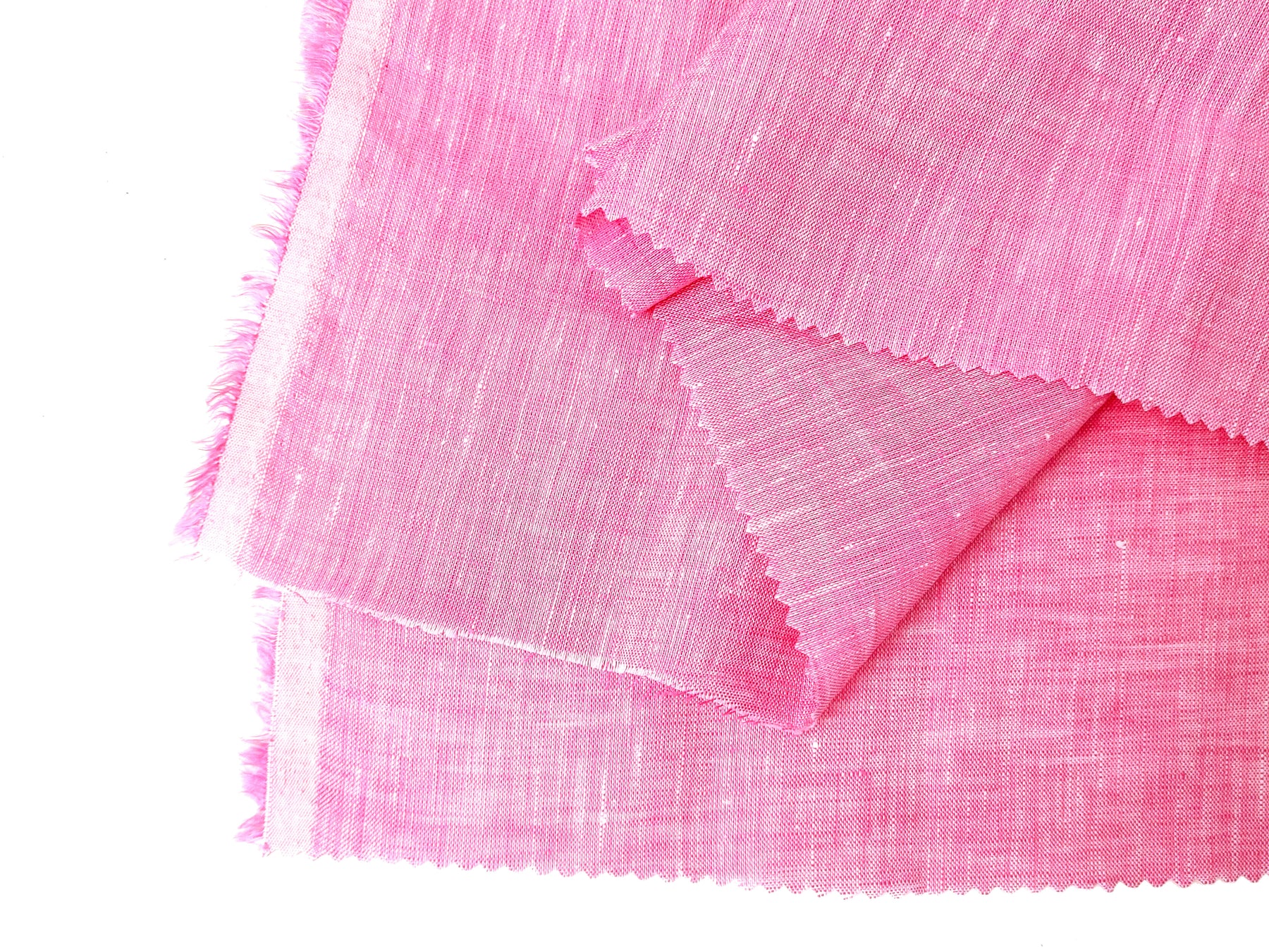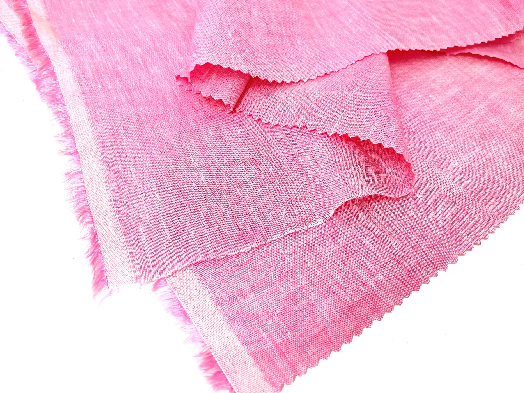 This 100% Linen Chambray Fabric in a delicate pink hue is crafted from fine 21s linen yarn, offering a soft, natural texture perfect for a variety of sewing projects. The fabric features a unique chambray weave, with a white warp and a pink weft, giving it a subtle depth of color and texture.