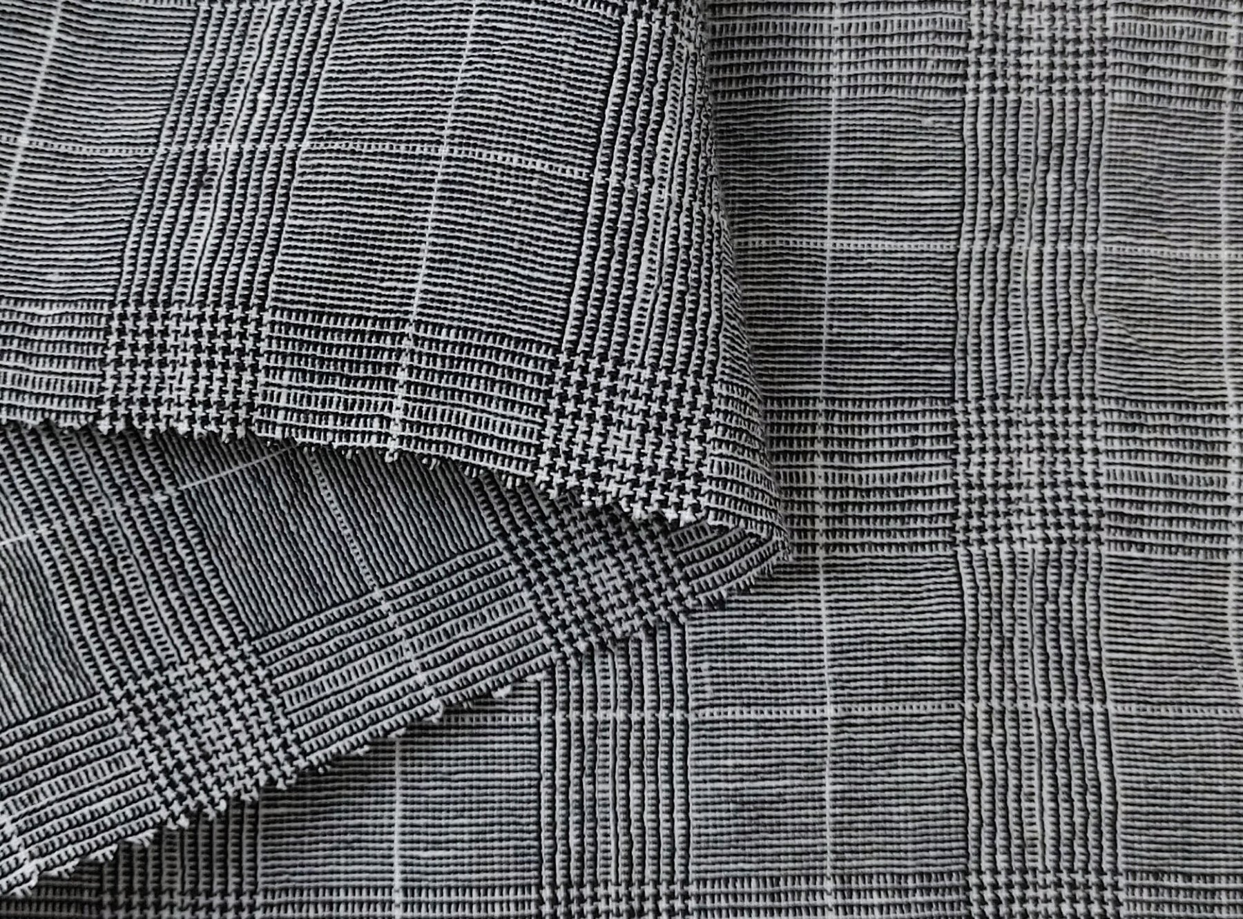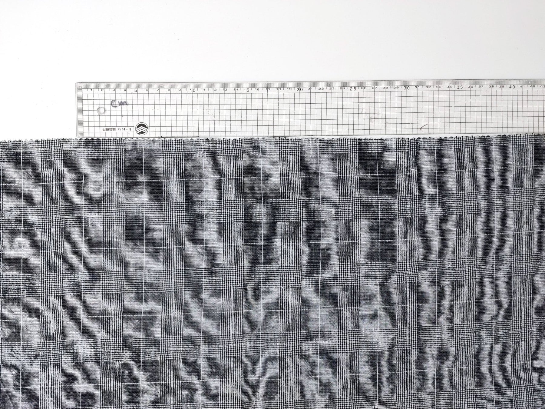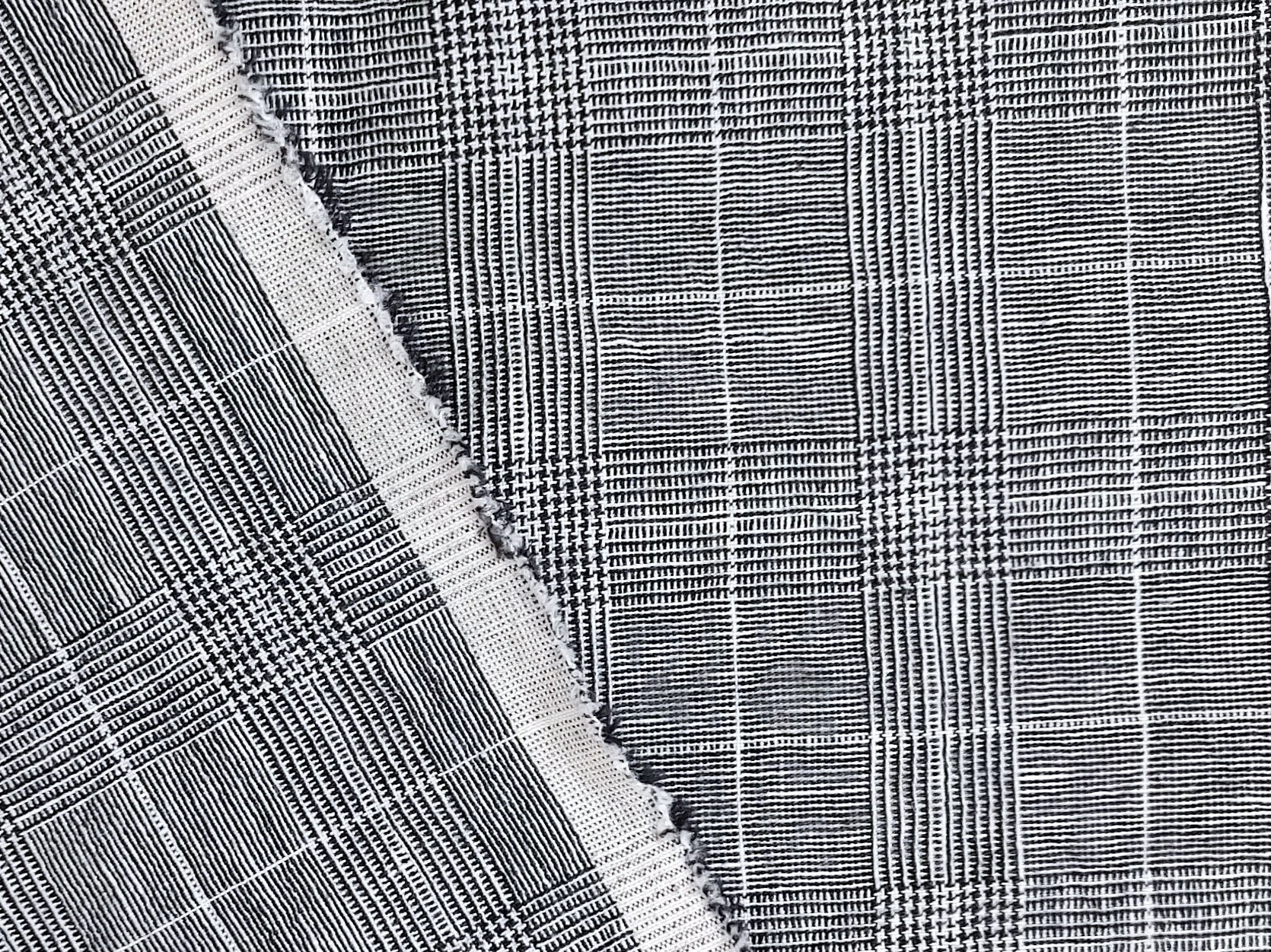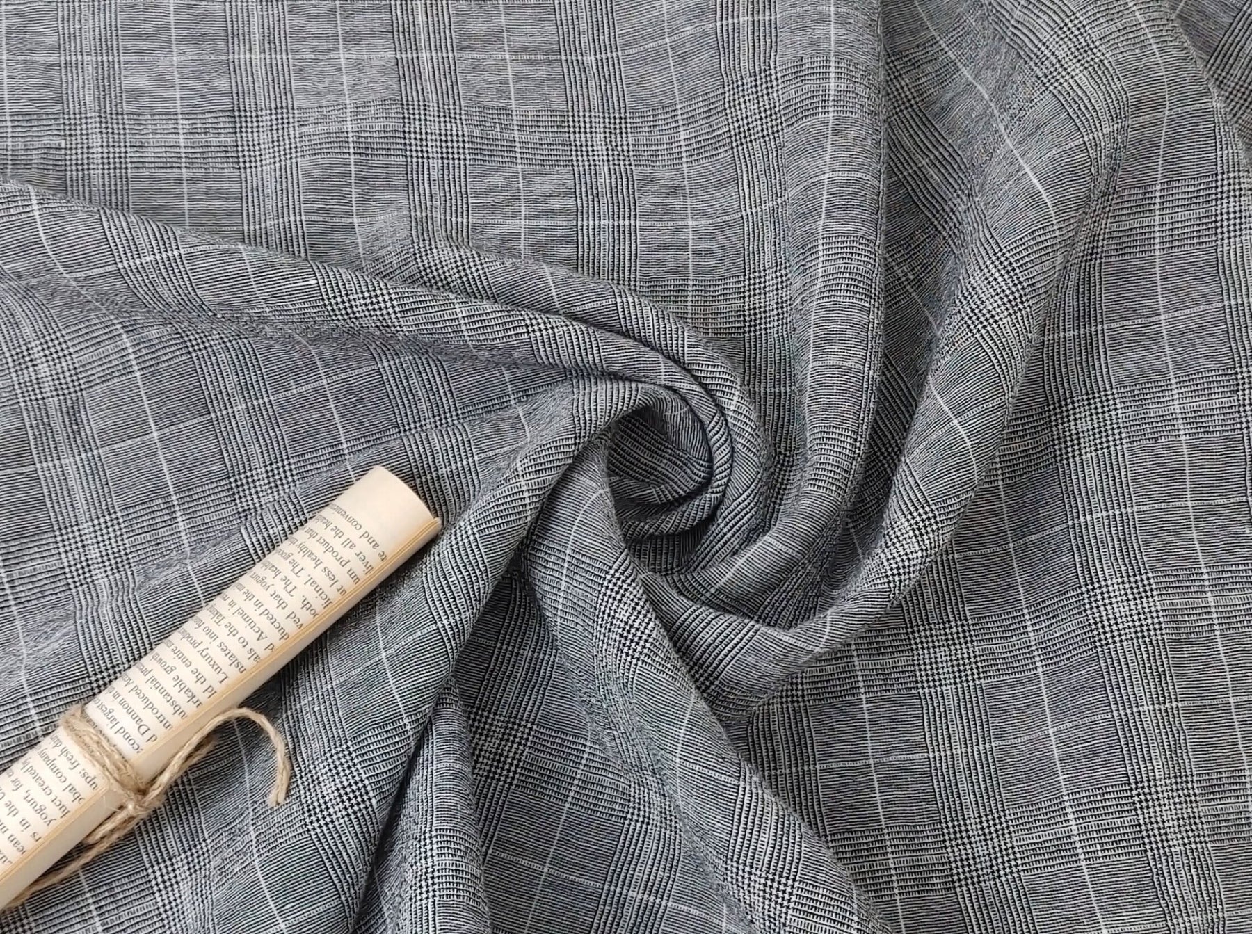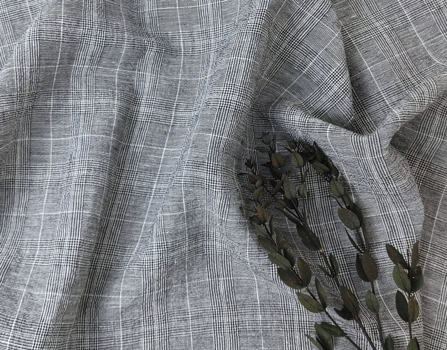 Experience understated elegance with our "Linen Ramie Rayon Glen Plaid Fabric." This fabric features a classic glen plaid pattern in a simple palette of white and black color yarns. The blend of ramie yarn and rayon filament yarn is tightly twisted, creating a cool and crisp handfeel.